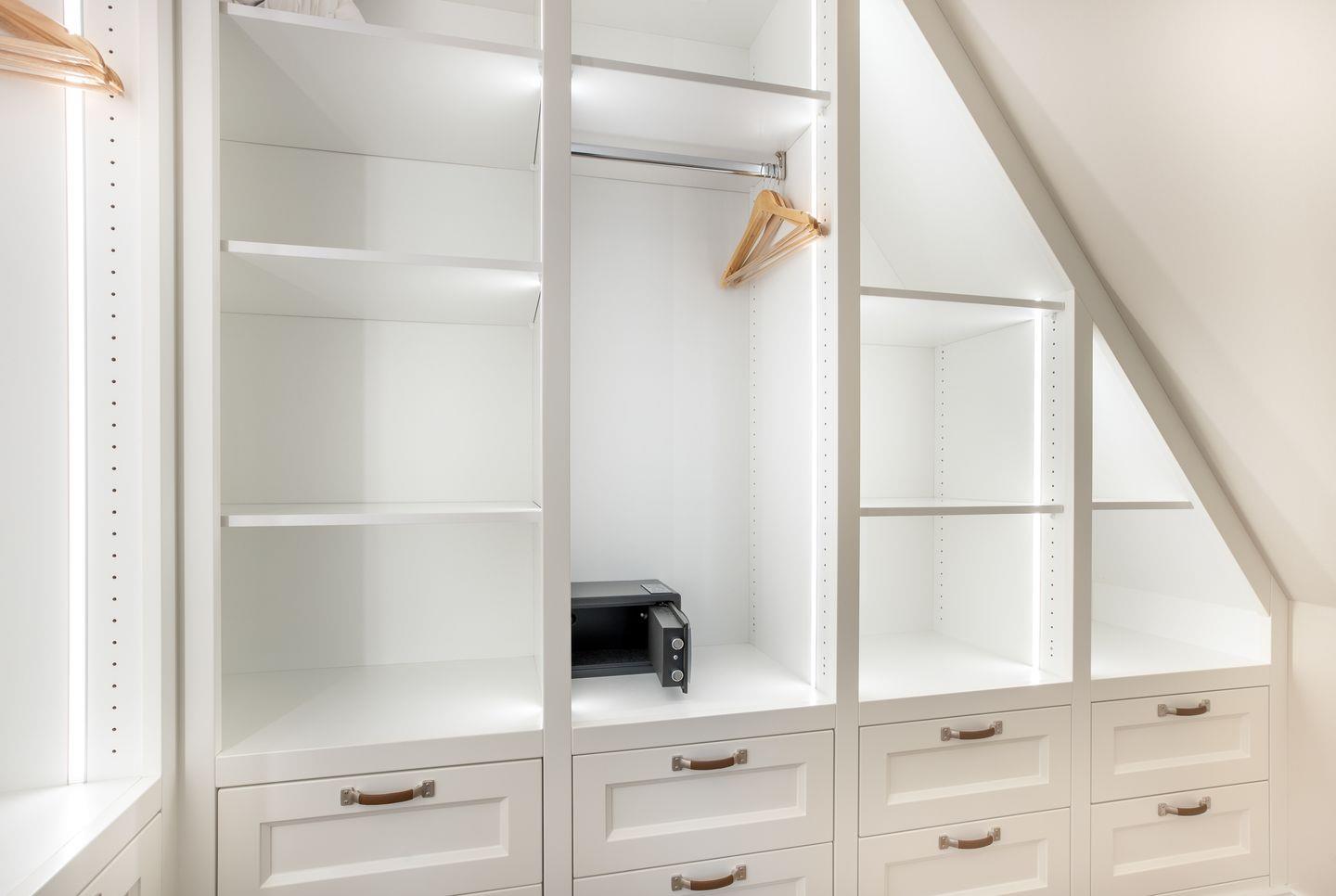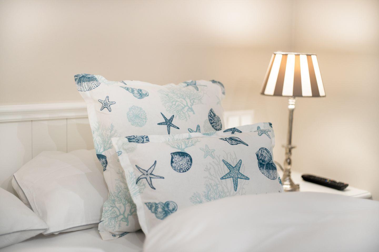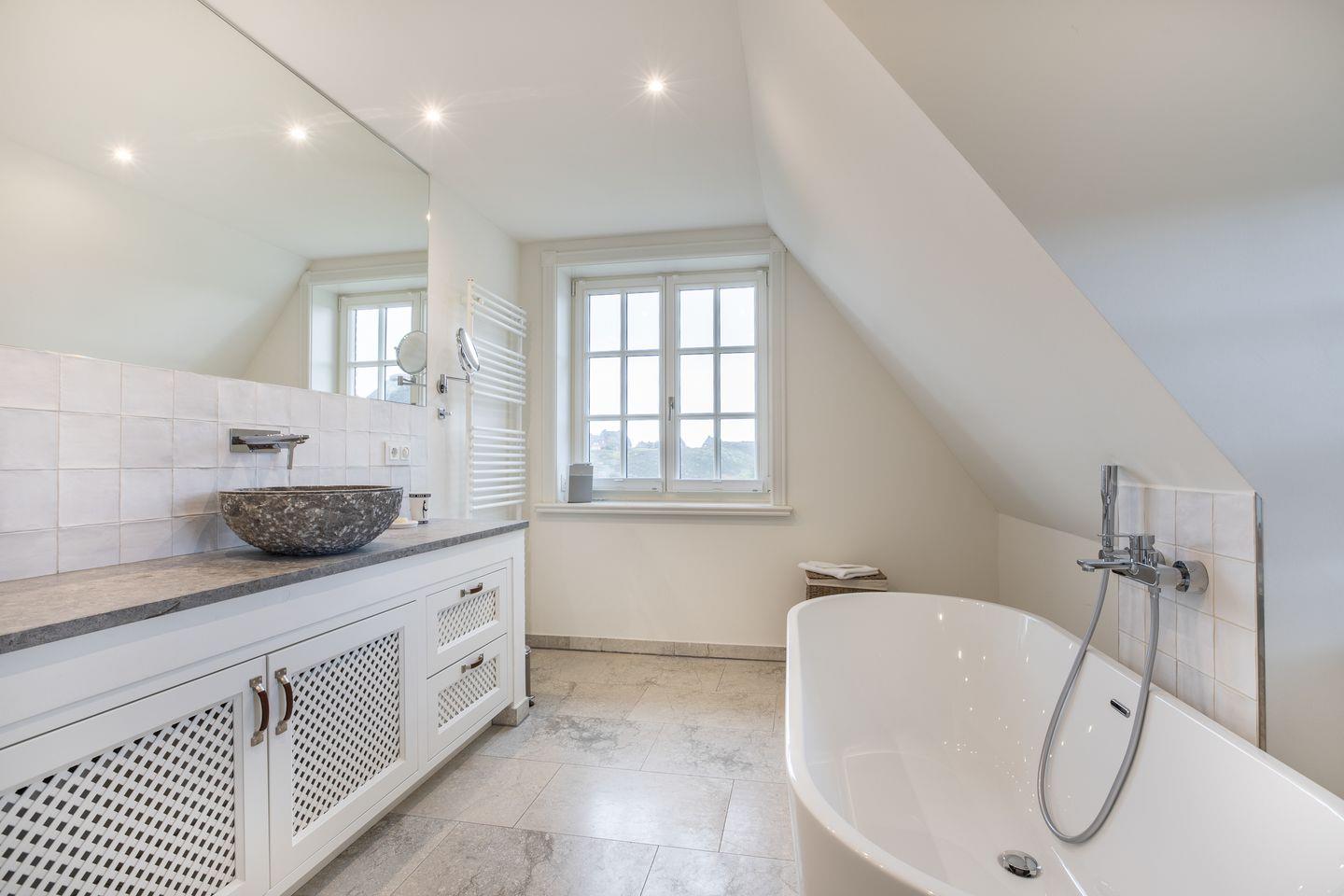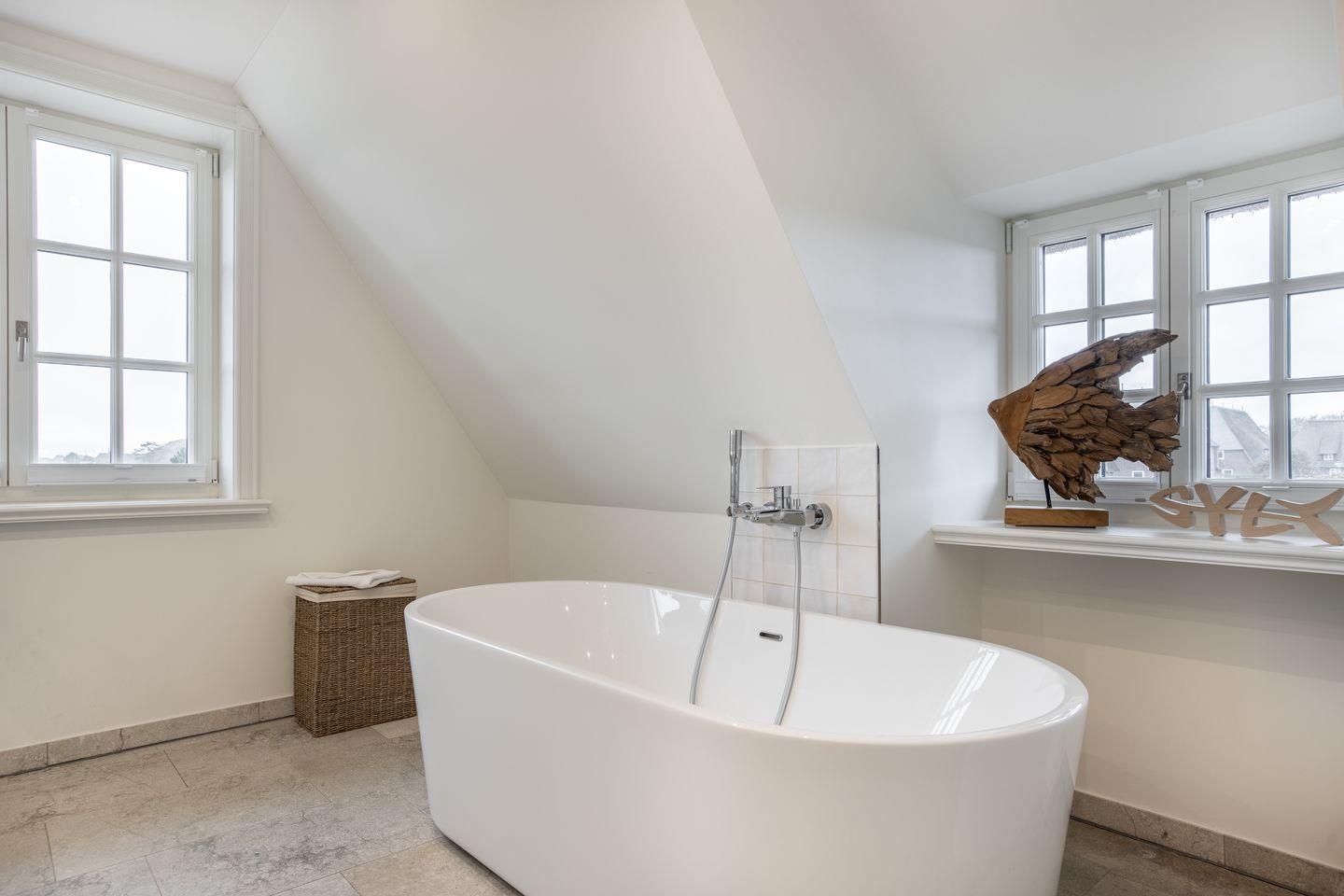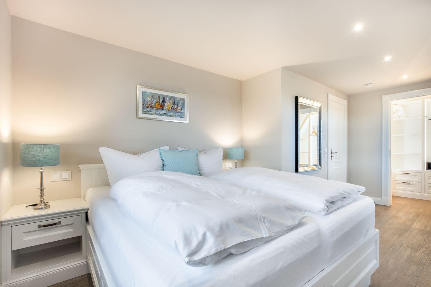 Im Obergeschoss befindet sich ein lichtdurchflutetes Schlafzimmer mit Doppelbett und Tempur Matratzen, begehbarem Kleiderschrank, Flatscreen-TV, Bose Sound System. Von dort können Sie einen Blick aufs Meer genießen. Im Bad erwartet Sie eine freistehende Badewanne und Dusche sowie ein separates WC.