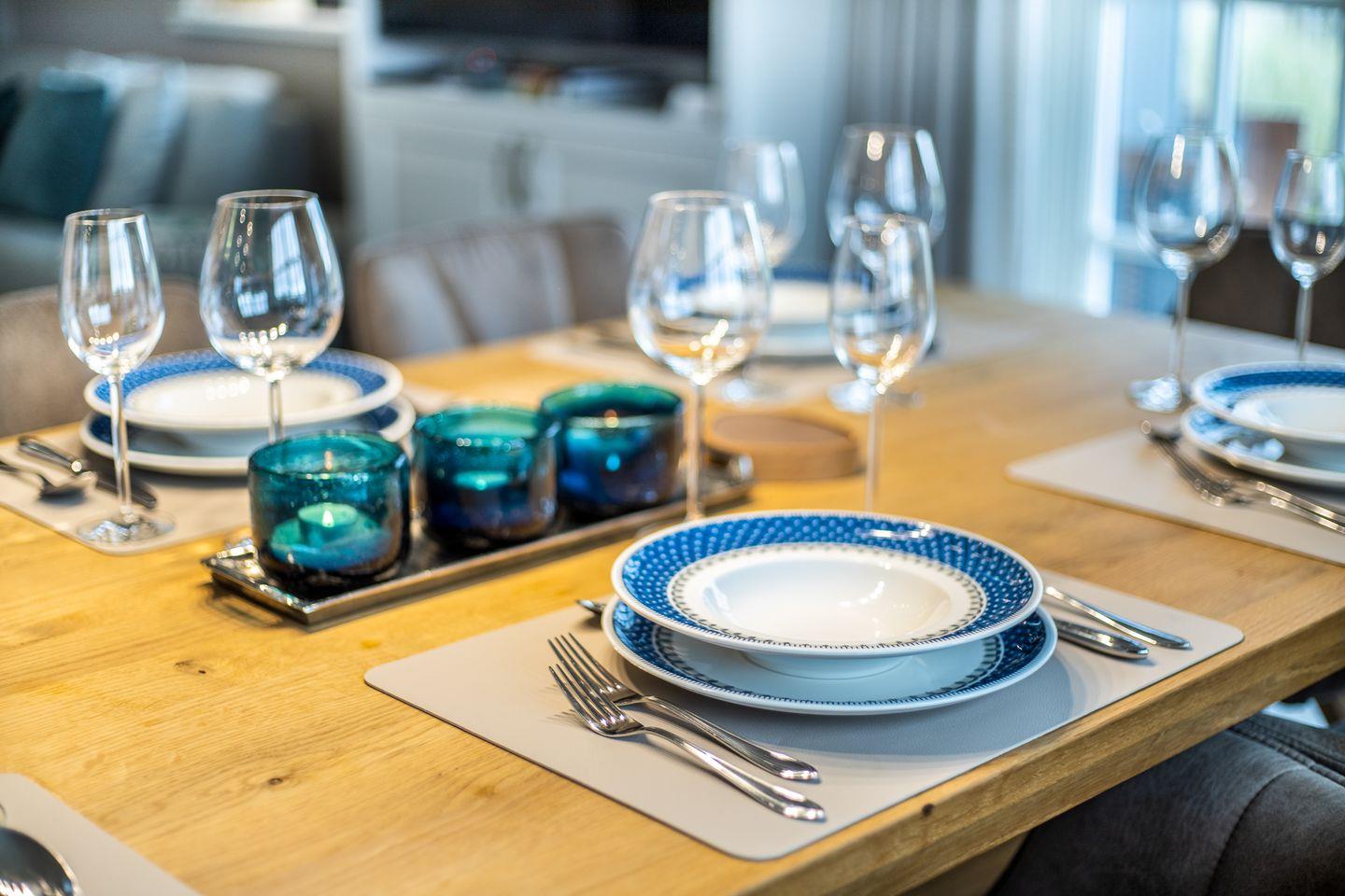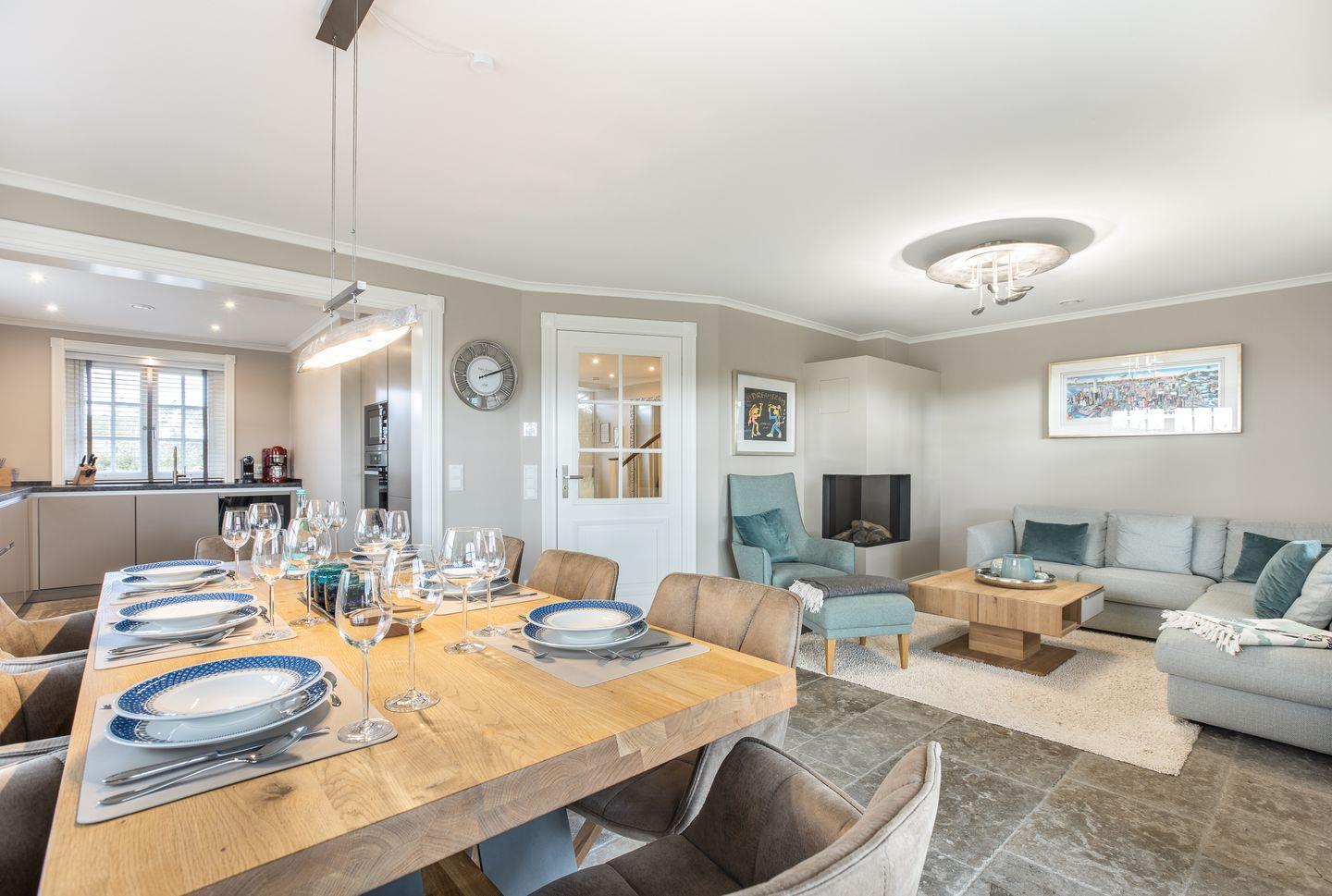 Das Erdgeschoss empfängt Sie mit einem großen Wohn- und Essbereich mit großzügigem Ecksofa mit Blick auf den Kamin. Die großzügigen Terrassentüren im Essbereich bieten Ihnen eine gute Sicht auf die wunderschöne Natur. Durch die Toplage werden Sie auf der Terrasse den ganzen Tag von der Sonne verwöhnt. Die perfekt ausgestattete offene Küche lässt für ein perfektes Dinner keine Wünsche offen. Im Erdgeschoss finden Sie außerdem einen großen Eingangsbereich mit viel Stauraum und ein Gäste-WC.
