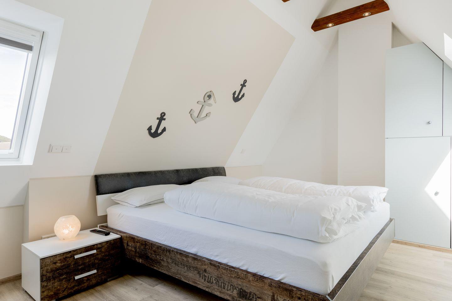 Im Appartement "Min to Hus" erwartet Sie eine vollständig ausgestattete Küchenzeile und ein offenes Wohnzimmer mit gemütlicher Sofaecke und Flatscreen-TV. Von hier aus erreichen Sie Ihre persönliche Dachterrasse, die von April bis September möbliert ist und noch bis in die späten Abendstunden Sonnenschein bietet. Das Tageslichtbad des Appartements ist modern eingerichtet und verfügt über eine Regendusche und ein WC. Auf gleicher Ebene der Ferienwohnung finden Sie ein Schlafzimmer mit einem Einzelbett (90x200) cm und einem ausziehbarem Bett (90x190 cm), das sich perfekt für einen Erwachsenen oder zwei Kinder eignet. Im Dachgeschoss des Hauses finden Sie einen weiteren Raum mit Doppelbett (180 x 200cm) und viel Stauraum in verschiedenen Einbauschränken.