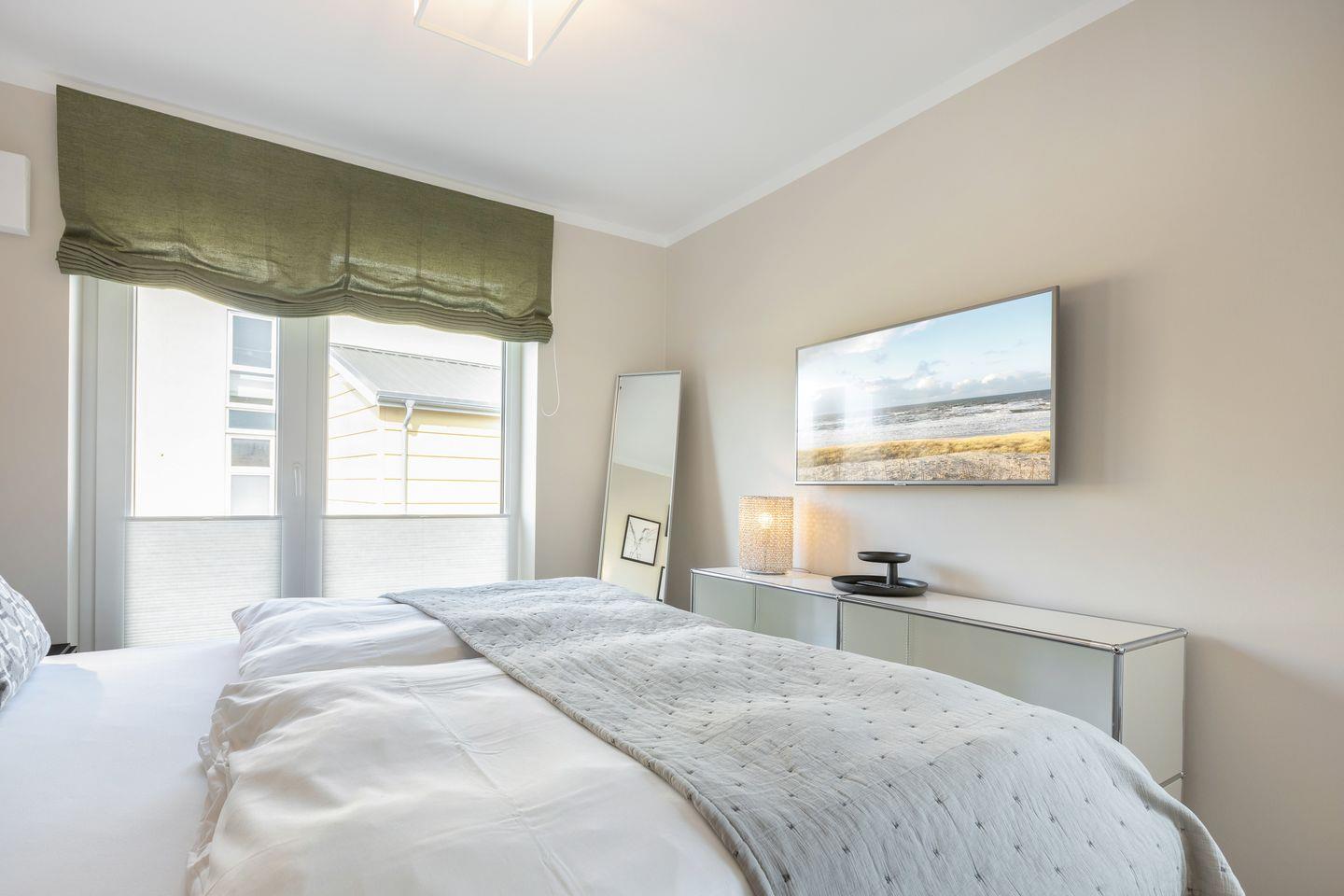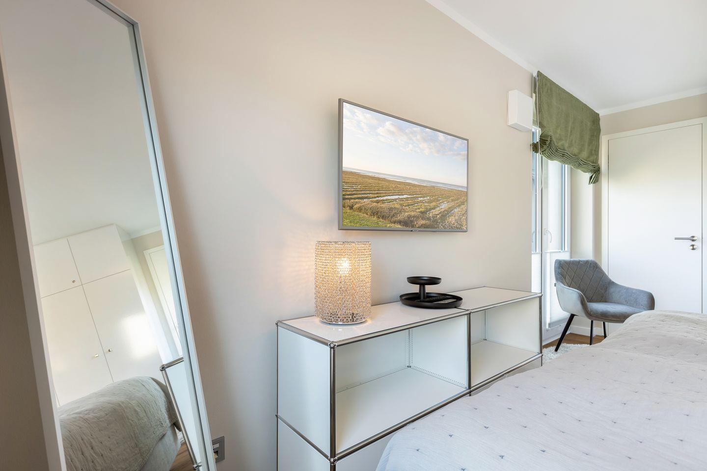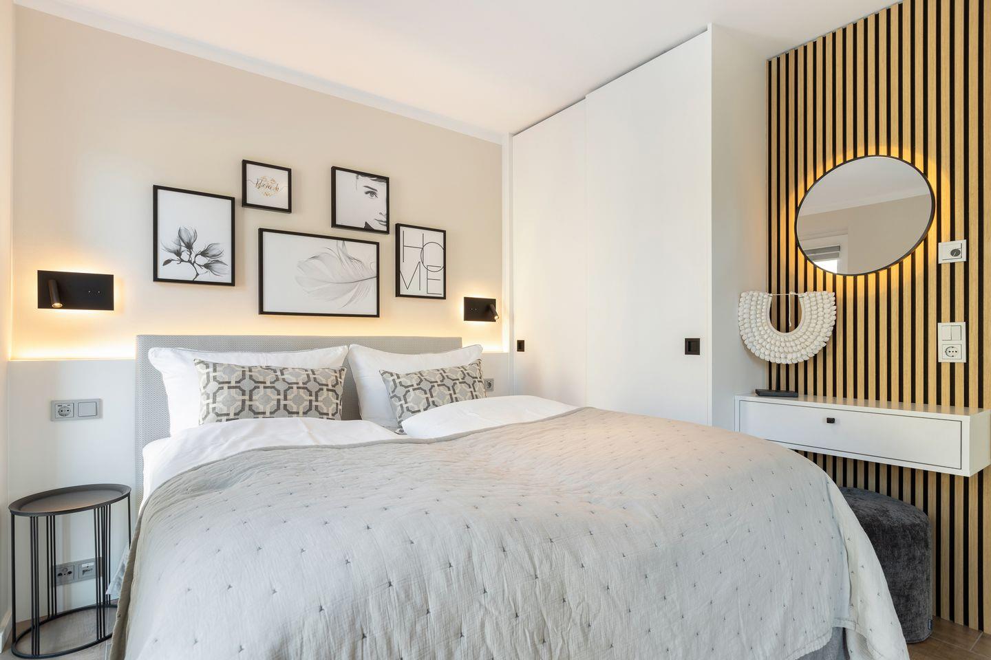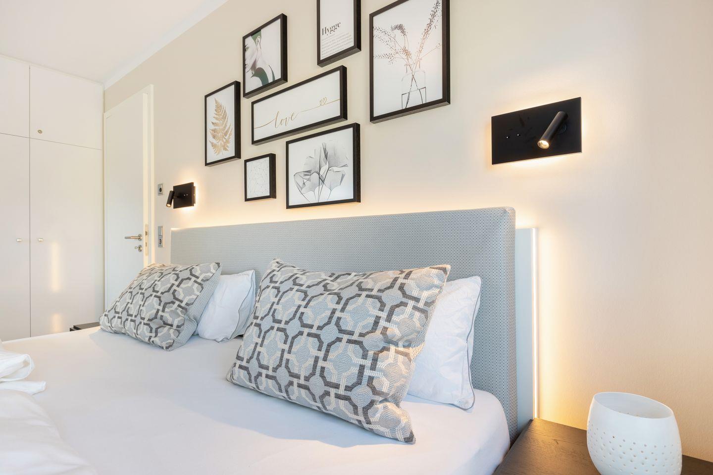 1 Schlafzimmer mit Boxspring-Doppelbett (200x200cm) und Flatscreen-TV, ein Schlafzimmer mit Boxspring-Doppelbett (160 x 200 cm), zwei Duschbäder. Die Wohnung verfügt über zwei Balkone, mit Gartenmöbeln aus Aluminium. In Haus befindet sich ein Fahrstuhl.