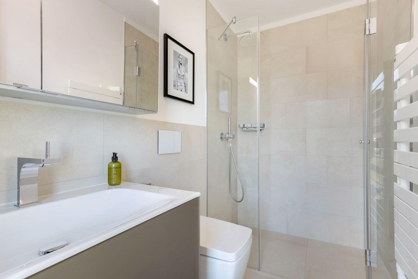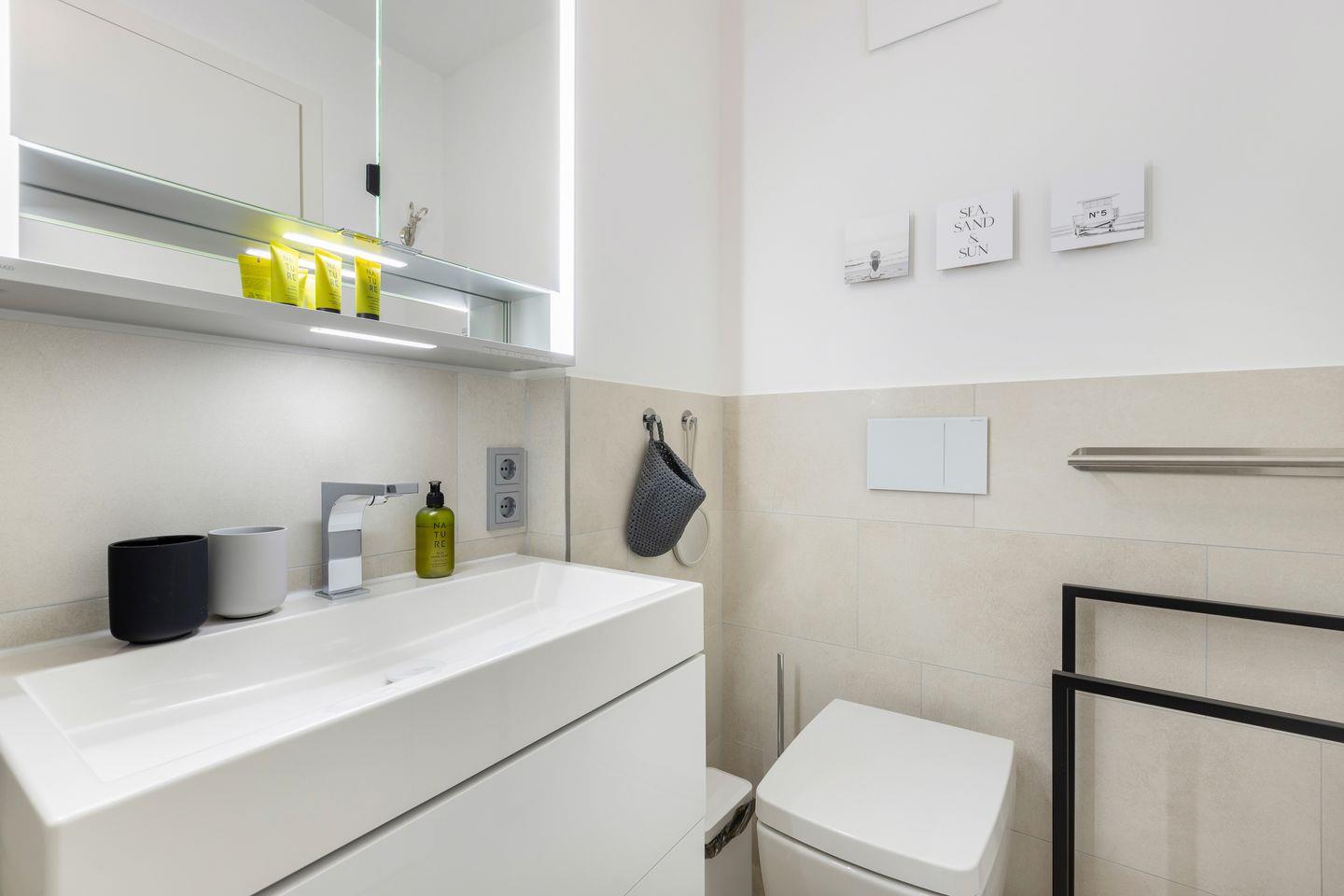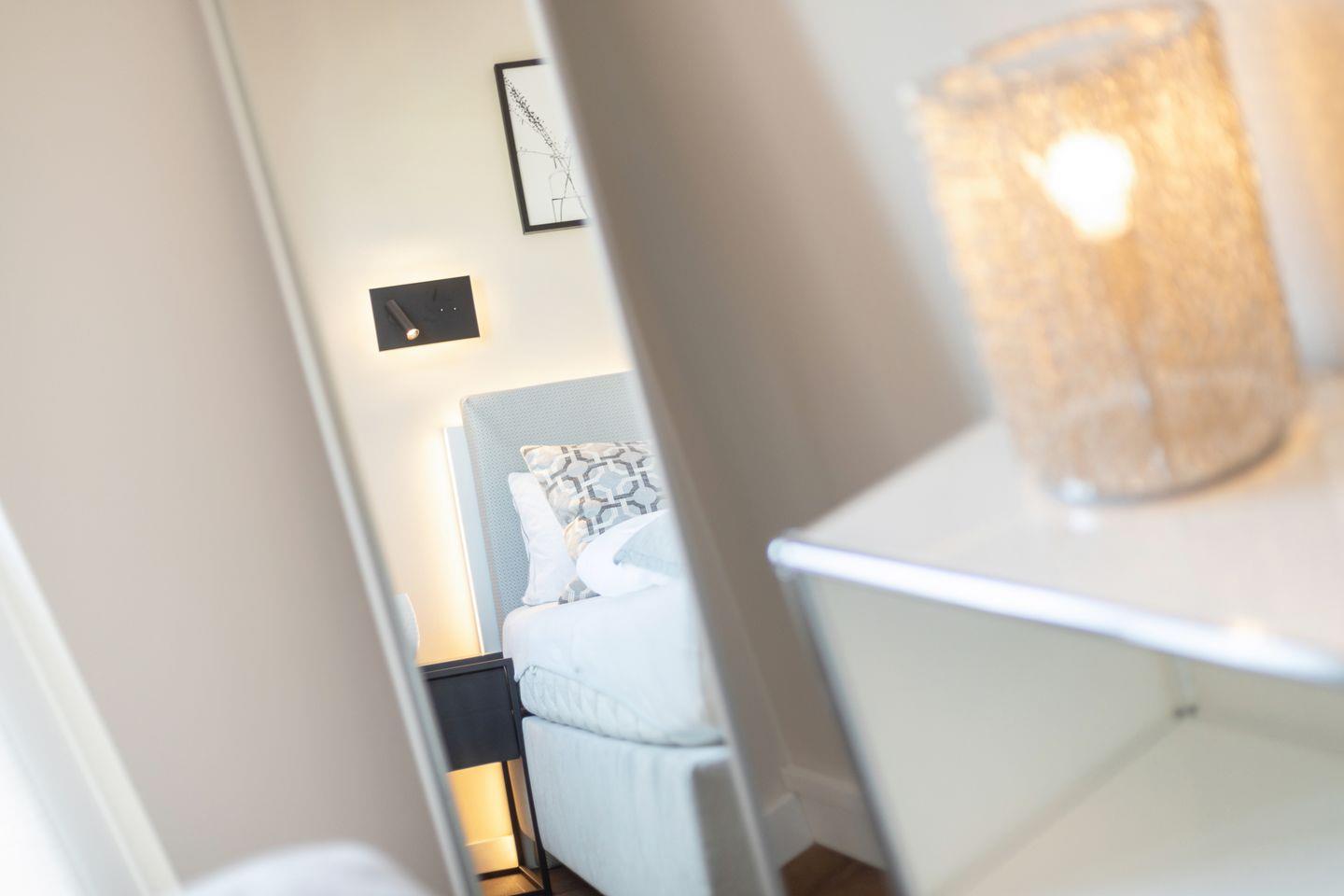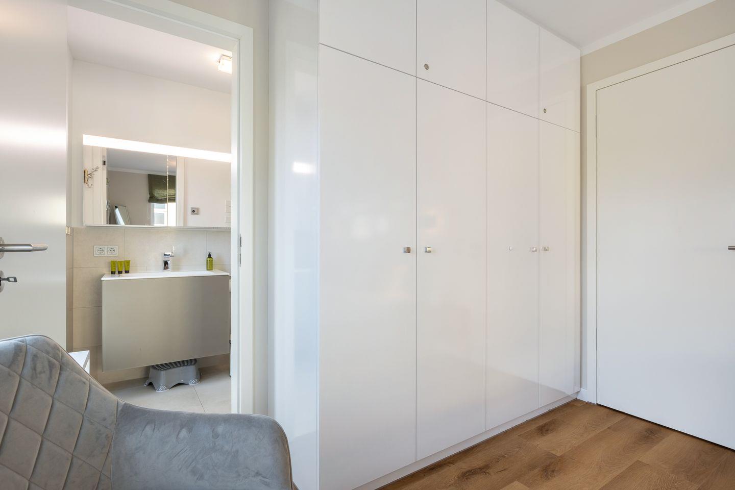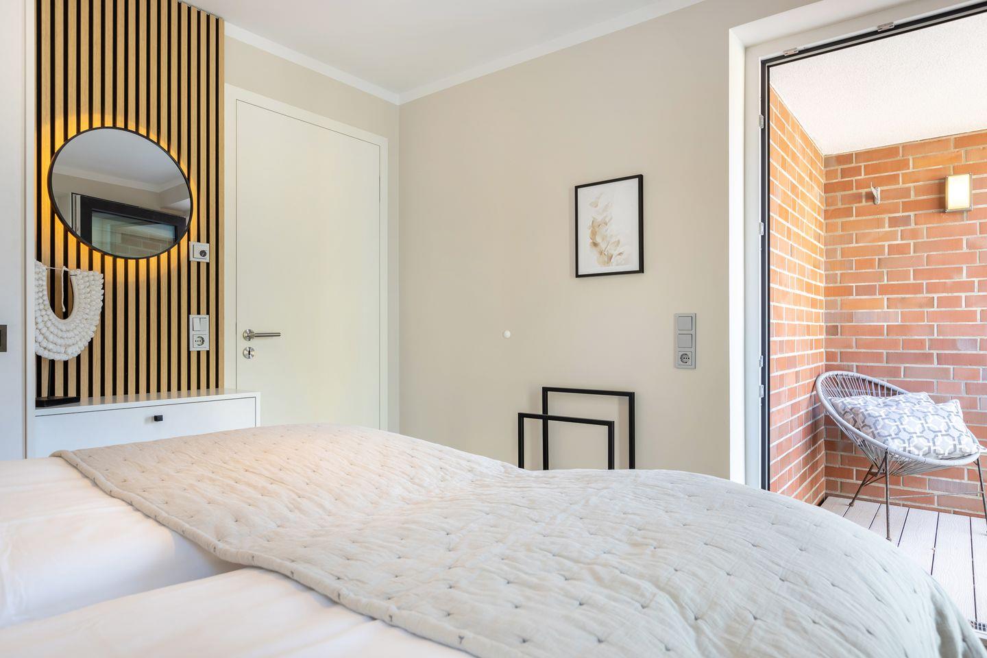 1 Schlafzimmer mit Boxspring-Doppelbett (200x200cm) und Flatscreen-TV, ein Schlafzimmer mit Boxspring-Doppelbett (160 x 200 cm), zwei Duschbäder. Die Wohnung verfügt über zwei Balkone, mit Gartenmöbeln aus Aluminium. In Haus befindet sich ein Fahrstuhl.