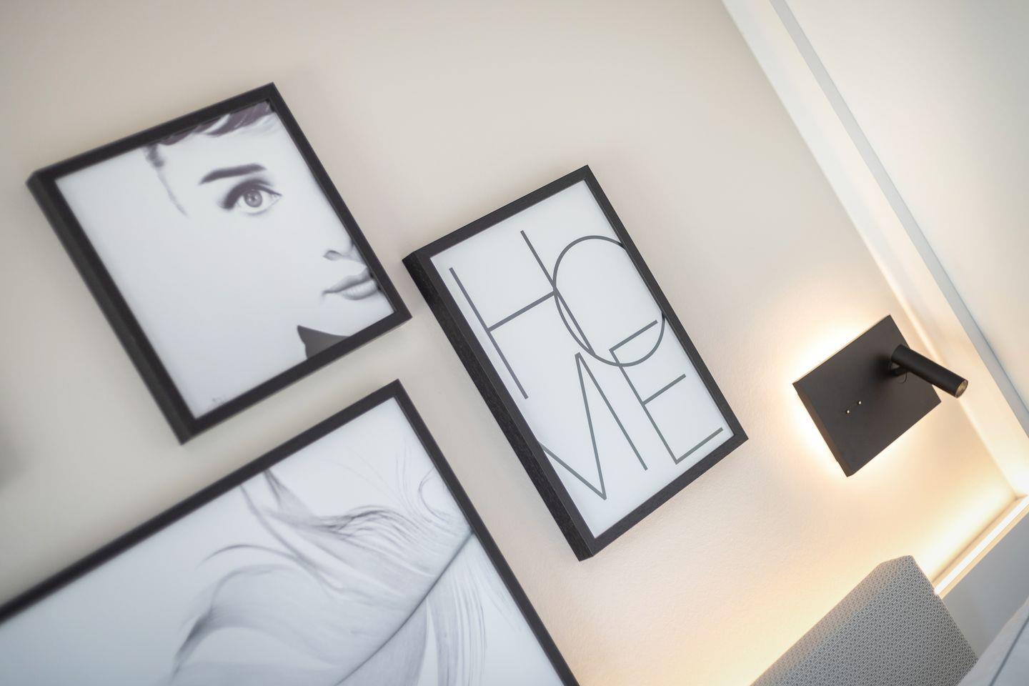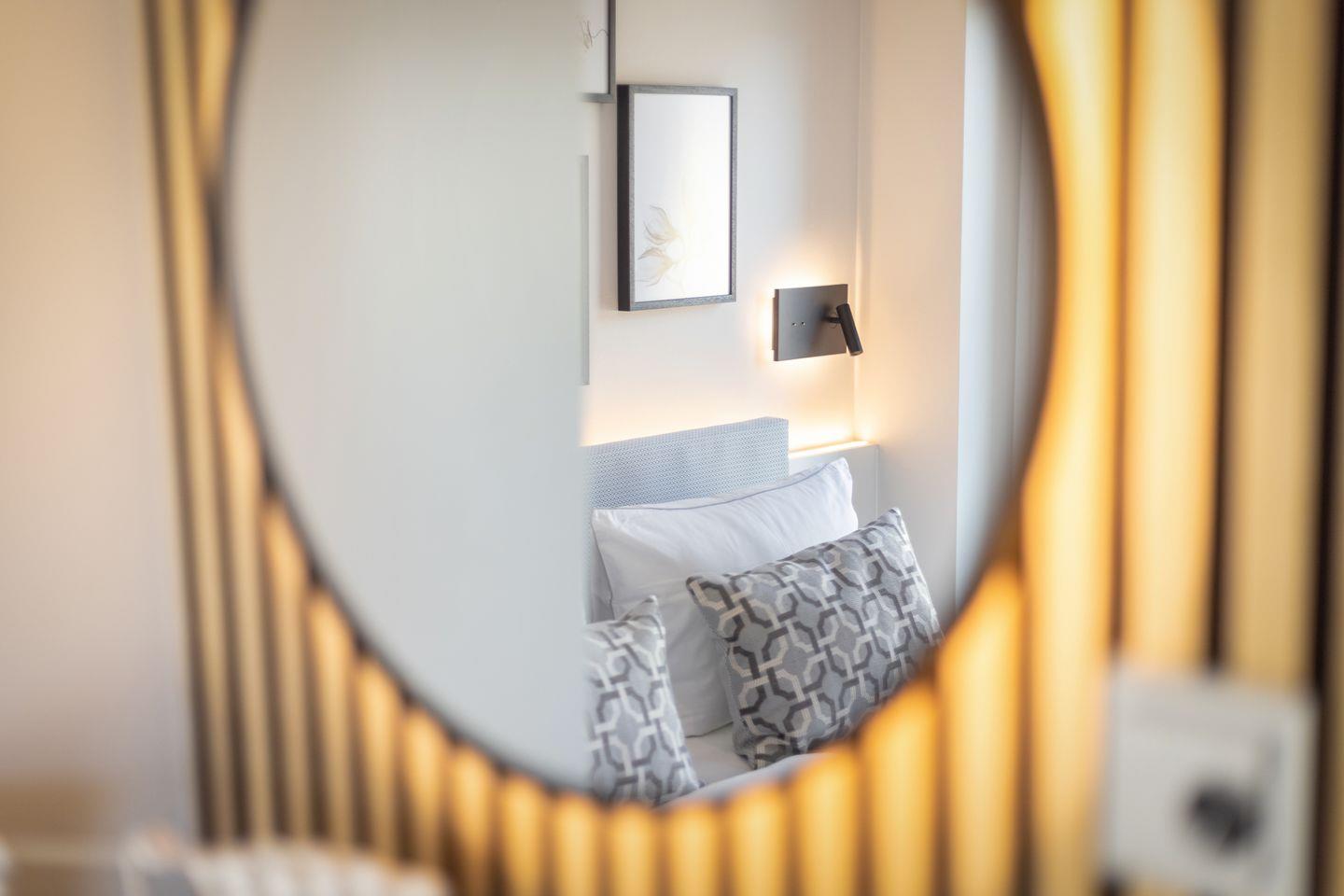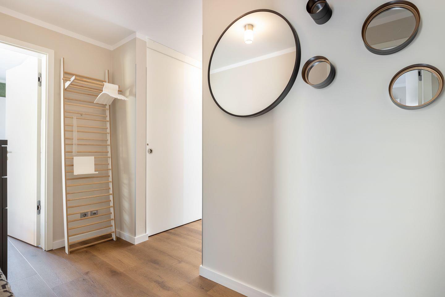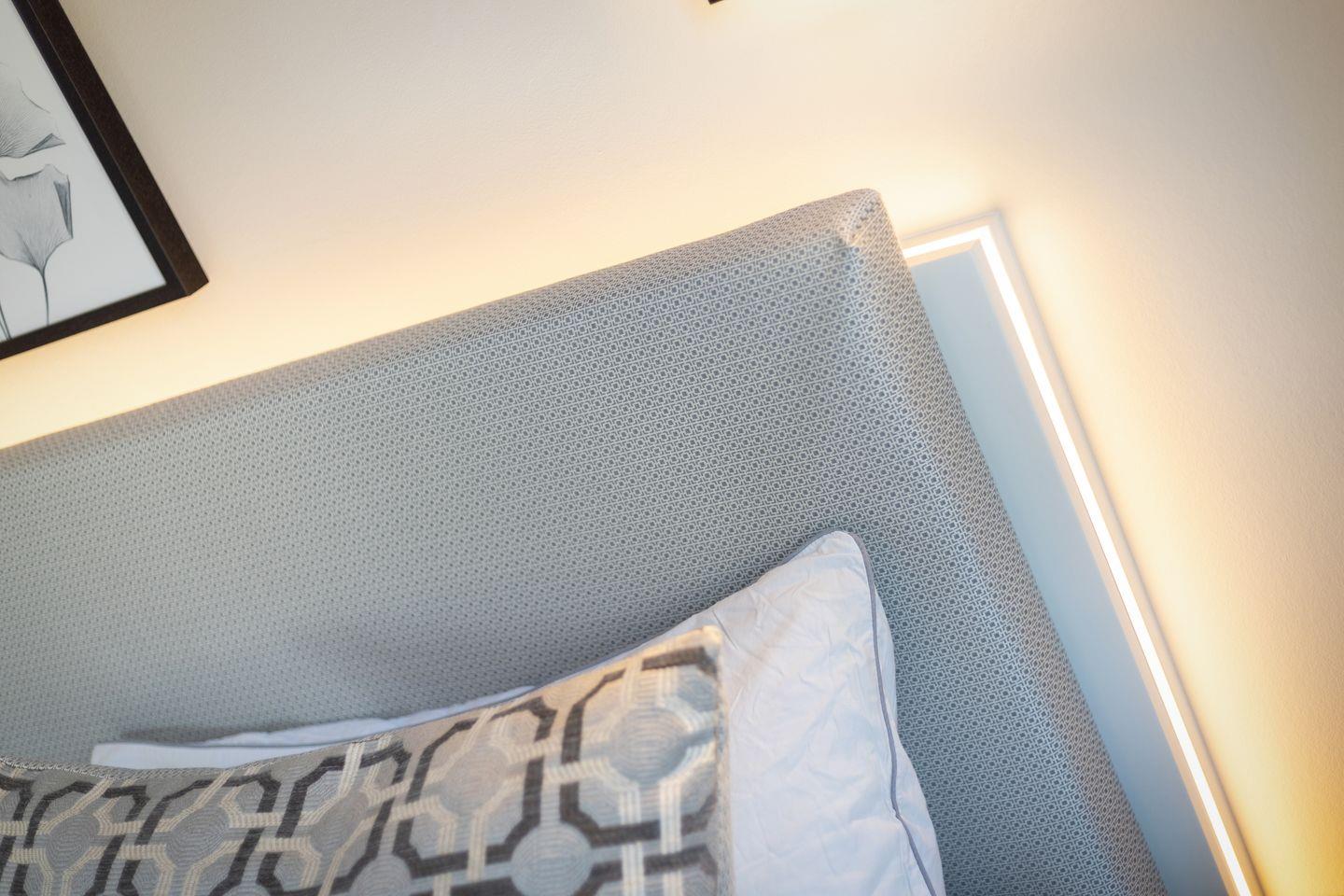 1 Schlafzimmer mit Boxspring-Doppelbett (200x200cm) und Flatscreen-TV, ein Schlafzimmer mit Boxspring-Doppelbett (160 x 200 cm), zwei Duschbäder. Die Wohnung verfügt über zwei Balkone, mit Gartenmöbeln aus Aluminium. In Haus befindet sich ein Fahrstuhl.