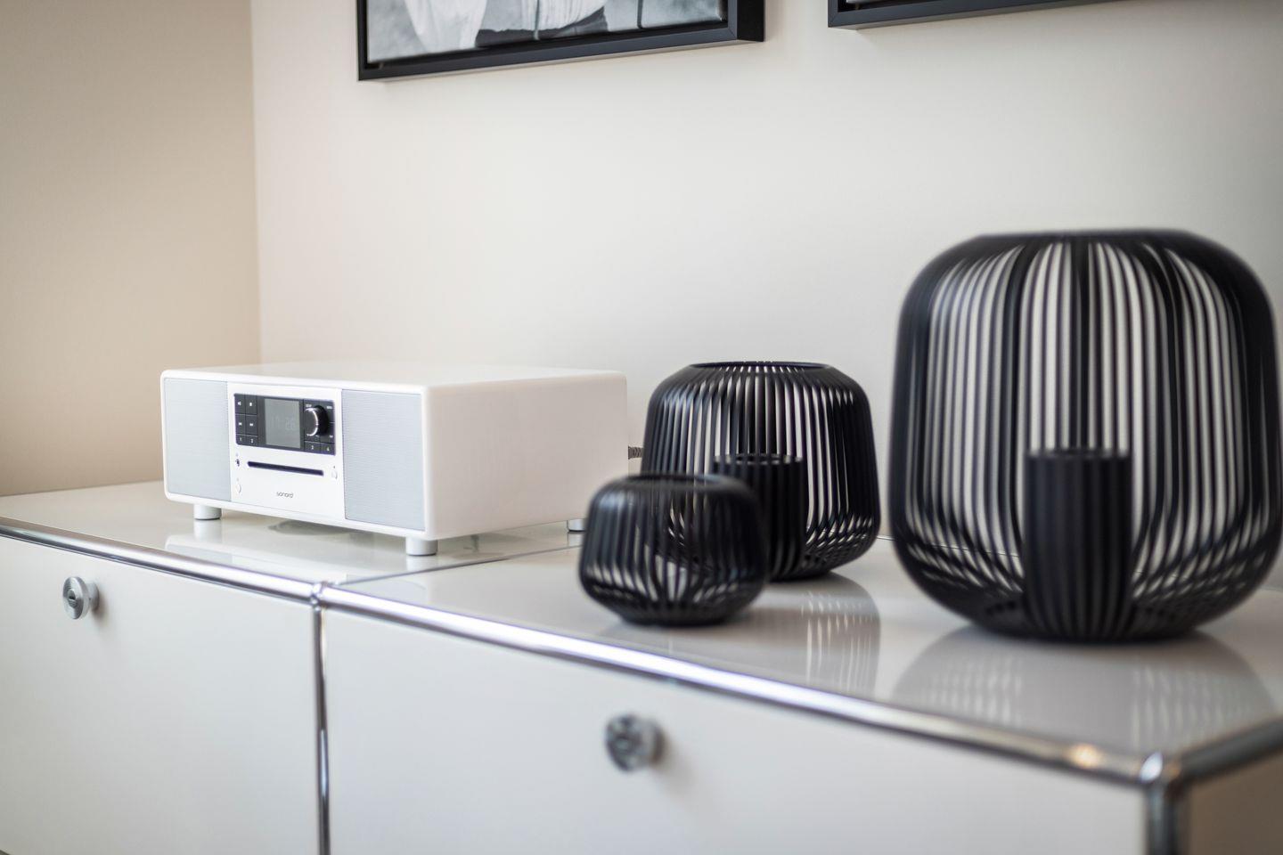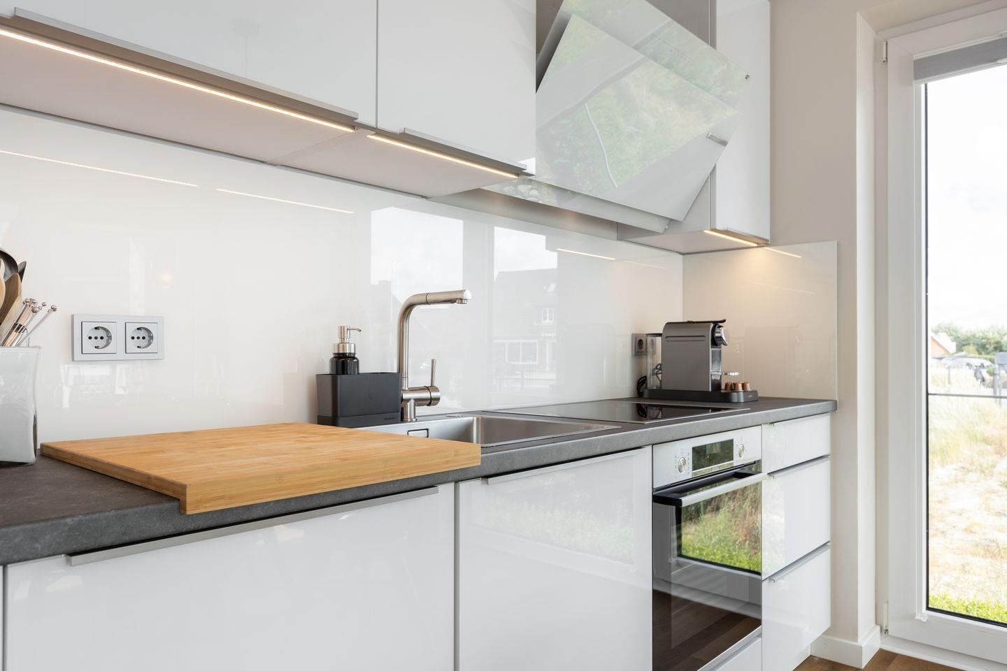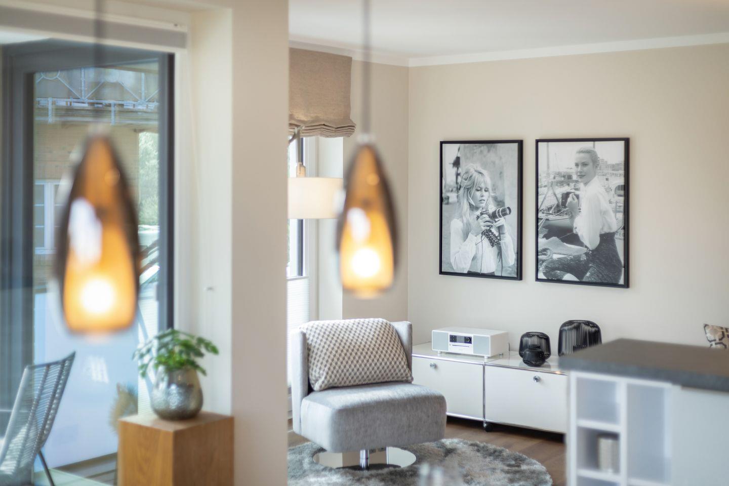 Obergeschoss: Wohnbereich mit Flatscreen-TV und einer Magenta Box, Radio, Soundsystem, CD Player, Entertain TV und Satelliten TV, offene Küchenzeile mit hochwertiger Ausstattung, Backofen, Induktionsherd, Geschirrspüler, Kaffeemaschine, Nespresso-Maschine.