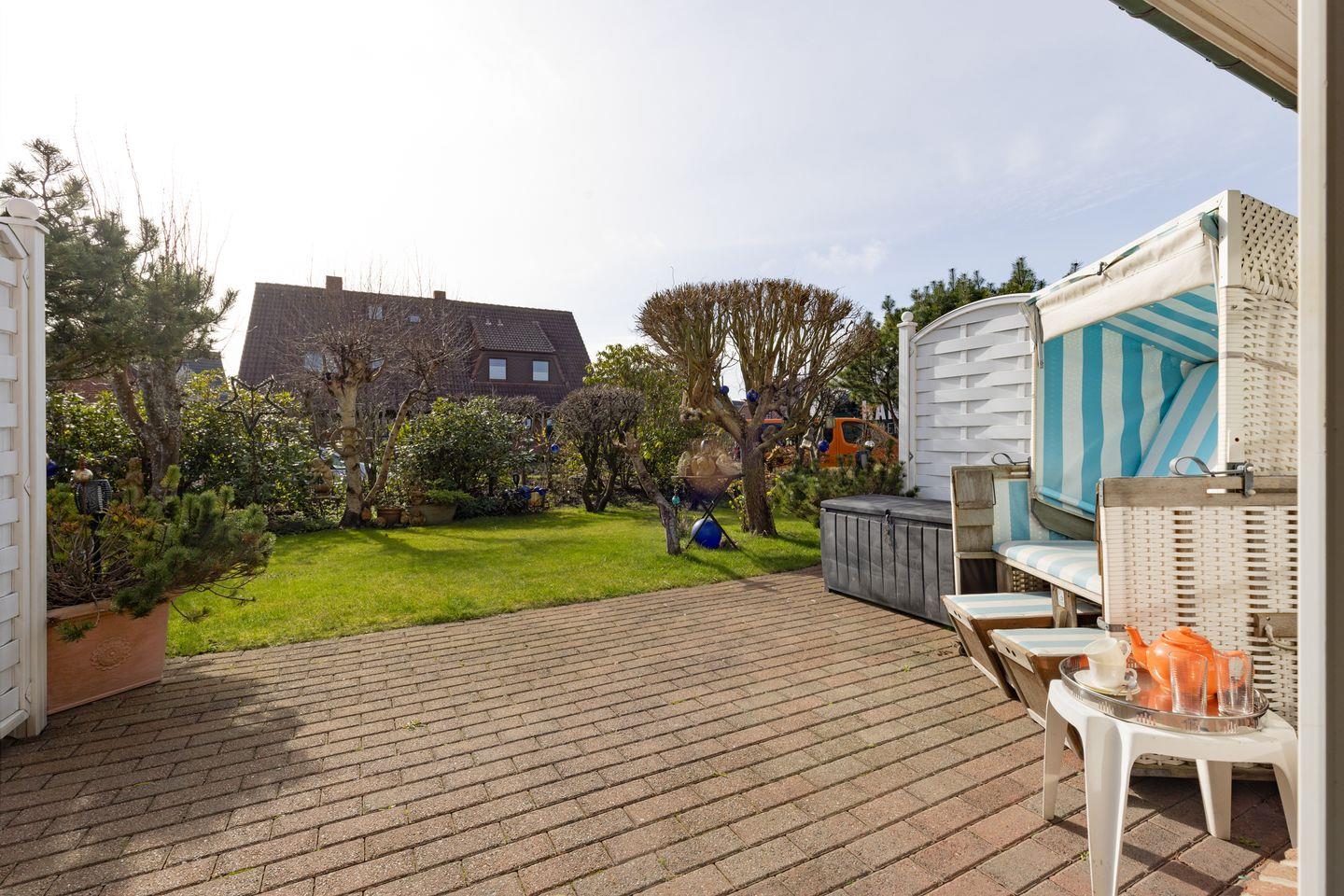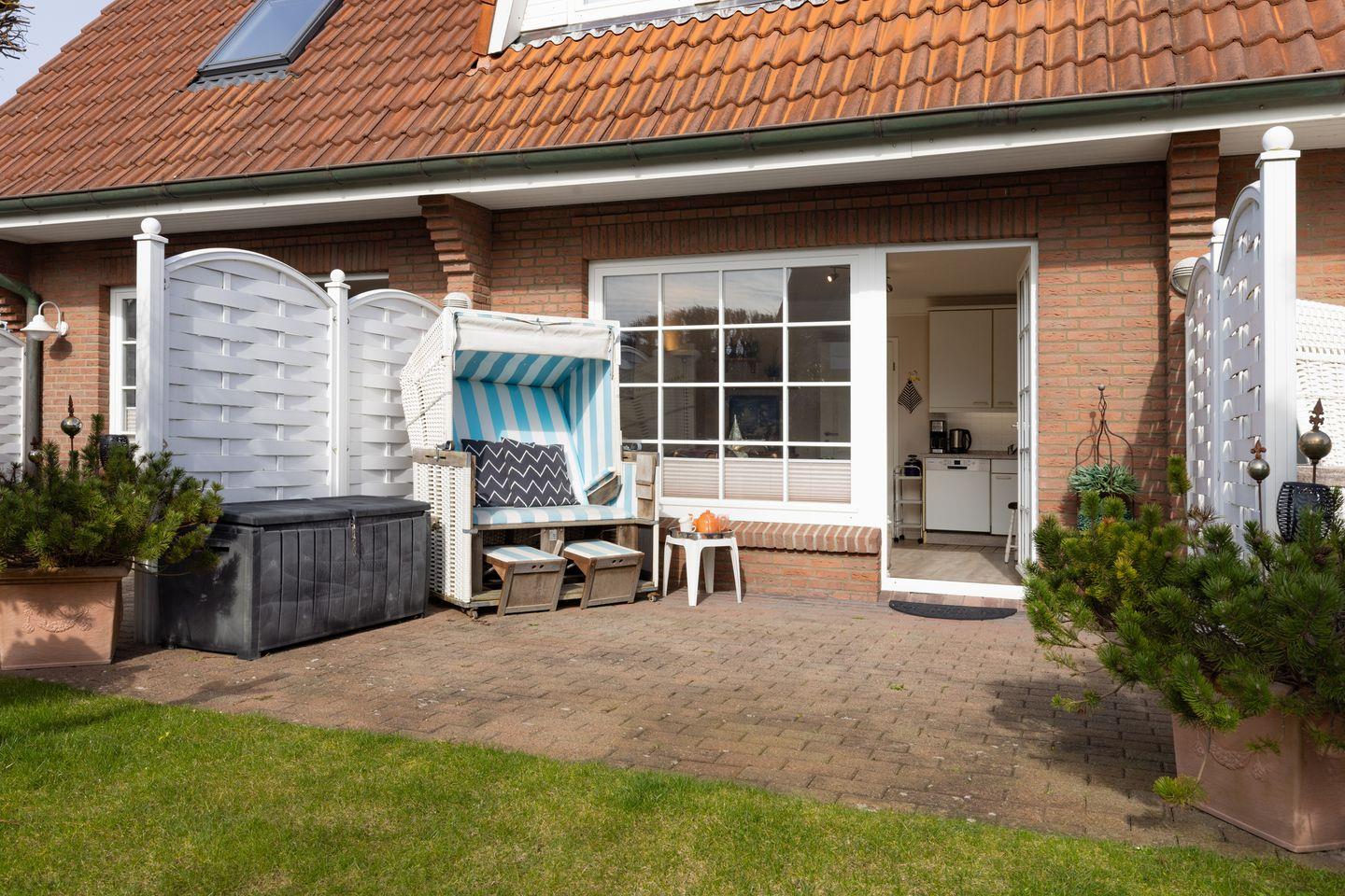 Die Terrasse mit Strandkorb lädt zum Entspannen im Freien ein. Der eingezäunte Garten bietet Ruhe und Erholung nach einem Tag am nahegelegenen Strand, der nur wenige Gehminuten entfernt ist.