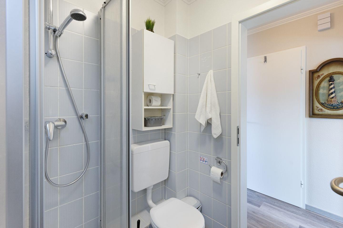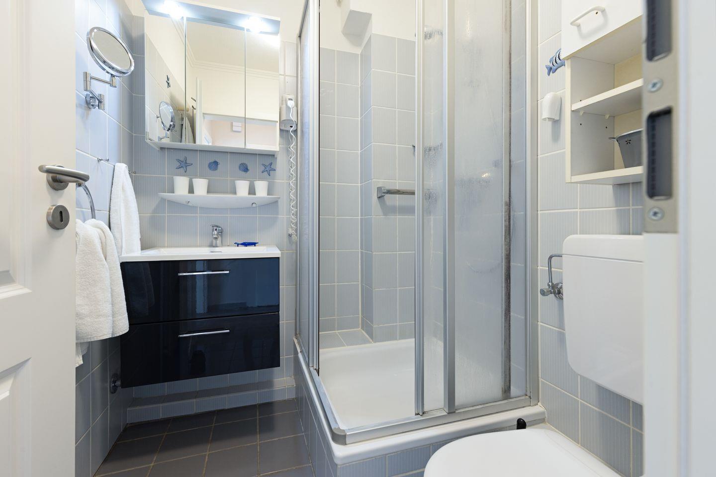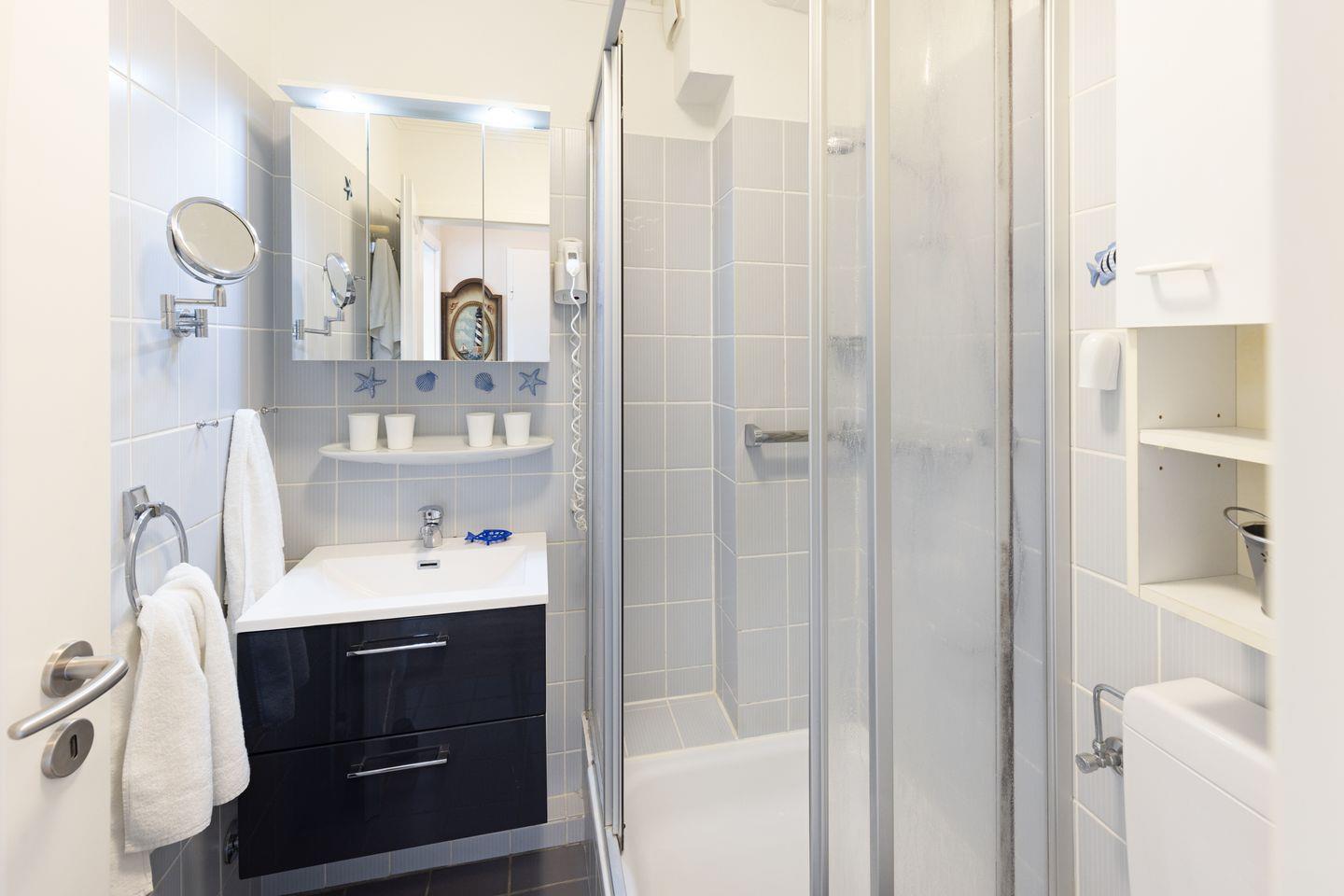 Ein Badezimmer mit Dusche sowie zwei Gemeinschaftsterrassen.