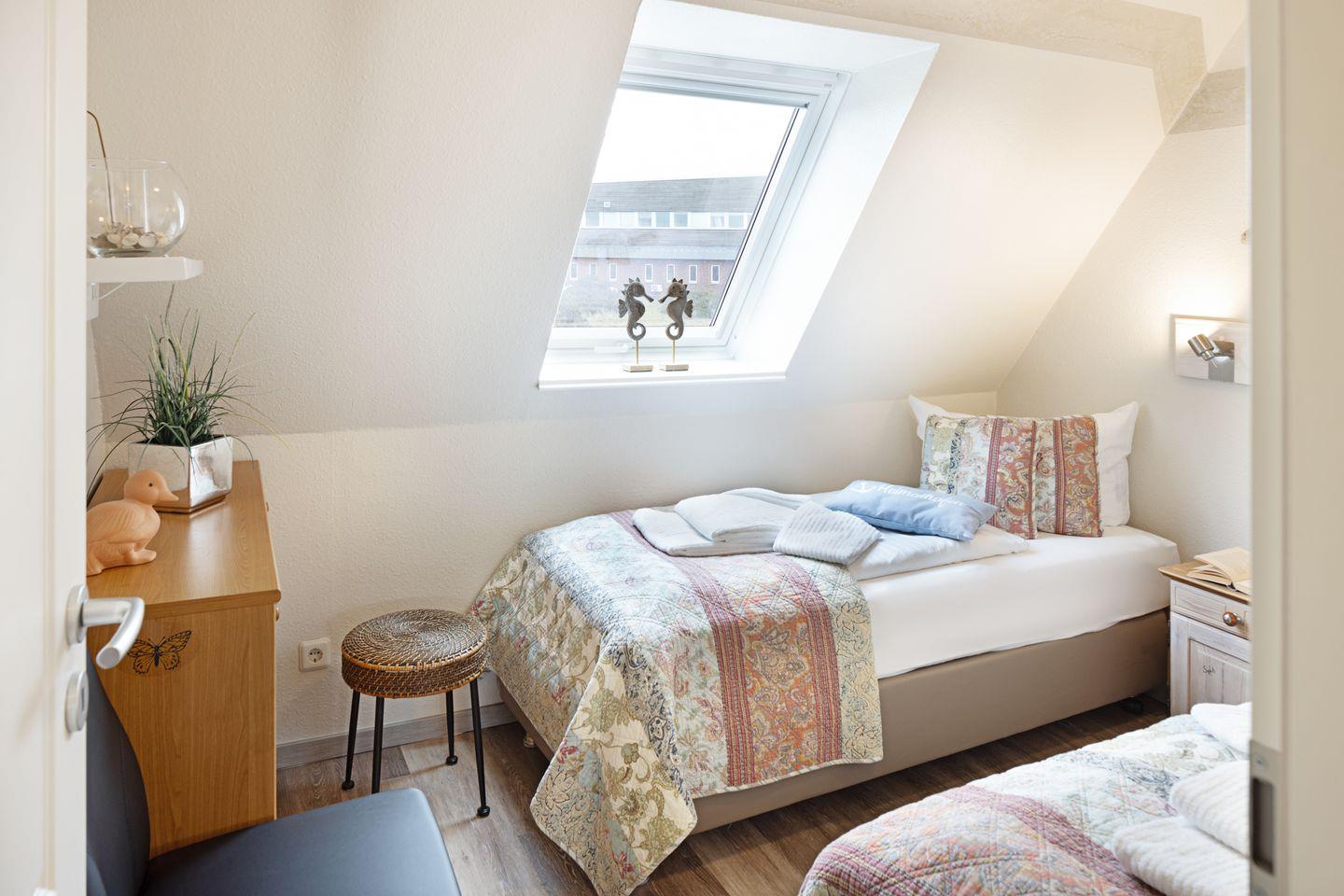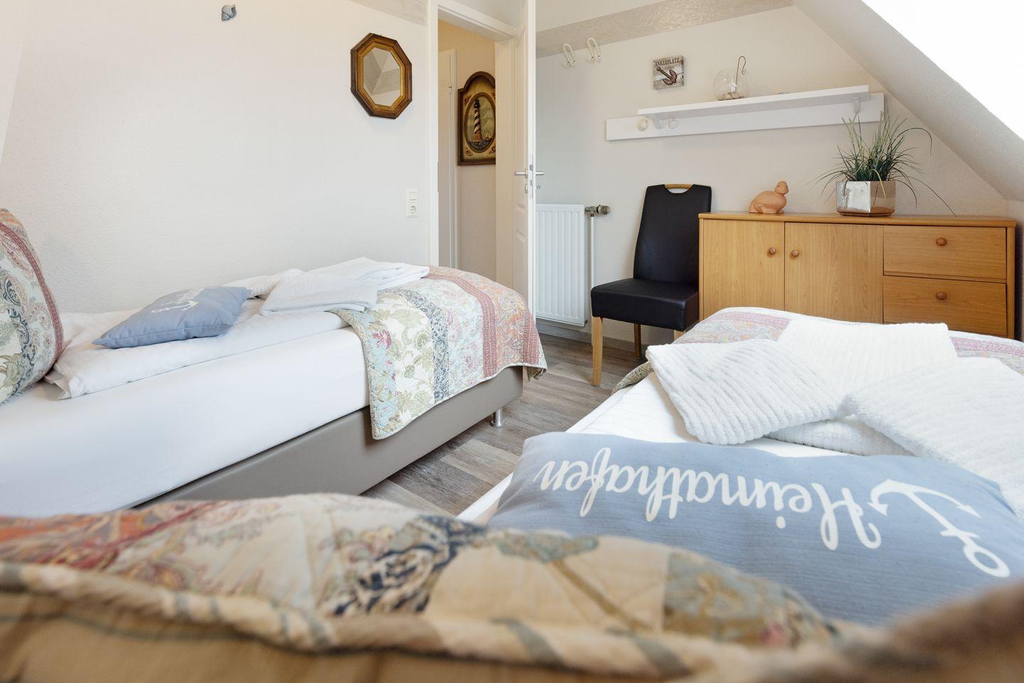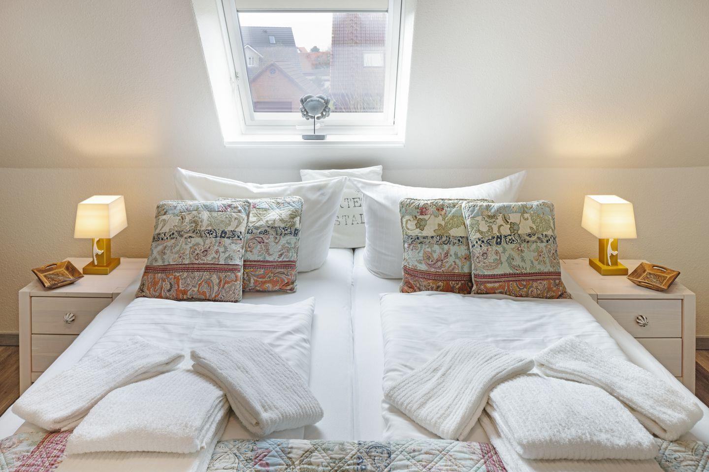 Die Ferienwohnung verfügt über zwei Schlafzimmer eins mit Doppelbett und ein weiteres mit zwei Einzelbetten.