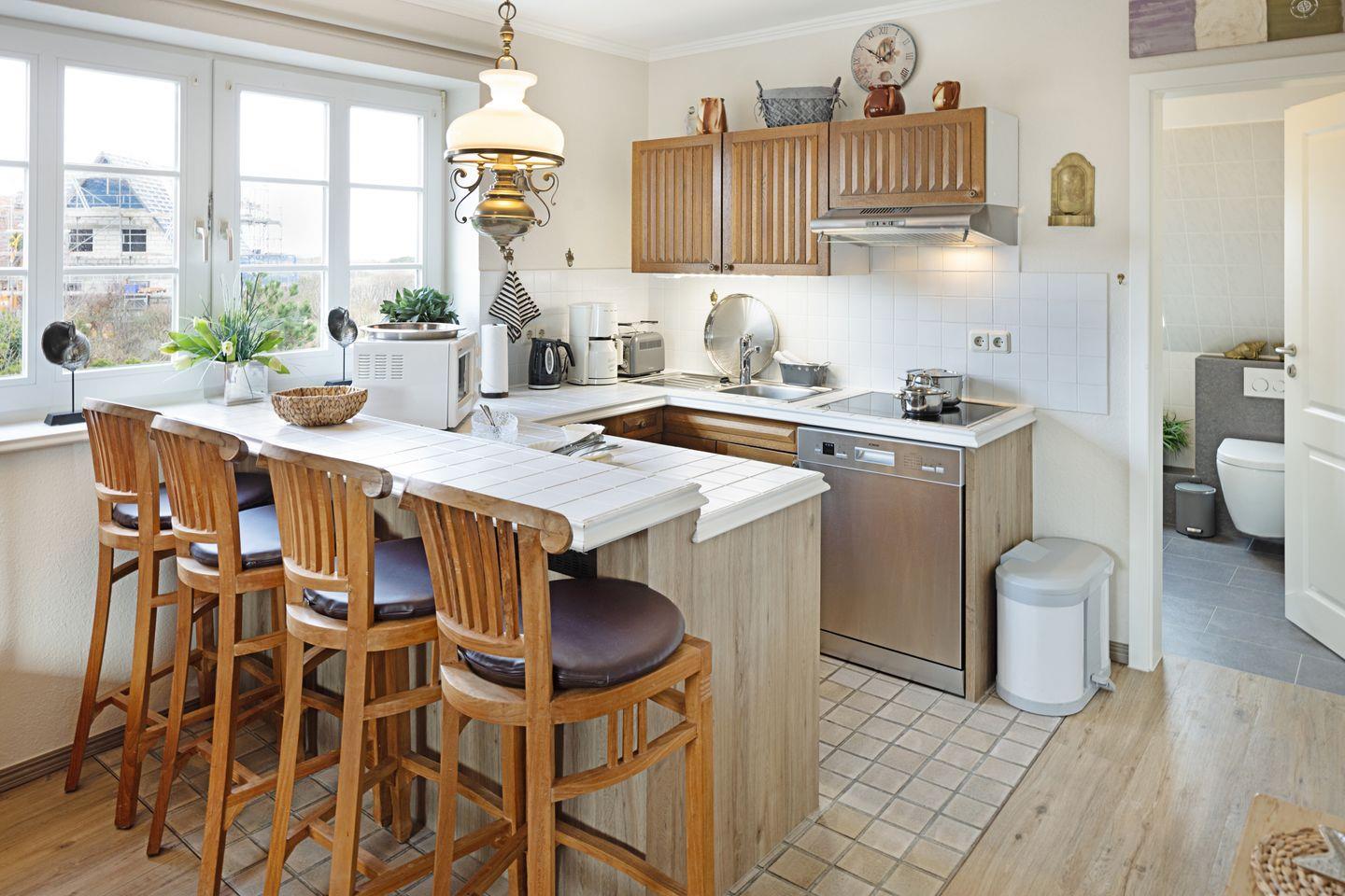 Neben dem gemütlichen Wohnzimmer mit Flachbildfernseher finden Sie eine große Küche sowie eine Theke mit Essbereich.