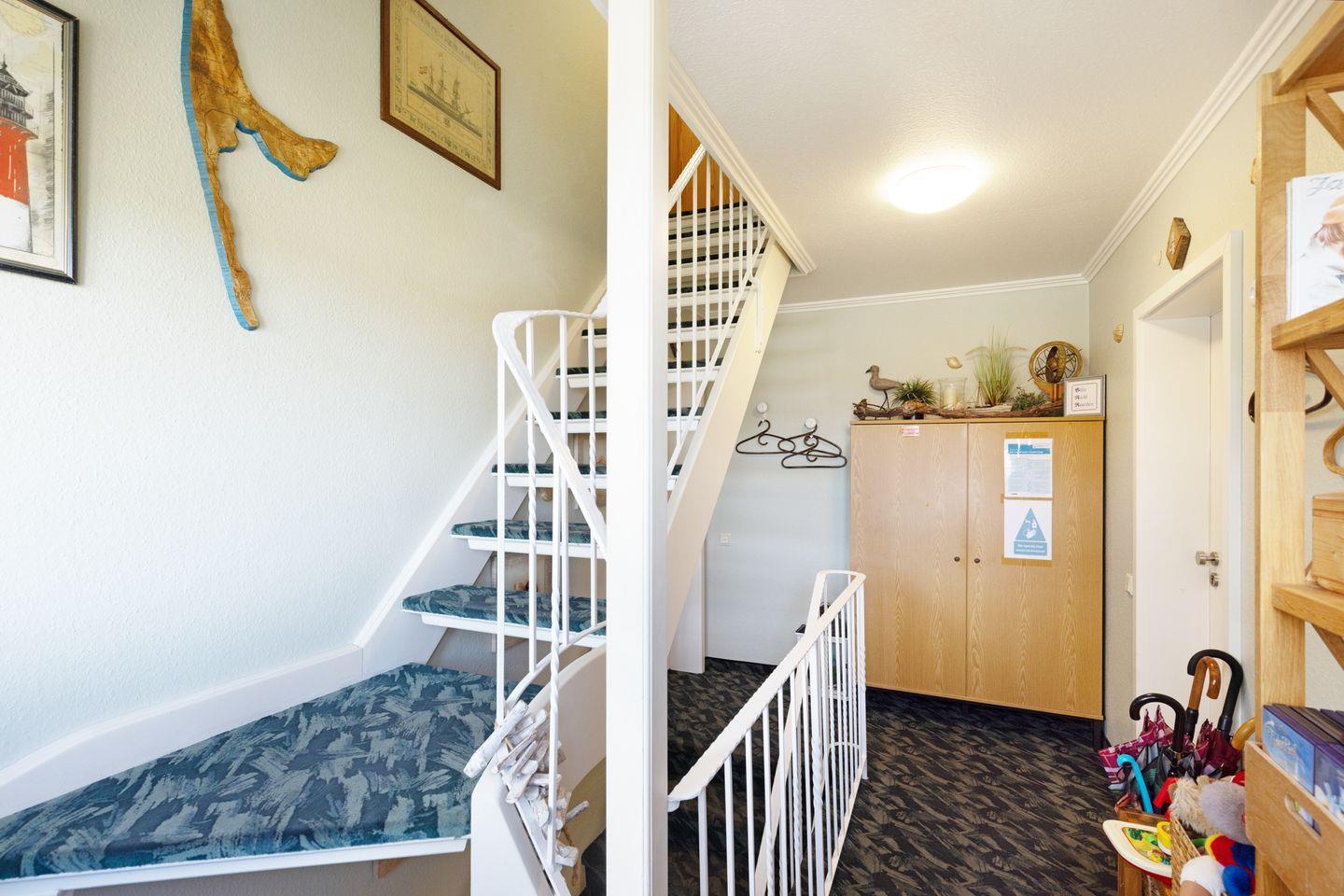 Die Ferienwohnung verfügt über ein Schlafzimmer mit Doppelbett (im zweiten Obergeschoss) und eine Schlafcouch für zwei Personen mit zusätzlichen Topper im Wohnzimmer.