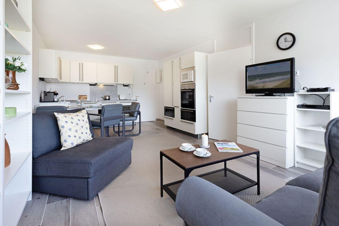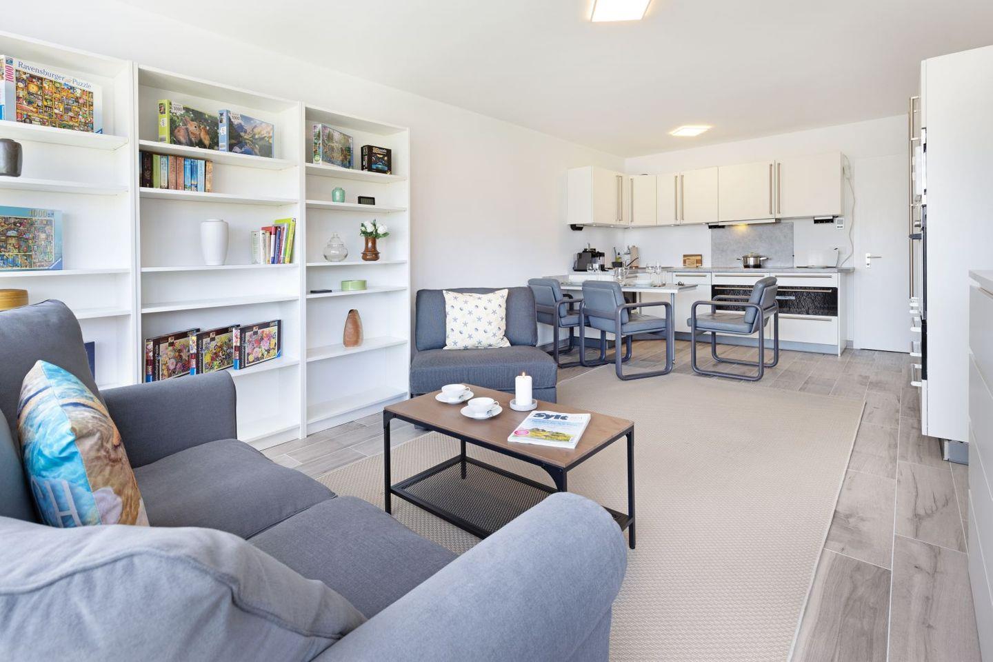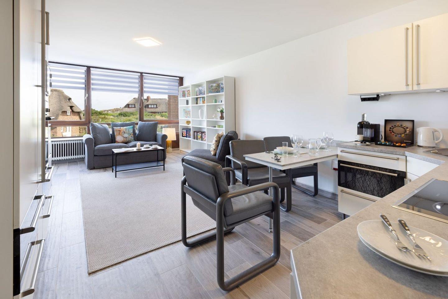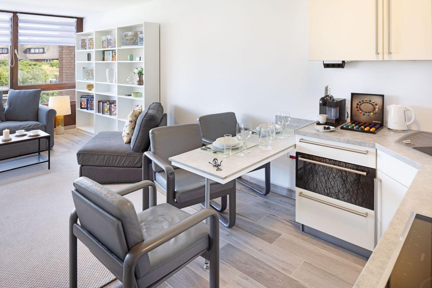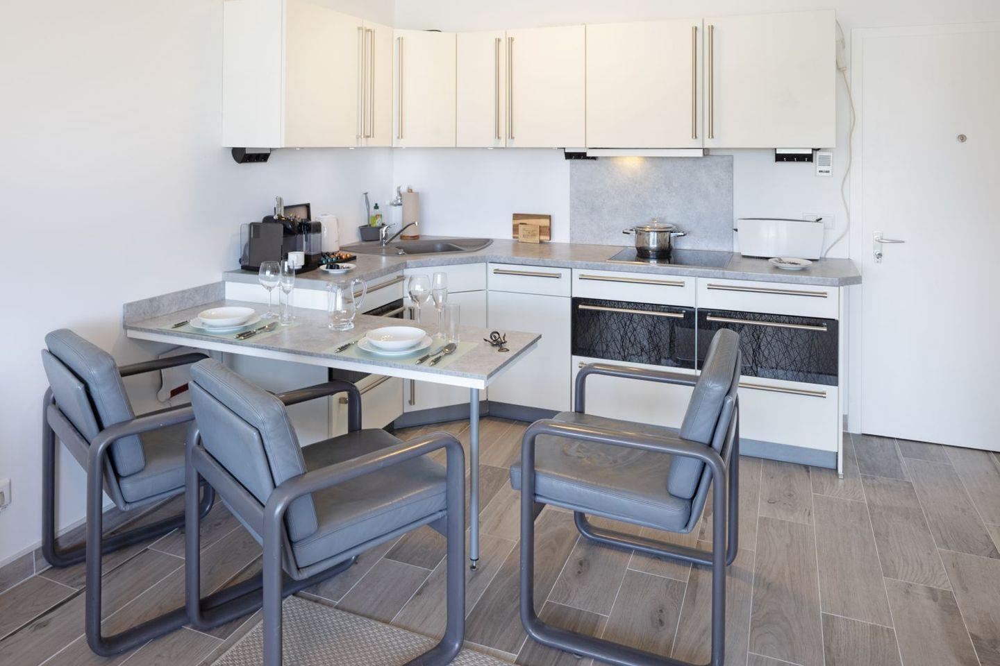 Die offene Küche lädt Sie dazu ein, kulinarische Köstlichkeiten zuzubereiten, ausgestattet mit hochwertigen Geräten, darunter ein Cerankochfeld, eine Spülmaschine und eine Nespresso-Maschine. Im angrenzenden Wohnbereich finden Sie ein gemütliches Sofa sowie einen Esstisch, ideal für gesellige Abende. Von hier aus gelangen Sie auf den eigenen Balkon, der Ihnen die Möglichkeit bietet, die frische Meeresbrise und den herrlichen Ausblick zu genießen.