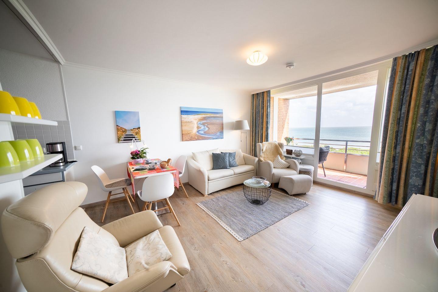 Die Ferienwohnung "Wattenblick 50-16" überzeugt mit außergewöhnlich gutem Meerblick, überdachtem Balkon und nur 170 m Entfernung zum Sandstrand. Sie bietet auf 46 m² ein Schlafzimmer, ein Wohnzimmer mit offener Küche, WLAN, zwei TVs, einen Privatparkplatz sowie eine eigene Waschmaschine. Ideal für bis zu drei Gäste, familienfreundlich und Nichtraucher.