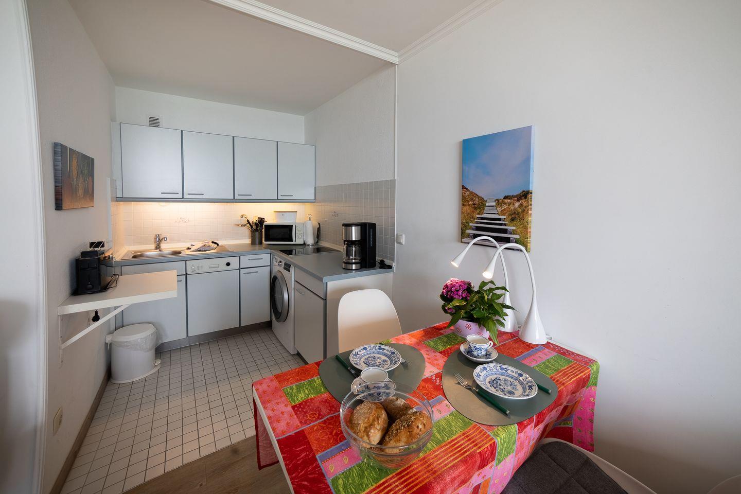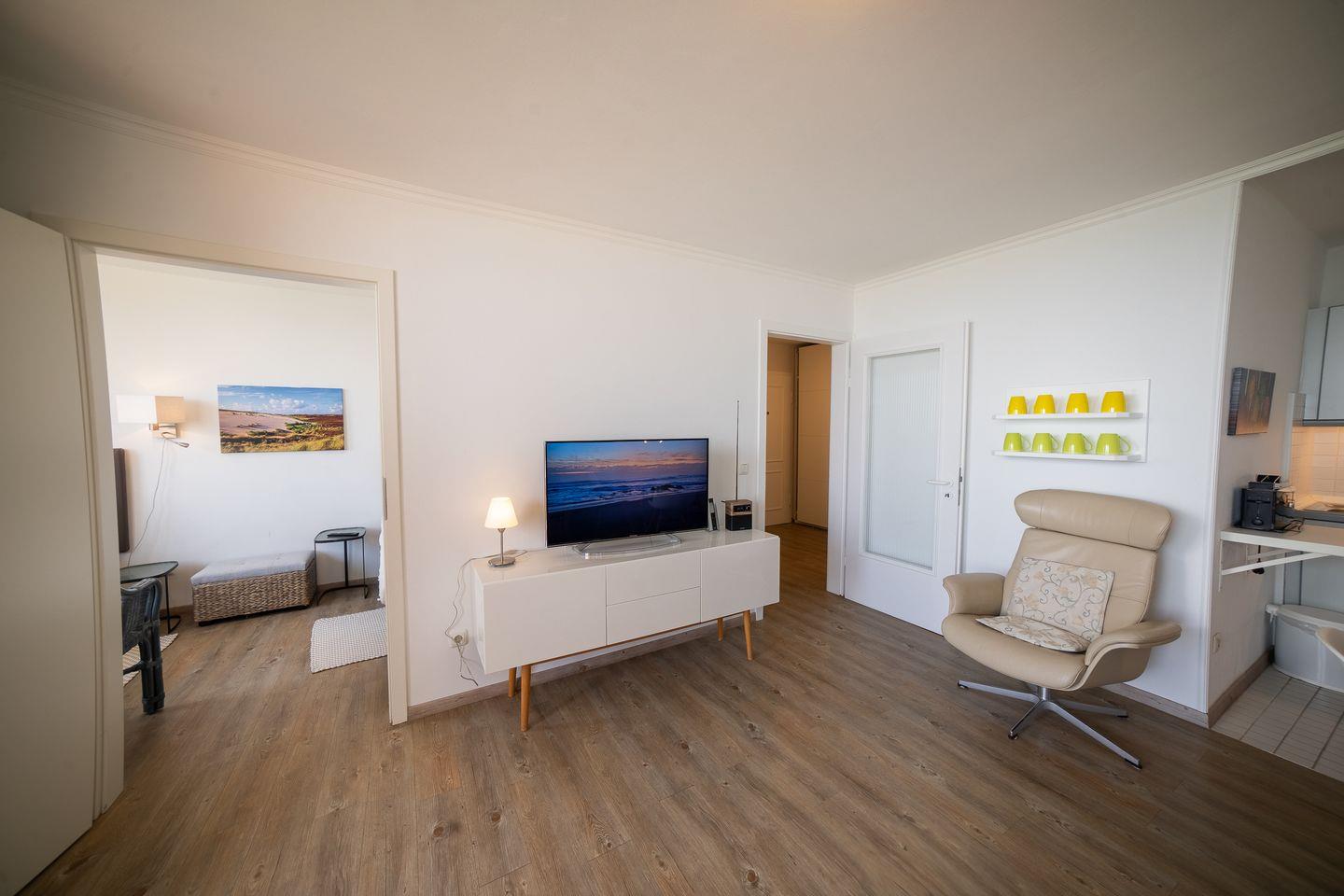 Die Unterkunft verfügt über ein separates Schlafzimmer, das Platz für bis zu zwei Schlafmöglichkeiten bietet und Ruhe für erholsame Nächte garantiert. Im Wohnzimmer, das ebenfalls mit einem pflegeleichten Laminatboden ausgestattet ist, finden Sie neben einem bequemen Sofa und einem Sessel auch einen Esstisch sowie eine Kommode für persönliche Gegenstände. Der offene Grundriss verbindet den Wohnbereich mit einer ausgestatteten Küche, die mit modernen Geräten wie Cerankochfeld, Backofen, Mikrowelle, Kühlschrank mit Gefrierfach, Geschirrspüler, Kaffeemaschine, Toaster und Wasserkocher keine Wünsche offenlässt. Sämtliche Küchenutensilien stehen selbstverständlich bereit.