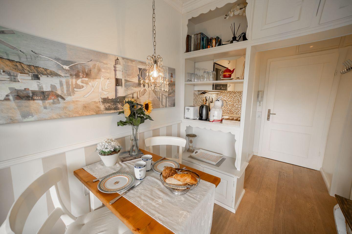 Die Kochnische ist funktional eingerichtet und umfasst alles, was Sie für die Zubereitung köstlicher Mahlzeiten benötigen. Sie finden hier ein zweiplättriges Kochfeld, einen Kühlschrank mit Gefrierfach, eine Mikrowelle, eine Espressomaschine von Dolce Gusto, sowie weitere Küchengeräte wie Toaster, Wasserkocher und Geschirr. An dem Esstisch können Sie sich bei einem romantischen Abendessen oder einem gemütlichen Frühstück zusammenfinden.