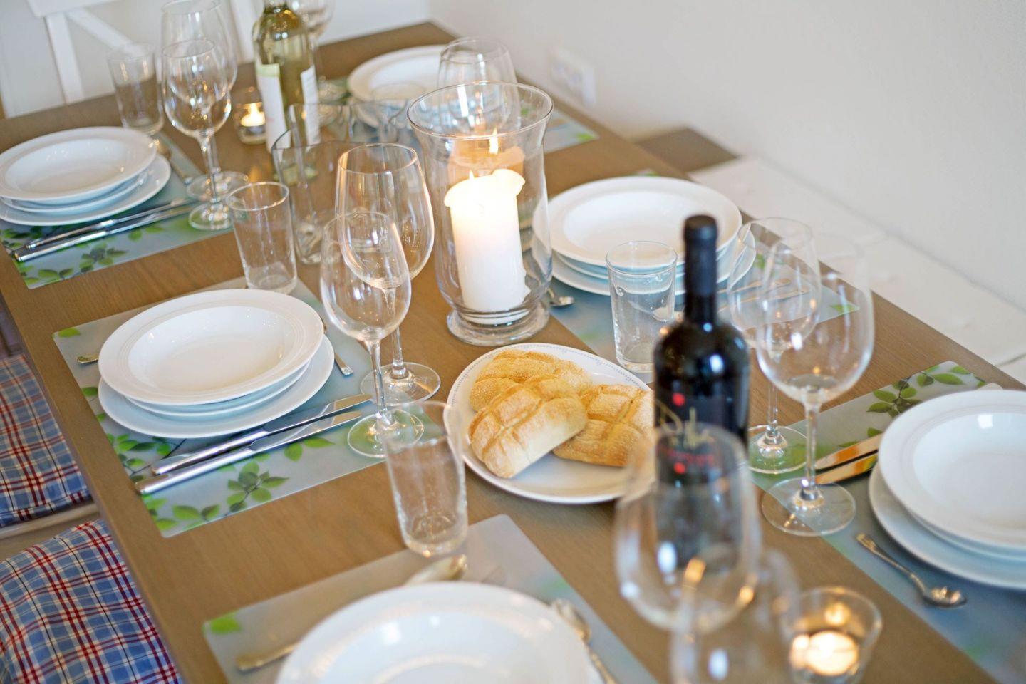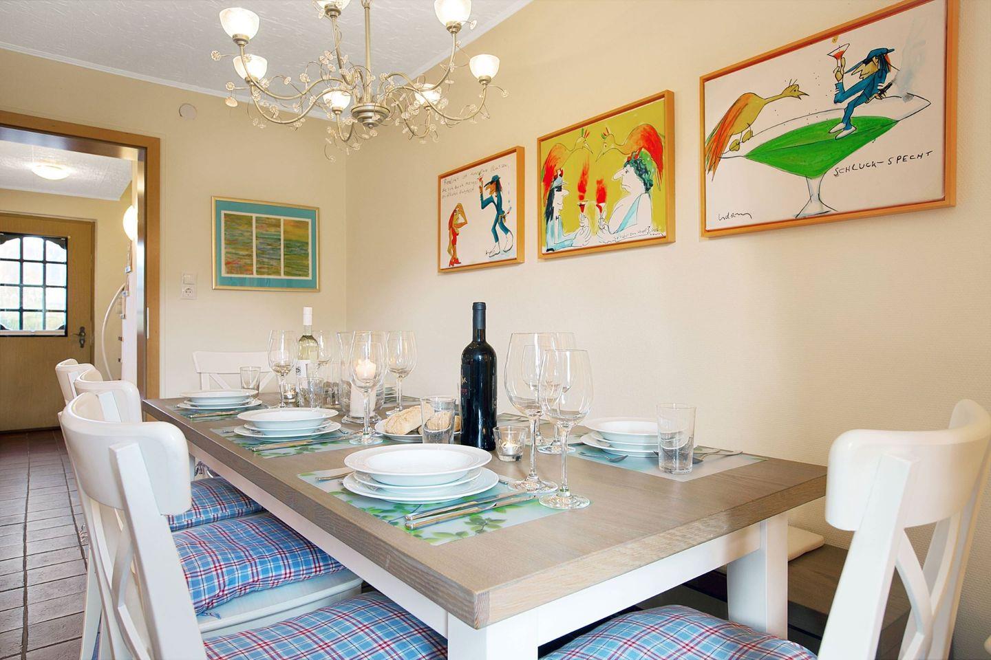 Die offene Küche ist modern und voll ausgestattet, um die Zubereitung von Mahlzeiten zum Vergnügen zu machen. Sie finden hier einen Herd, einen Kühlschrank sowie einen Gefrierschrank, eine Spülmaschine, einen Backofen und diverse Küchenutensilien. Genießen Sie Ihre kulinarischen Kreationen am großen Esstisch im Essbereich oder in der dazugehörigen Sofaecke im Wohnzimmer, das durch seine gemütliche Einrichtung zum Verweilen einlädt.