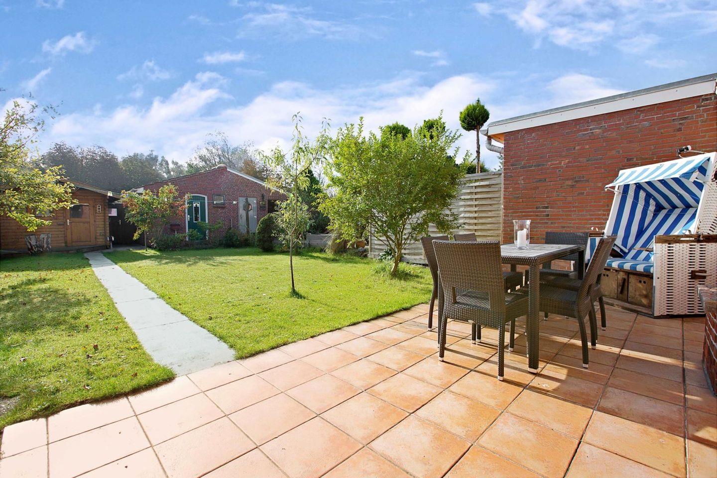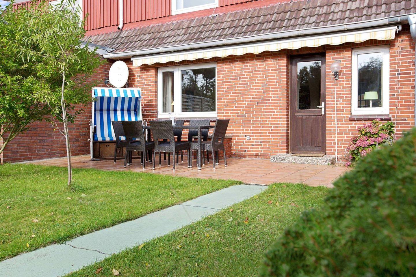 Auf der schönen Terrasse können Sie bei schönem Wetter die frische Nordseeluft genießen und entspannen. Die Gartenmöbel und der Strandkorb laden dazu ein, im Freien zu sitzen und die ruhige Umgebung zu genießen.