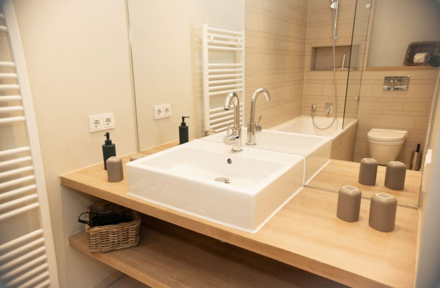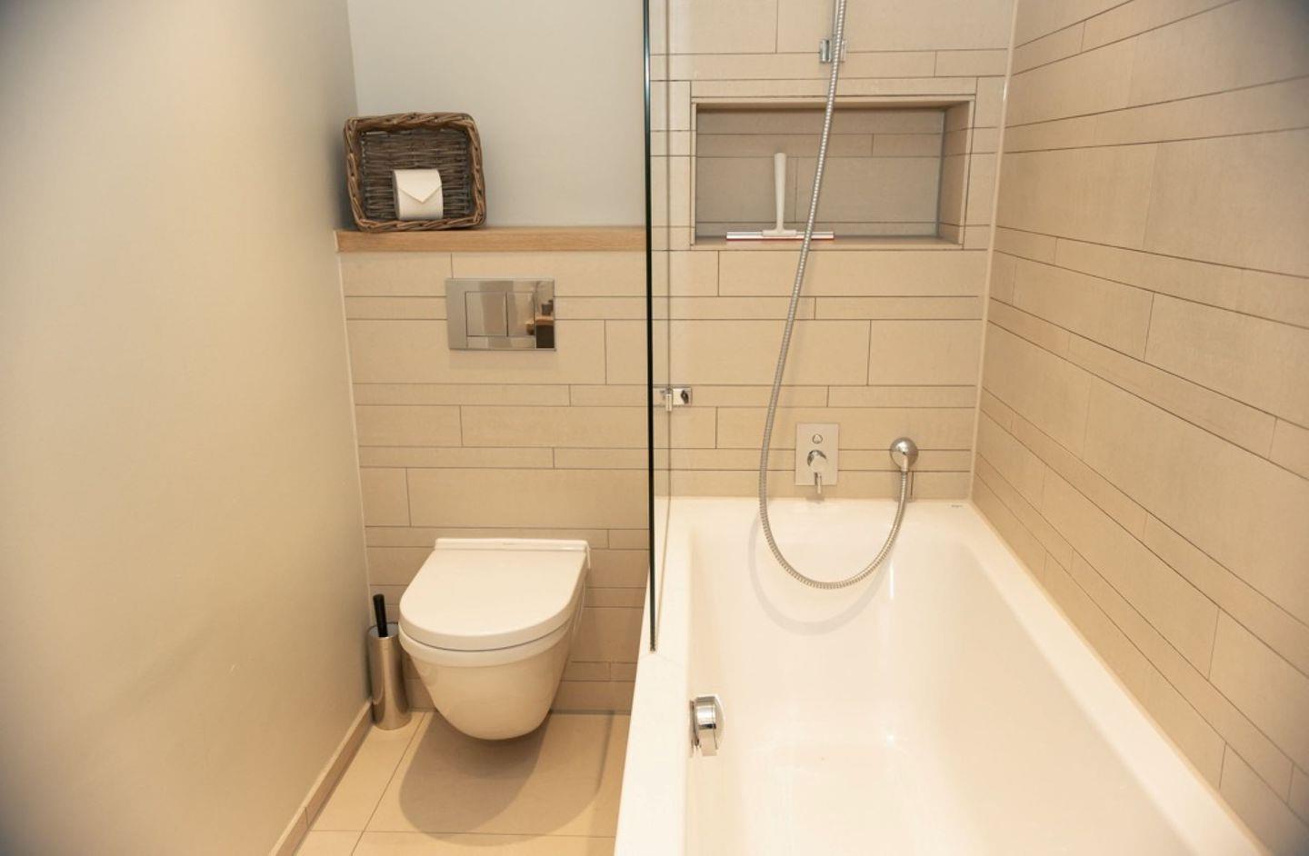 Das Badezimmer umfasst eine Duschbadewanne, WC, Waschbecken, Spiegel und Haartrockner – für Ihren Komfort und Ihre tägliche Pflegeroutine. Zusätzlich gibt es ein separates Gäste-WC.