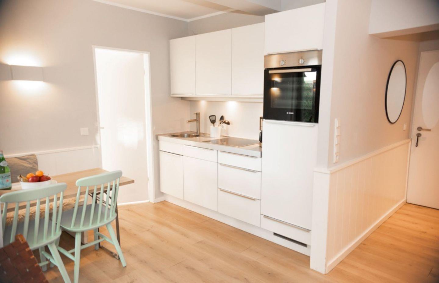 Im offen zum Wohnzimmer gestalteten Küchenbereich finden Sie eine umfassende Ausstattung, darunter ein Ceranherd, Backofen, Kühlschrank mit integriertem Gefrierfach, Spülmaschine, Kaffeemaschine, Toaster, Wasserkocher sowie vielfältige Küchenutensilien. Der angrenzende Essbereich mit Esstisch und einer gemütlichen Sofaecke ist ideal, um gemeinsame Mahlzeiten einzunehmen oder entspannt den Tag ausklingen zu lassen. Das Wohnzimmer bietet mit einem großen Satelliten-TV komfortable Unterhaltungsmöglichkeiten. WLAN steht Ihnen zur Verfügung.