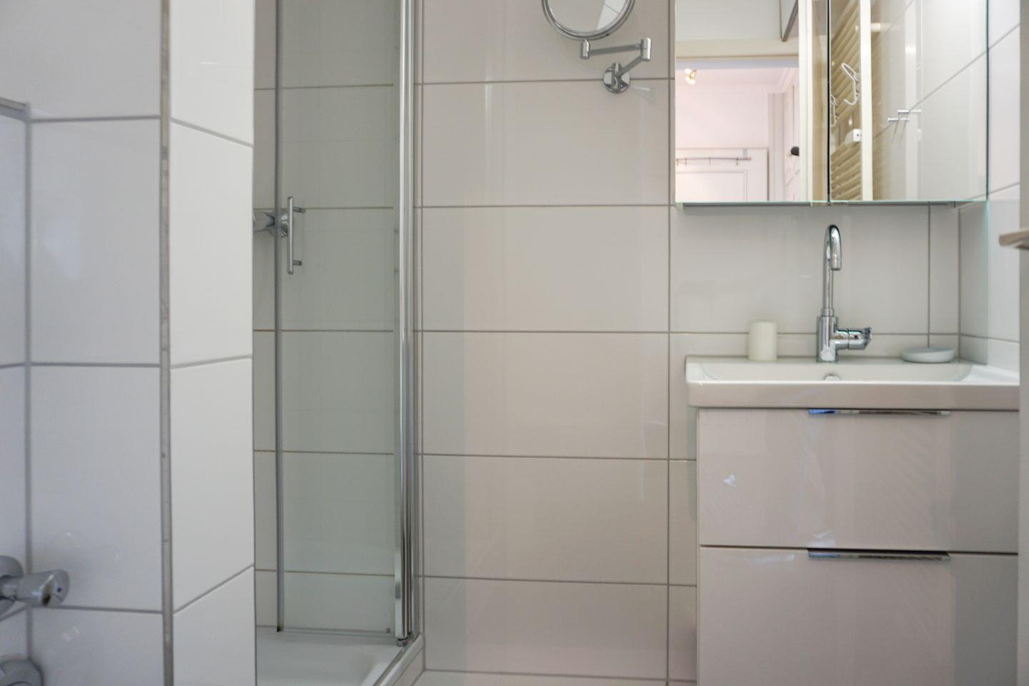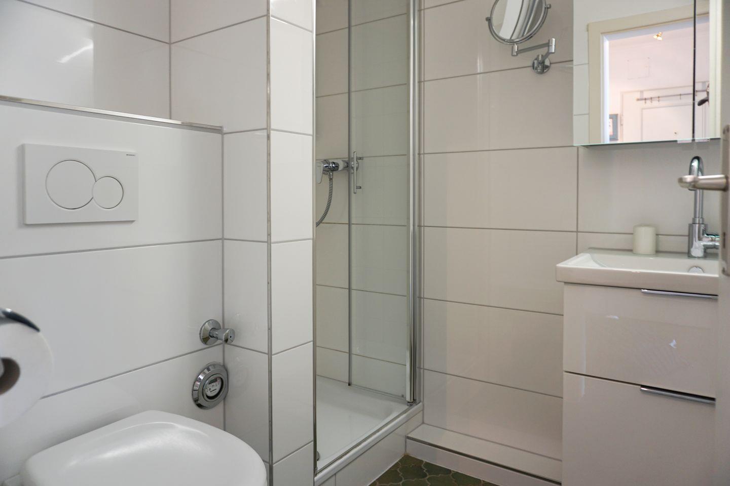 Das Badezimmer verfügt über eine Dusche, ein WC, Waschbecken, Spiegel, einen Kosmetikspiegel und einen Haartrockner.