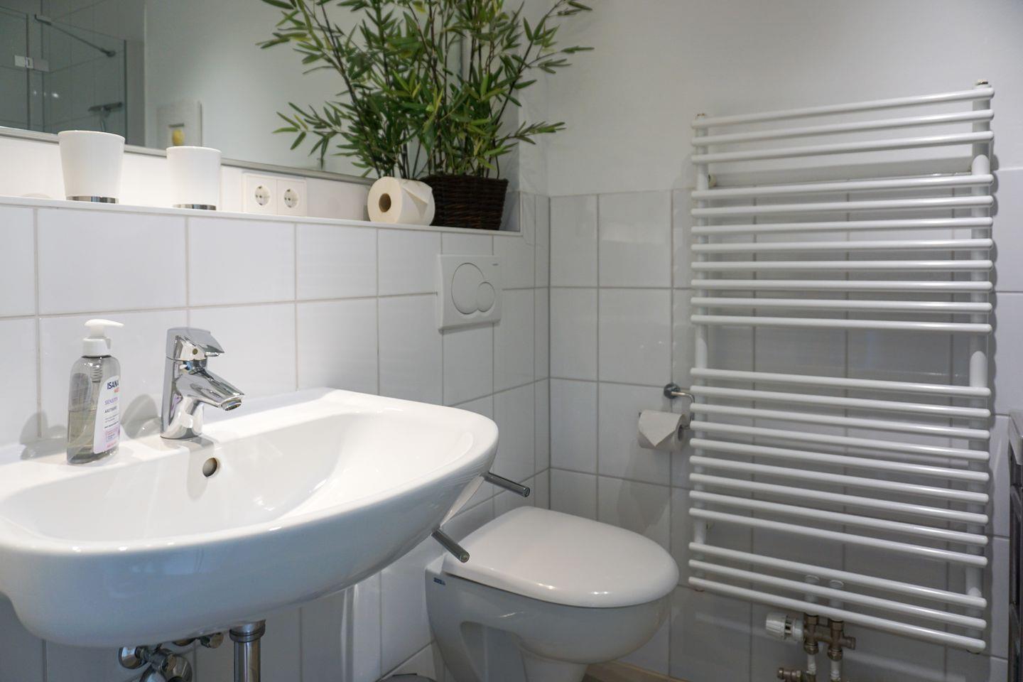 Auch längere Aufenthalte werden durch umfangreiche Ausstattung erleichtert. Eine Waschmaschine, ein Trockner (beide zur Eigennutzung), Wäscheständer, Bügeleisen mit Bügelbrett und ein Staubsauger stehen bereit. Die Garderobe im Eingangsbereich sorgt für Ordnung.