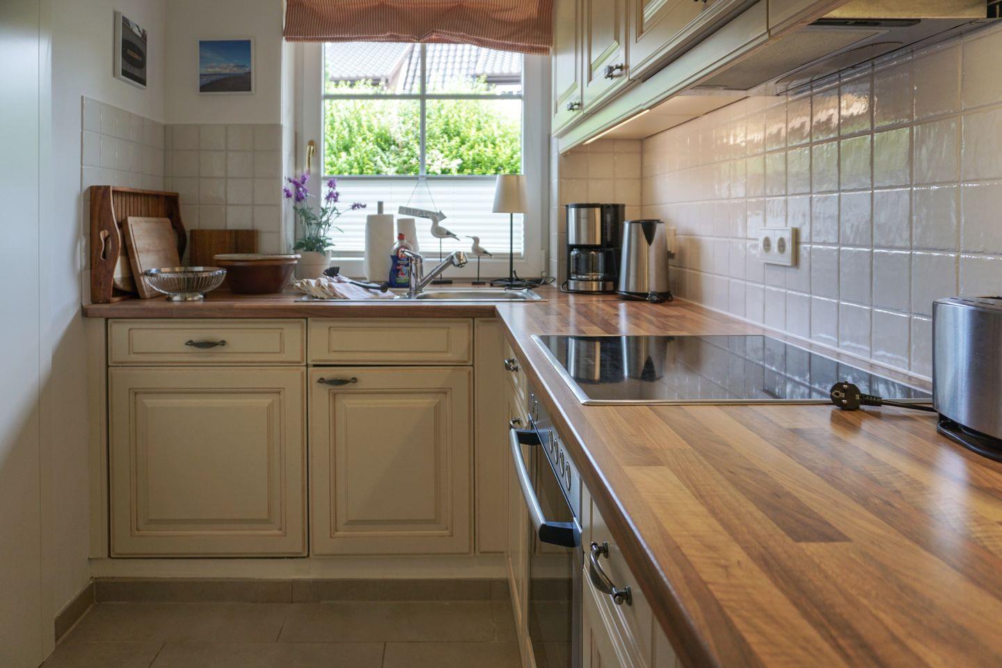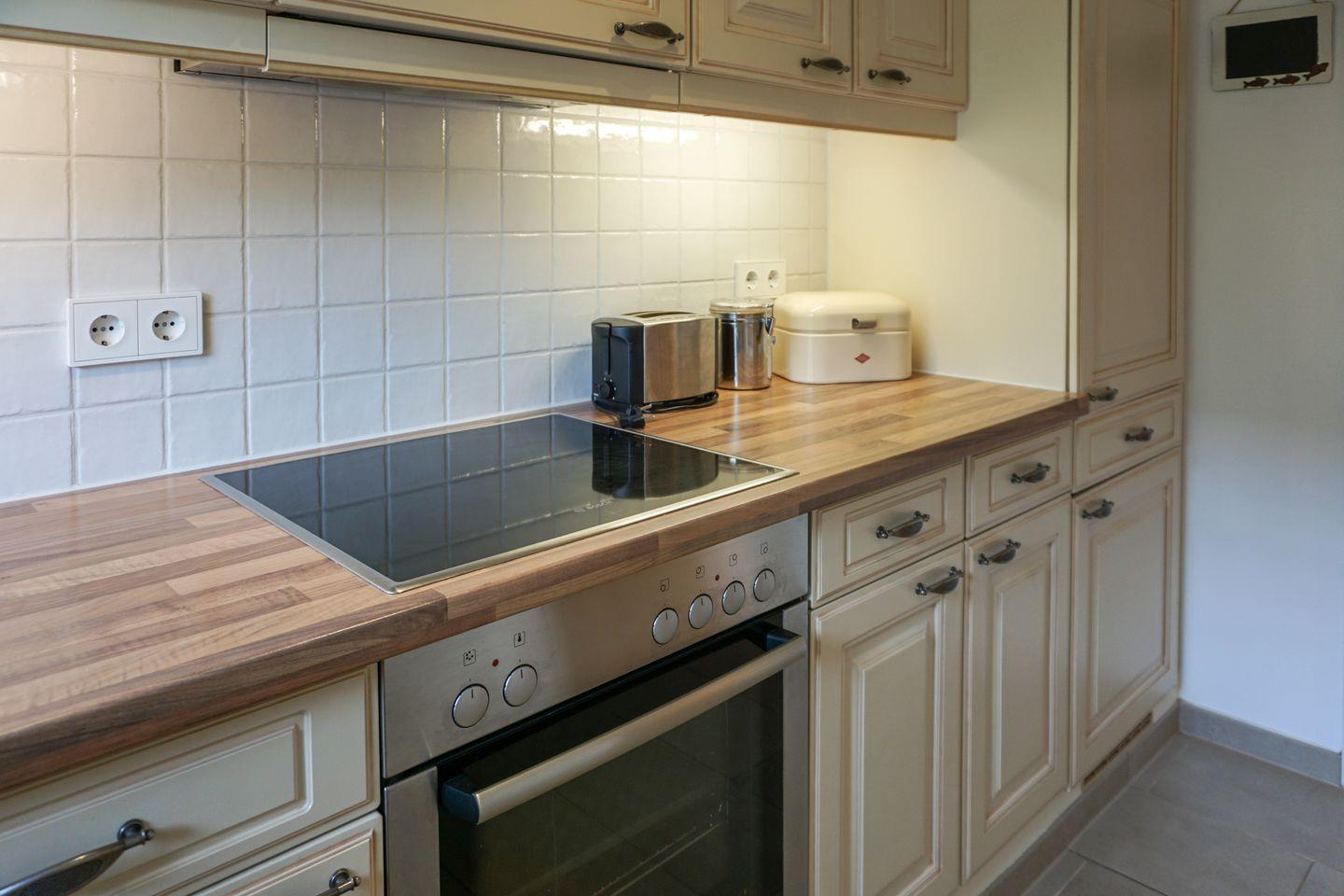 Die geräumige, separate Küche ist voll ausgestattet und lässt keine Wünsche offen: Ceranherd, Backofen, Kühlschrank mit integriertem Gefrierfach, Spülmaschine, Wasserkocher und Espressomaschine sind ebenso vorhanden wie Geschirr, Besteck und alle notwendigen Küchenutensilien für das gemeinsame Kocherlebnis. Der angrenzende Essbereich mit großem Esstisch schafft die passende Atmosphäre für gesellige Mahlzeiten.