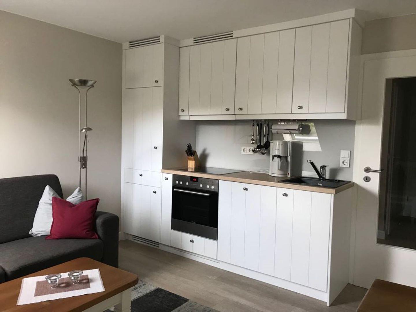 Die offene Küche ist mit modernen Geräten umfassend ausgestattet: Cerankochfeld, Backofen (Elektroanschluss), Kühlschrank inklusive Gefrierfach, Spülmaschine, Toaster, Mixer, Kaffeemaschine und Wasserkocher stehen zur Verfügung. Zudem sind sämtliche Küchenutensilien vorhanden, sodass Sie bequem für sich und Ihre Mitreisenden kochen können.