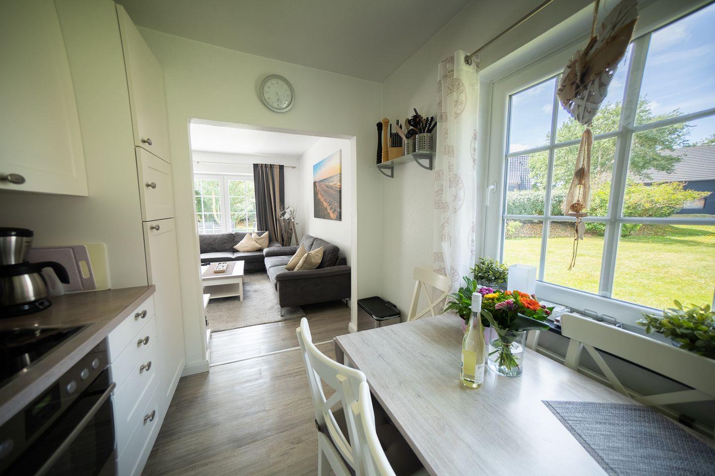 Die Küche lässt keine Wünsche offen: Sie verfügt über einen Ceranherd mit Elektroanschluss, einen Backofen, eine Mikrowelle, Spülmaschine, Kühlschrank sowie einen separaten Gefrierschrank. Küchenutensilien sowie nützliche Elektrogeräte wie Kaffeemaschine, Toaster, Wasserkocher und Mixer sind ebenso vorhanden.