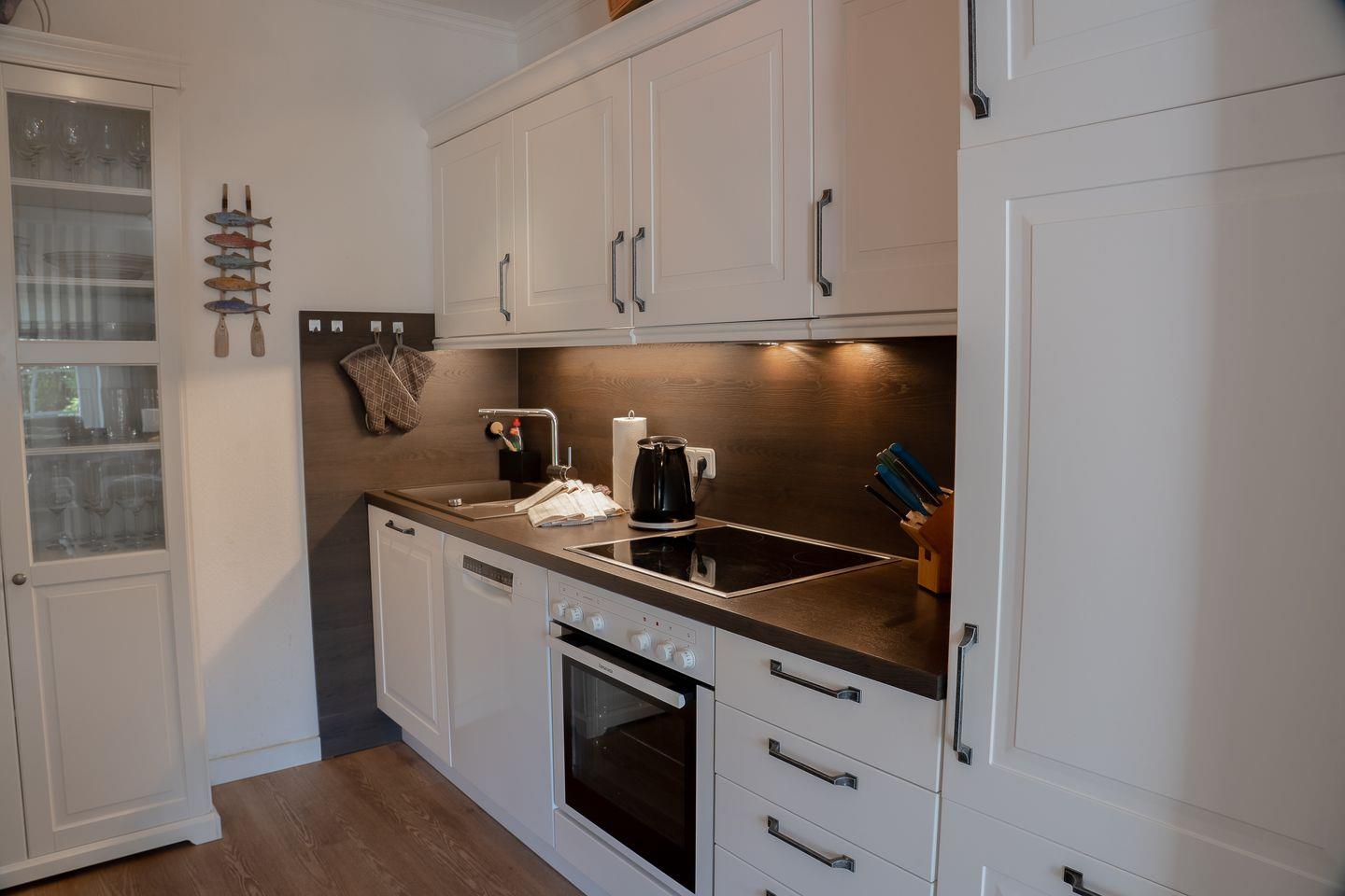 Die offene Küche ist direkt mit dem Wohnzimmer verbunden und umfassend ausgestattet. Sie finden hier moderne Geräte wie einen Ceranherd, Backofen mit Elektroanschluss, Mikrowelle, Kühlschrank mit Gefrierfach, Spülmaschine, Toaster, Wasserkocher, Kaffeemaschine und Mixer. Für gemeinsame Mahlzeiten steht Ihnen ein Essbereich mit Esstisch sowie eine separate Sofaecke im komfortablen Wohnzimmer zur Verfügung. Zwei Fernseher mit Satellitenanschluss, ein DVD- und CD-Spieler sowie ein Radio sorgen für Unterhaltung, während das kostenfreie WLAN eine unkomplizierte Kommunikation und Internetnutzung ermöglicht.