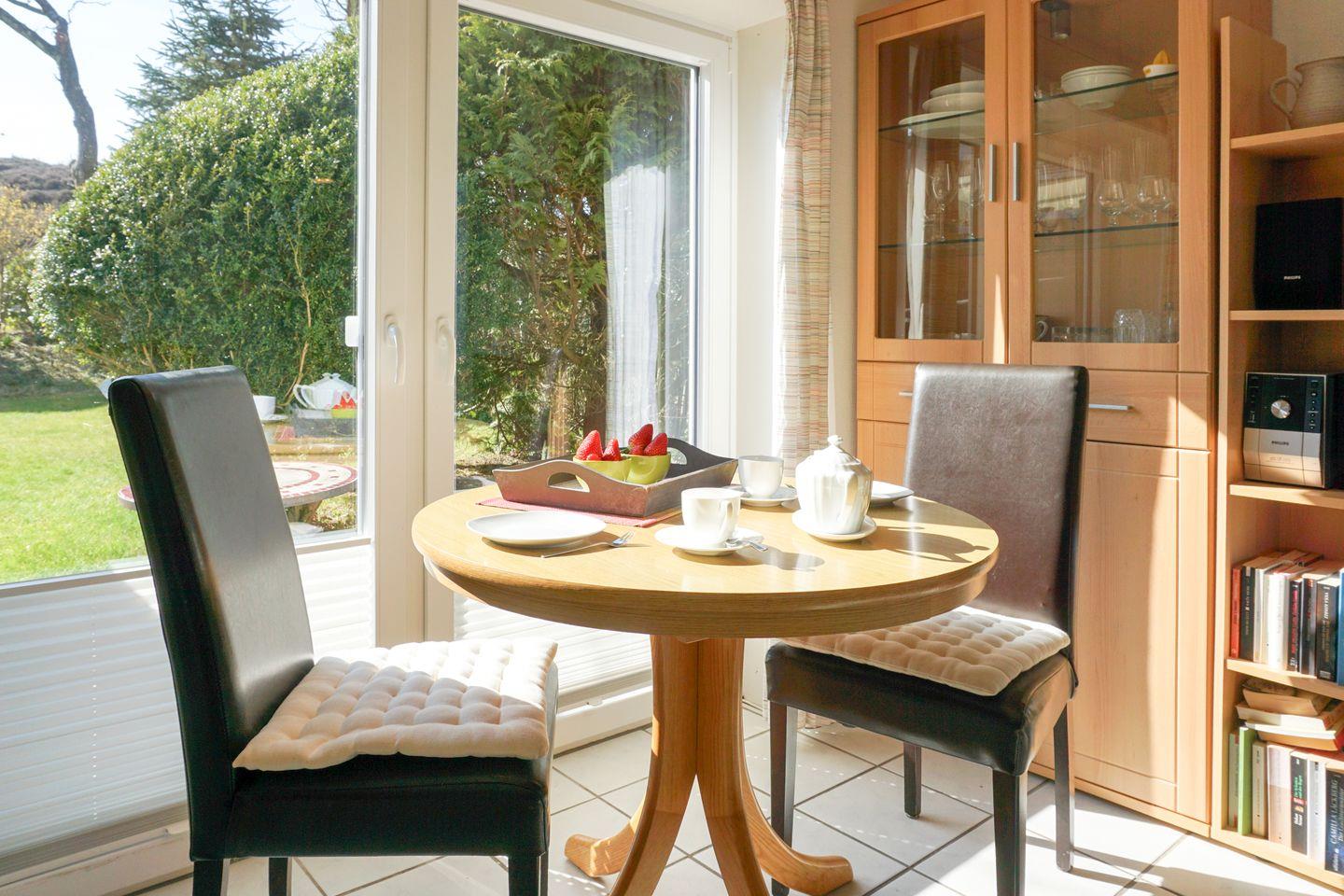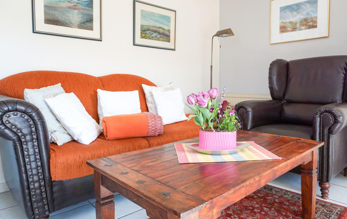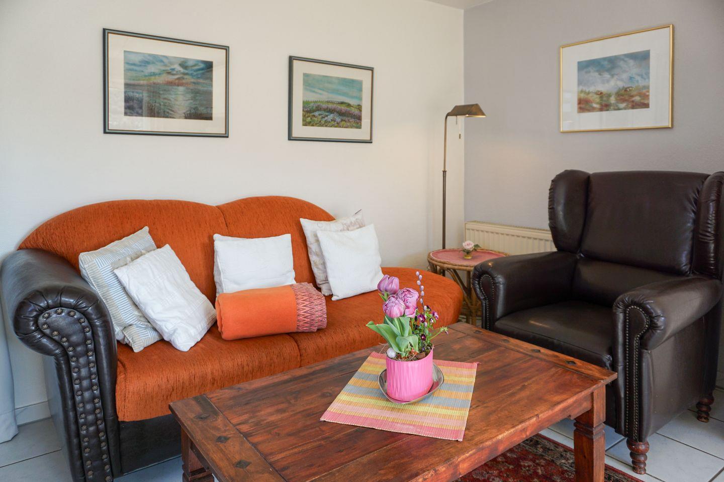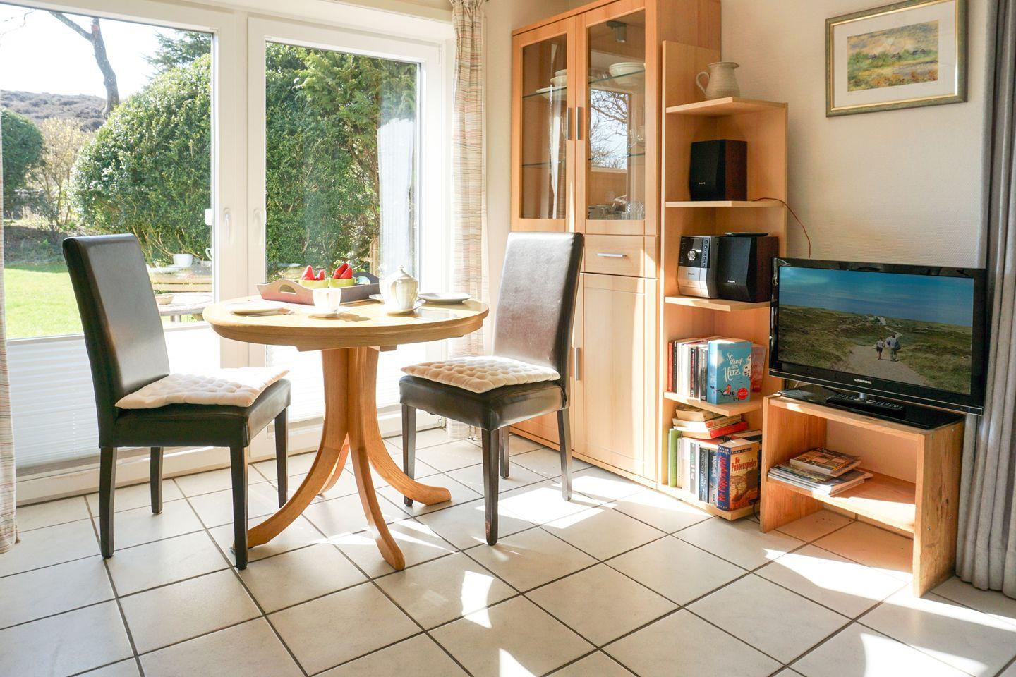 Im Innenbereich überzeugt „Westwärts“ durch eine funktionale Ausstattung. Das Wohnzimmer ist mit einem Sofa sowie einem Sessel eingerichtet, sodass Sie nach einem Tag am Strand bequem entspannen können. Ein Esstisch bietet einen idealen Platz für gemeinsame Mahlzeiten. Für Unterhaltung sorgen ein TV mit Satellitenanschluss, ein Radio und ein CD-Spieler.