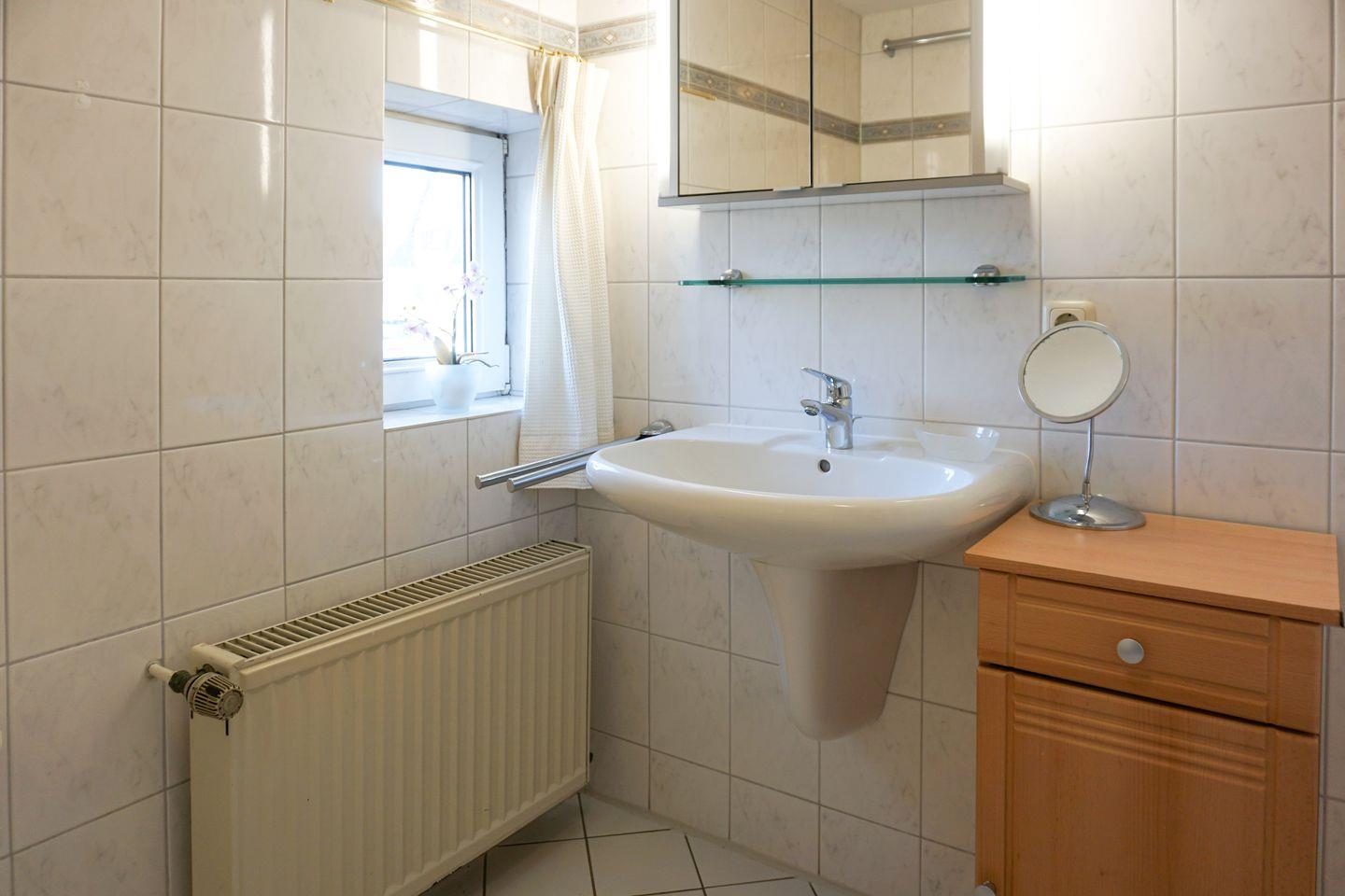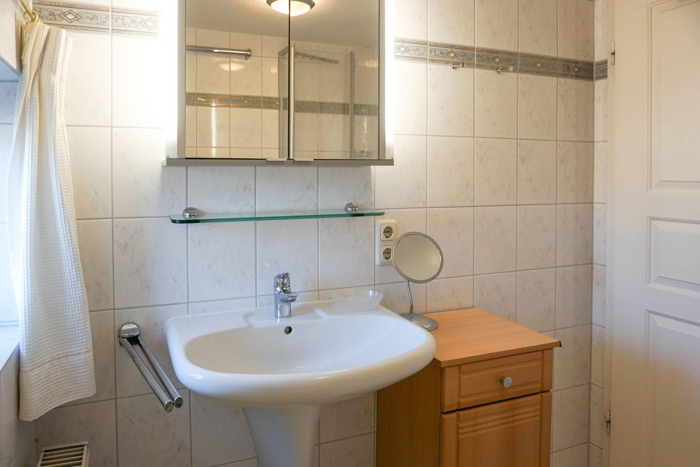 Das Badezimmer ist mit einer Dusche, Waschbecken, WC, Spiegel und Kosmetikspiegel ausgestattet. Für zusätzlichen Komfort sind ein Fenster sowie ein Haartrockner vorhanden. Warmes Wasser ist selbstverständlich gegeben.