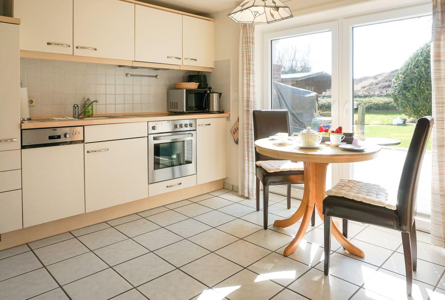 Die zum Wohnzimmer offen gestaltete Küche ist modern und umfassend ausgestattet. Ein Ceranherd, Backofen, Mikrowelle, Spülmaschine, Kühlschrank mit integriertem Gefrierfach, Wasserkocher, Kaffeemaschine sowie Küchenutensilien, Geschirr und Besteck lassen keine Wünsche offen – tägliches Kochen wird hier zum Vergnügen. Ein Staubsauger steht ebenfalls bereit, damit Sie es auch während längerer Aufenthalte stets sauber und ordentlich haben.