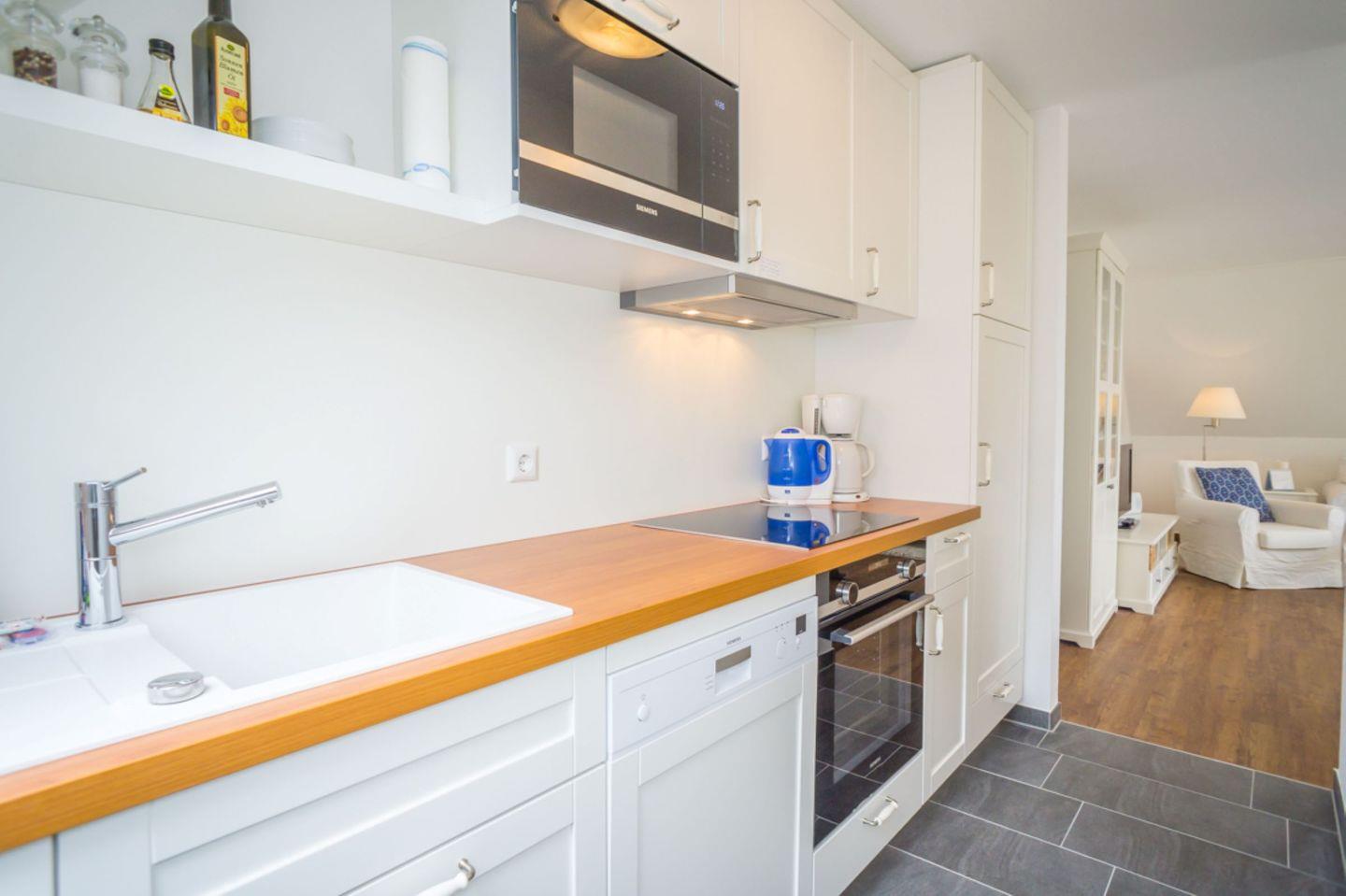Die Küche ist vollständig ausgestattet und lässt keine Wünsche offen. Hier stehen Ihnen unter anderem ein Ceranherd, Backofen, Mikrowelle, Spülmaschine, Kühlschrank, Toaster, Kaffeemaschine, Wasserkocher sowie Geschirr und Besteck zur Verfügung. Damit können Sie sich unabhängig und komfortabel verpflegen. Ein großzügiger Esstisch lädt dazu ein, gemeinsam Mahlzeiten einzunehmen. Auch ein Sessel und ein gemütliches Sofa stehen zum Entspannen bereit.