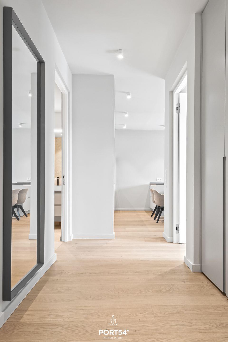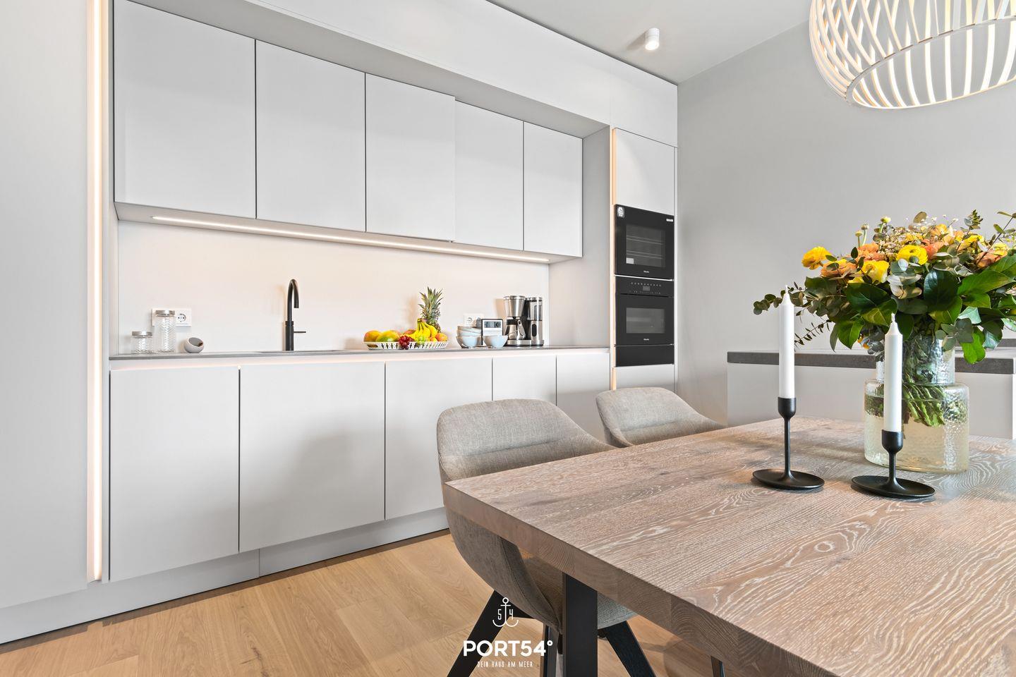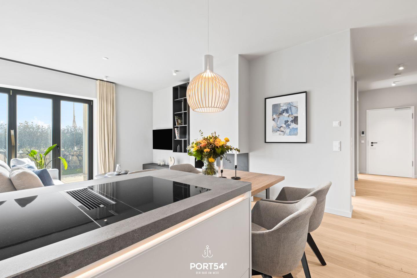 Die Wohnung verfügt über zwei gemütliche Schlafzimmer, die mit viel Liebe zum Detail eingerichtet sind, um dir einen erholsamen Schlaf in jeweils einem gemütlichen Boxspringbett der Marke Schramm (180x200cm) zu garantieren. Der offene Wohnbereich lädt zum Verweilen und Entspannen ein, ausgestattet mit einem komfortablen Sofa und einem Tisch für gemeinsame Essens- oder Spielemomente. Die offene SieMatic-Küche ist modern eingerichtet und bietet alles, was das Herz begehrt – von einer Induktionsplatte bis hin zu einer Spülmaschine, damit du alle Annehmlichkeiten des alltäglichen Lebens genießen kannst. Außerdem findest du in der Küche einen Quooker, der es dir ermöglicht, problemlos heißes Wasser sowie Sprudelwasser zu erzeugen.