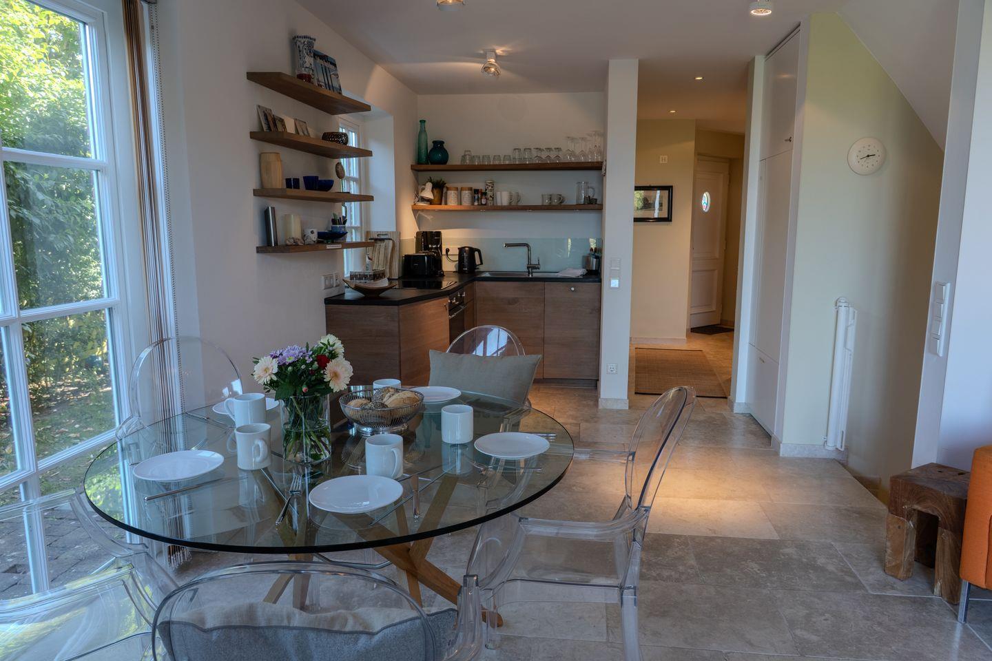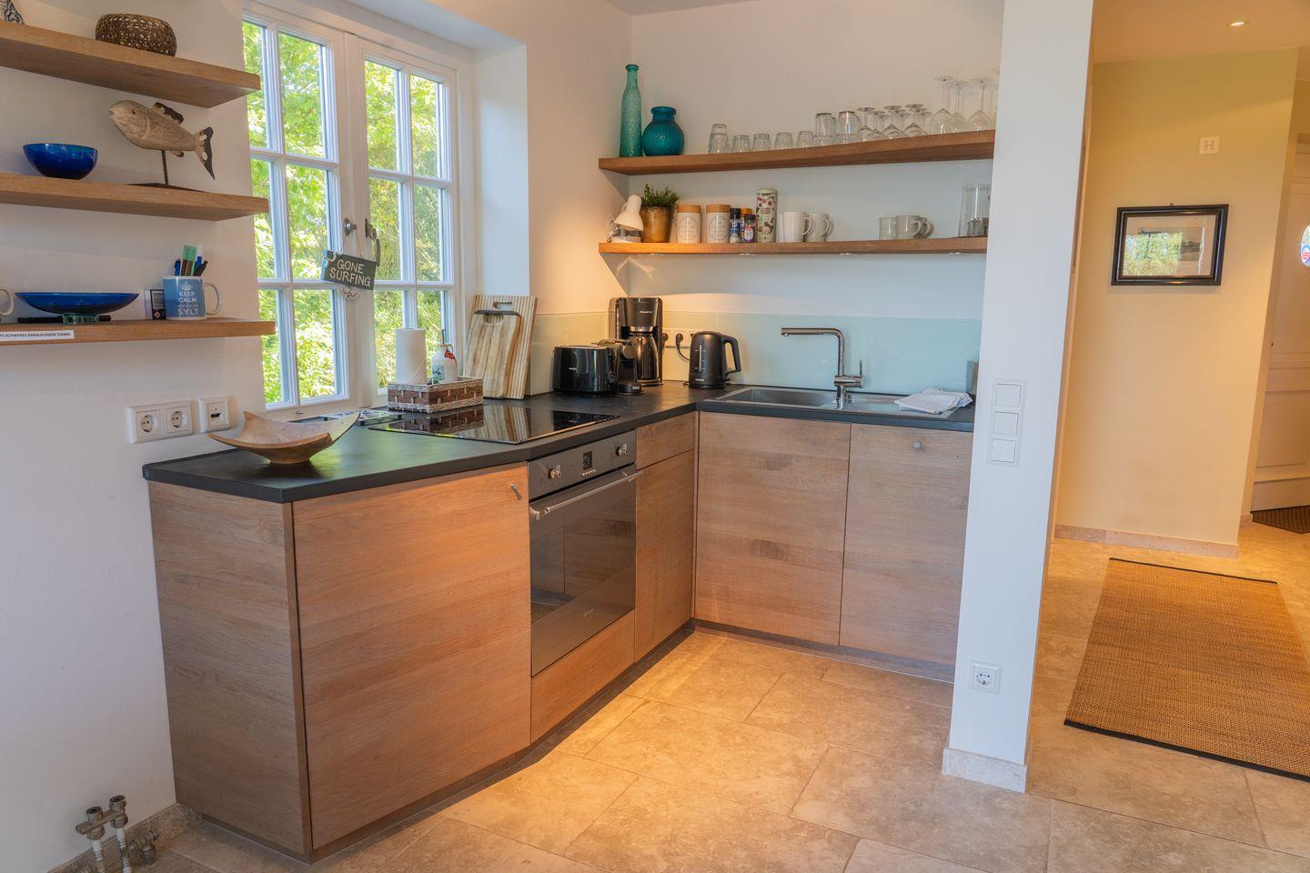 Die offene Küche grenzt direkt an das Wohnzimmer an und ist mit hochwertigen Geräten ausgestattet, die keine Wünsche offenlassen. Sie nutzen einen modernen Induktionsherd, einen Elektrobackofen sowie einen Geschirrspüler, eine Nespresso-Espressomaschine, Filterkaffeemaschine, Wasserkocher und einen Toaster. Ein Kühl-Gefrierfach und Küchenutensilien stehen selbstverständlich zur Verfügung.