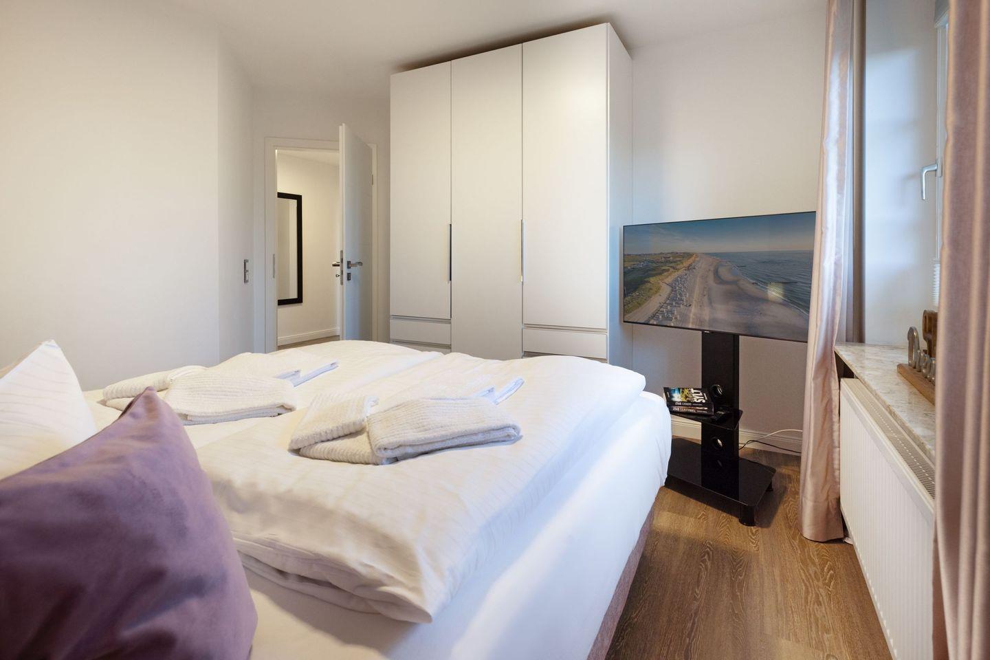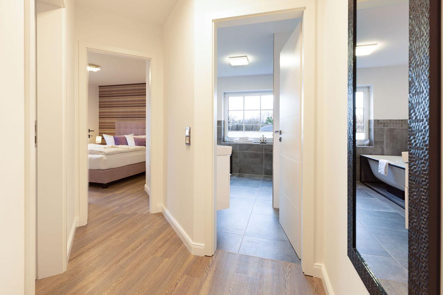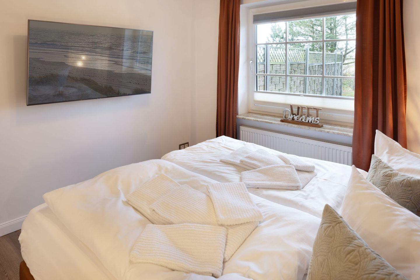 „Sea Breeze“ verfügt über zwei komfortable Schlafzimmer, jeweils mit hochwertigen Boxspring-Doppelbetten (180x200 cm und 160x200 cm), großzügigen Kleiderschränken und eigenen Flatscreens ideal für erholsame Nächte und ausreichend Privatsphäre. Das moderne Tageslichtbad überzeugt mit einer ebenerdigen Dusche sowie einer Badewanne und bietet höchsten Komfort. Ein zusätzliches Gäste-WC befindet sich im Eingangsbereich der Wohnung.