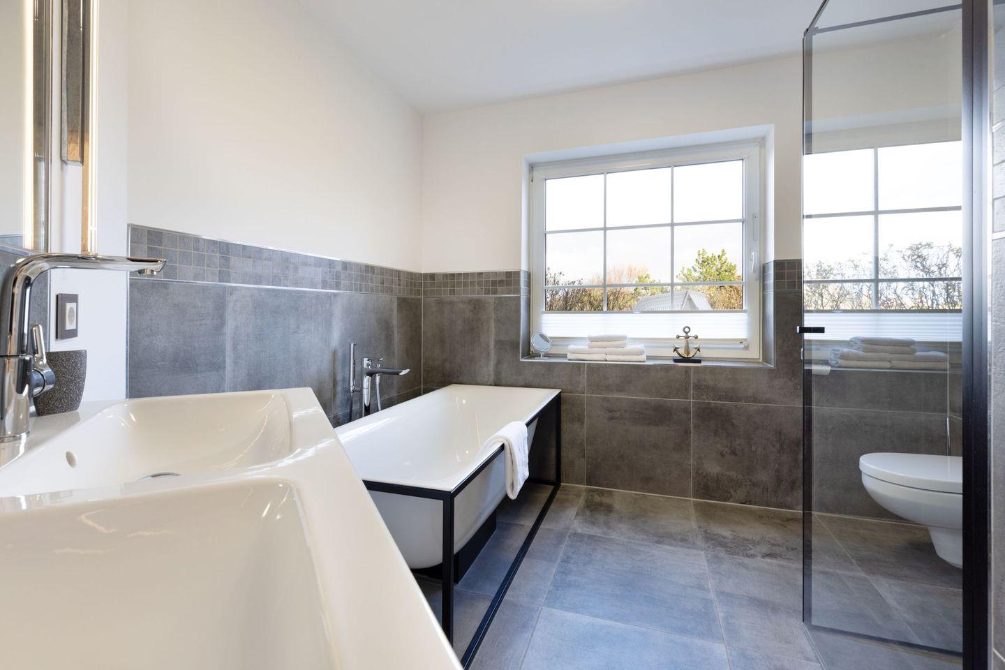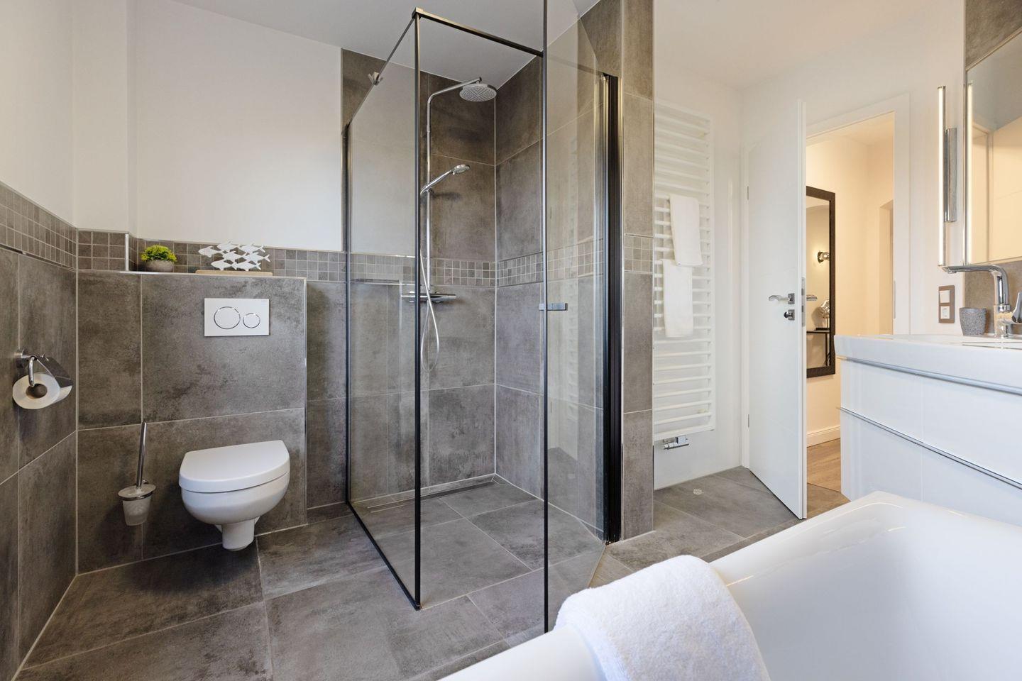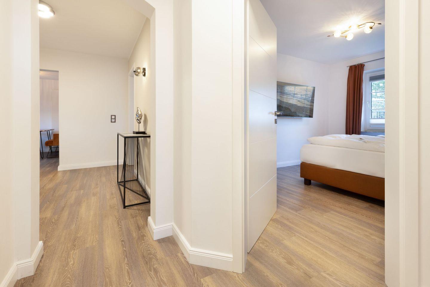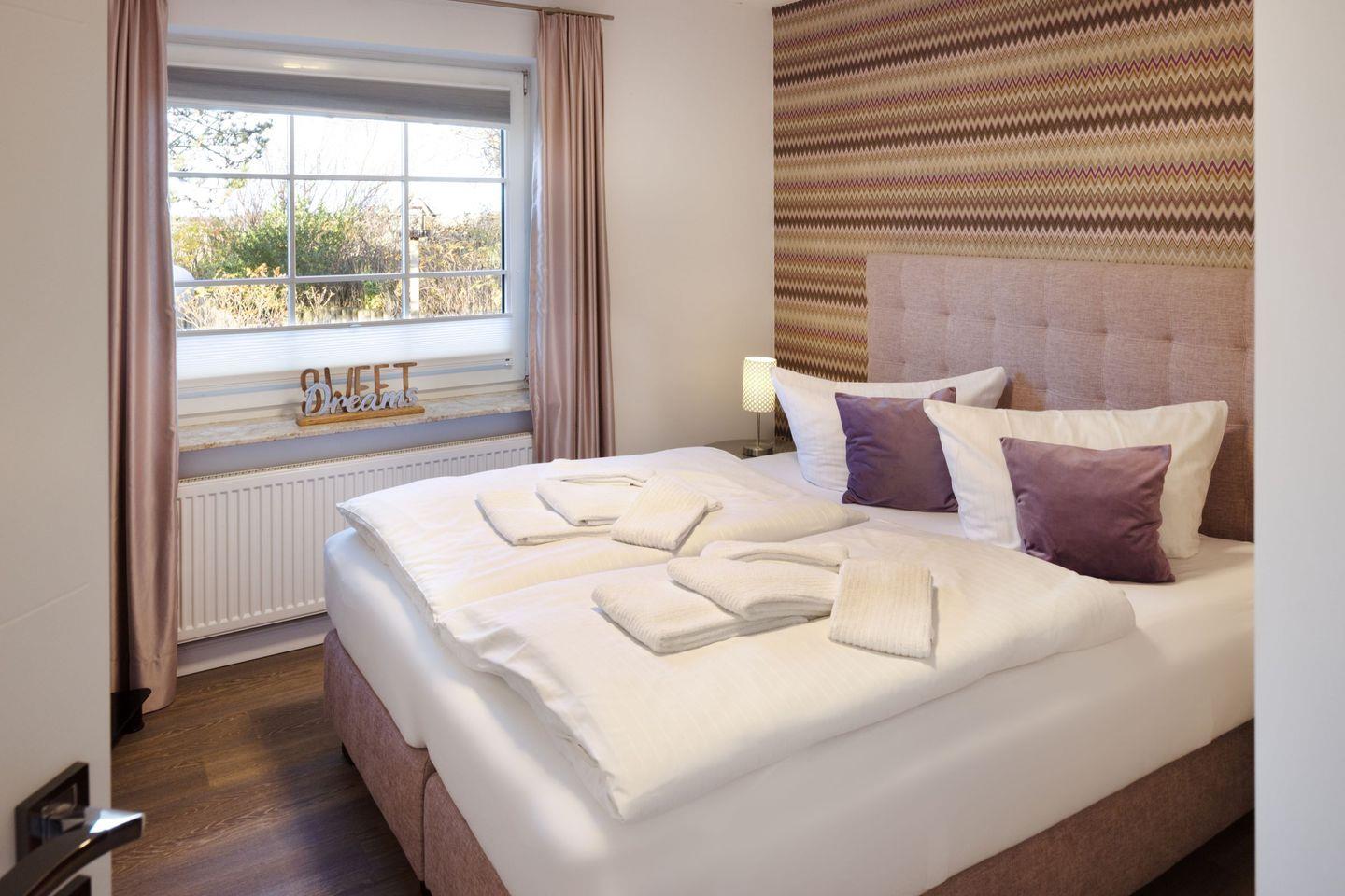 „Sea Breeze“ verfügt über zwei komfortable Schlafzimmer, jeweils mit hochwertigen Boxspring-Doppelbetten (180x200 cm und 160x200 cm), großzügigen Kleiderschränken und eigenen Flatscreens ideal für erholsame Nächte und ausreichend Privatsphäre. Das moderne Tageslichtbad überzeugt mit einer ebenerdigen Dusche sowie einer Badewanne und bietet höchsten Komfort. Ein zusätzliches Gäste-WC befindet sich im Eingangsbereich der Wohnung.