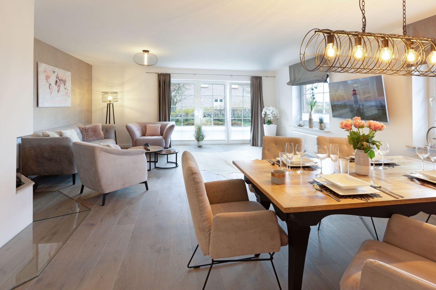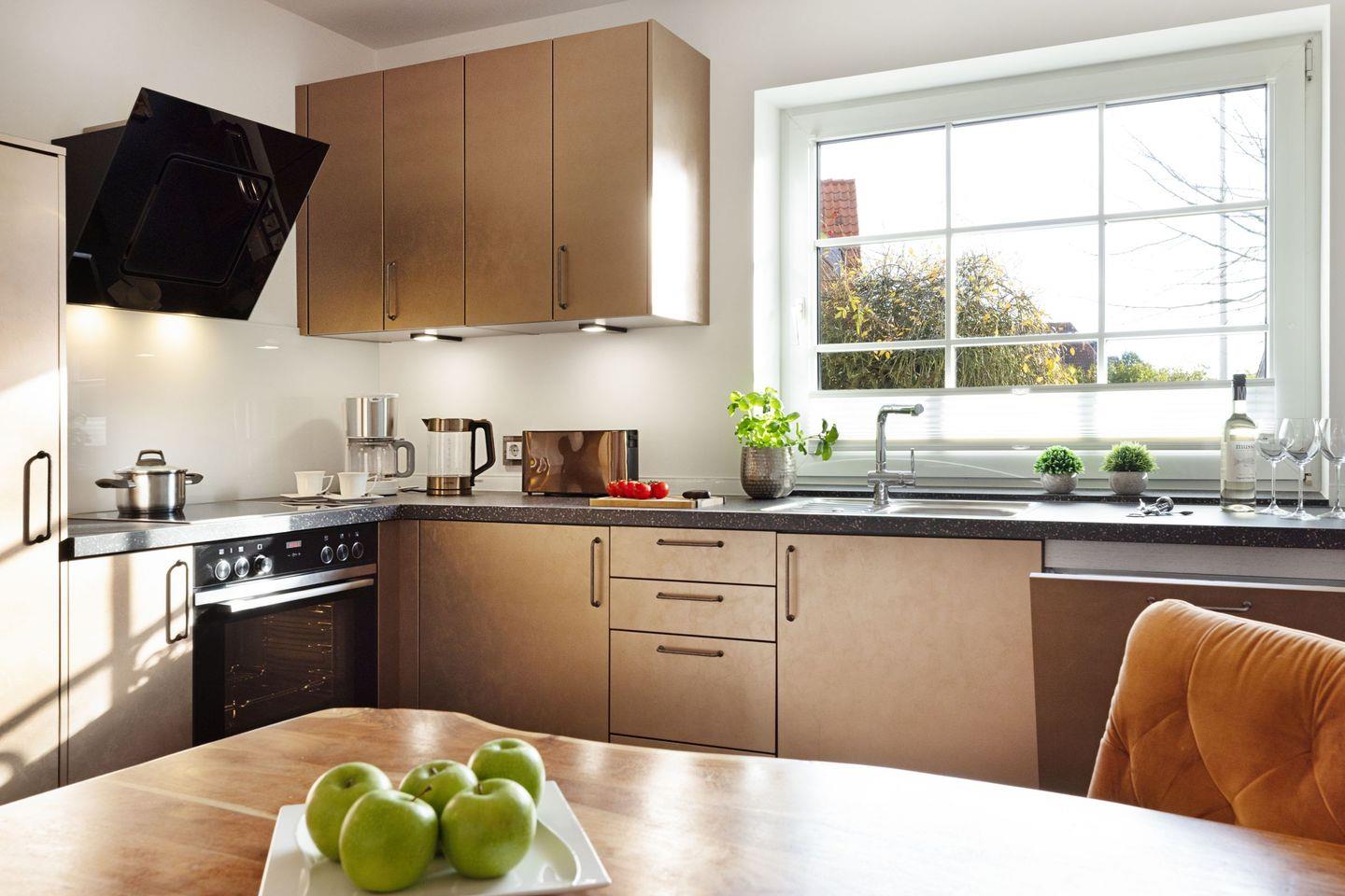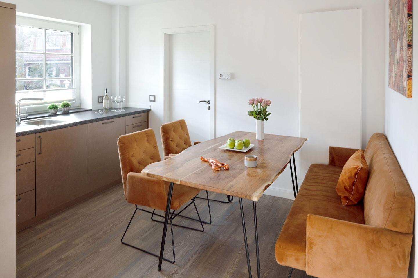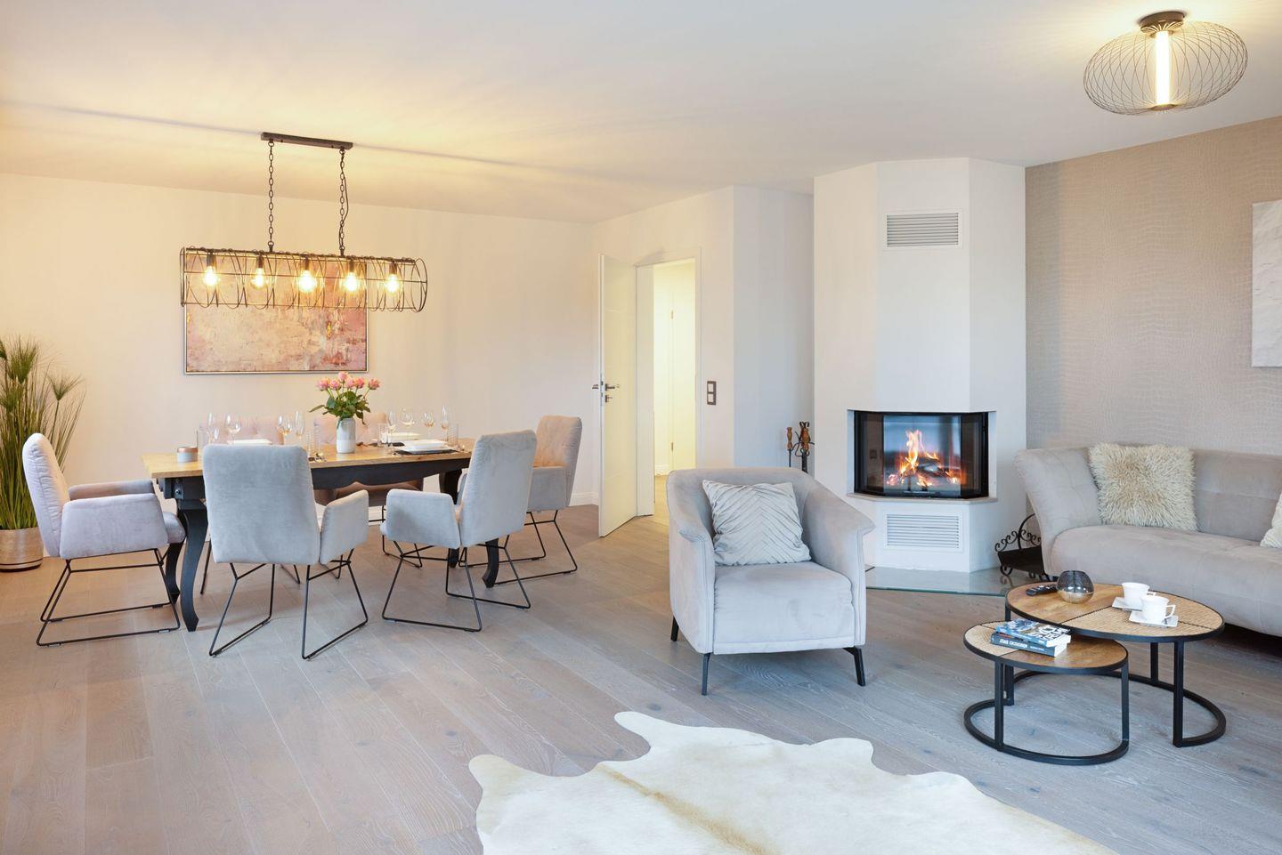 Der großzügige, lichtdurchflutete Wohn- und Essbereich bildet das Herzstück des Apartments. Hochwertiger Echtholzboden, ein gemütlicher Kamin sowie große Fensterfronten schaffen eine warme und einladende Wohnatmosphäre. Von hier aus genießen Sie nicht nur den direkten Zugang zur West-Terrasse und zum Garten, sondern auch einen einzigartigen Ausblick in die umliegende Natur. Die angrenzende, moderne Küche ist voll ausgestattet und lässt keine Wünsche offen ideal für entspannte gemeinsame Kochmomente.