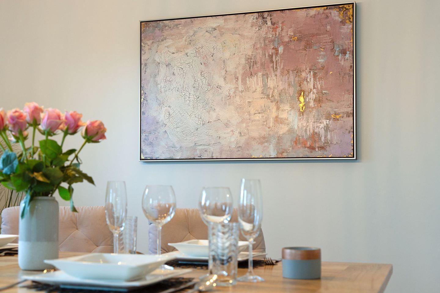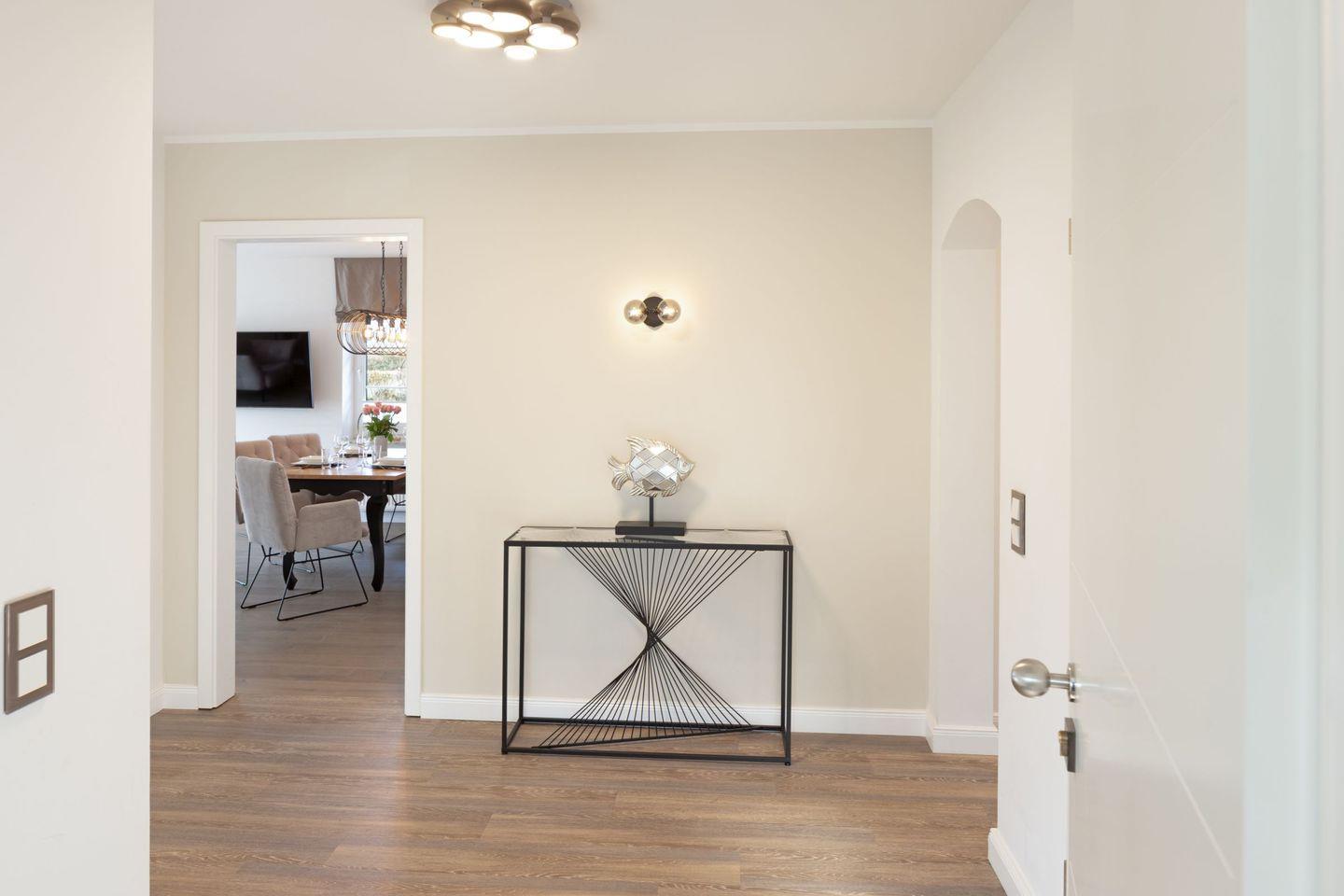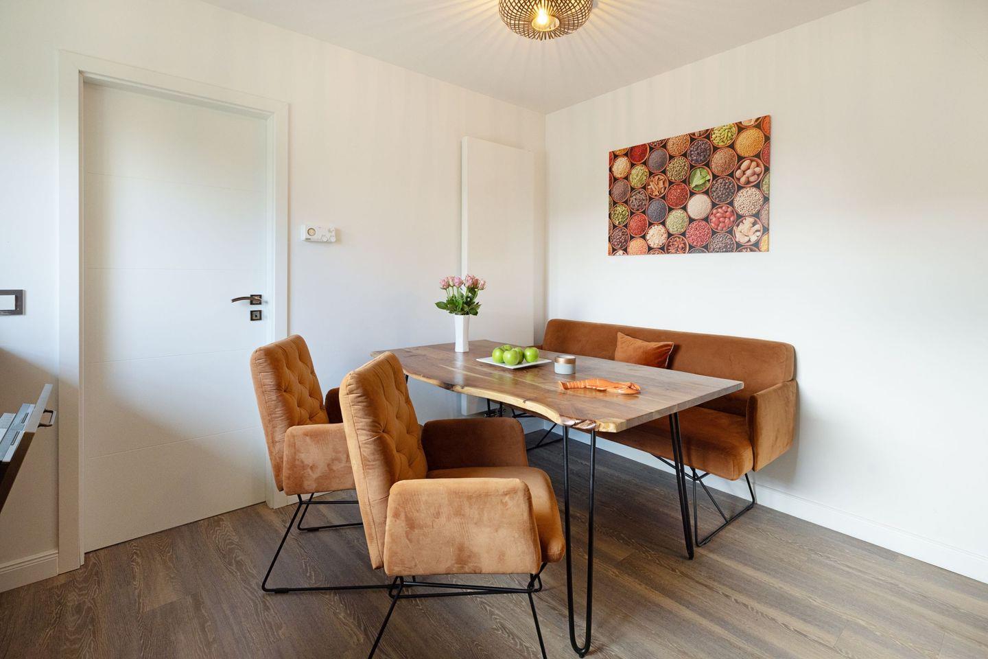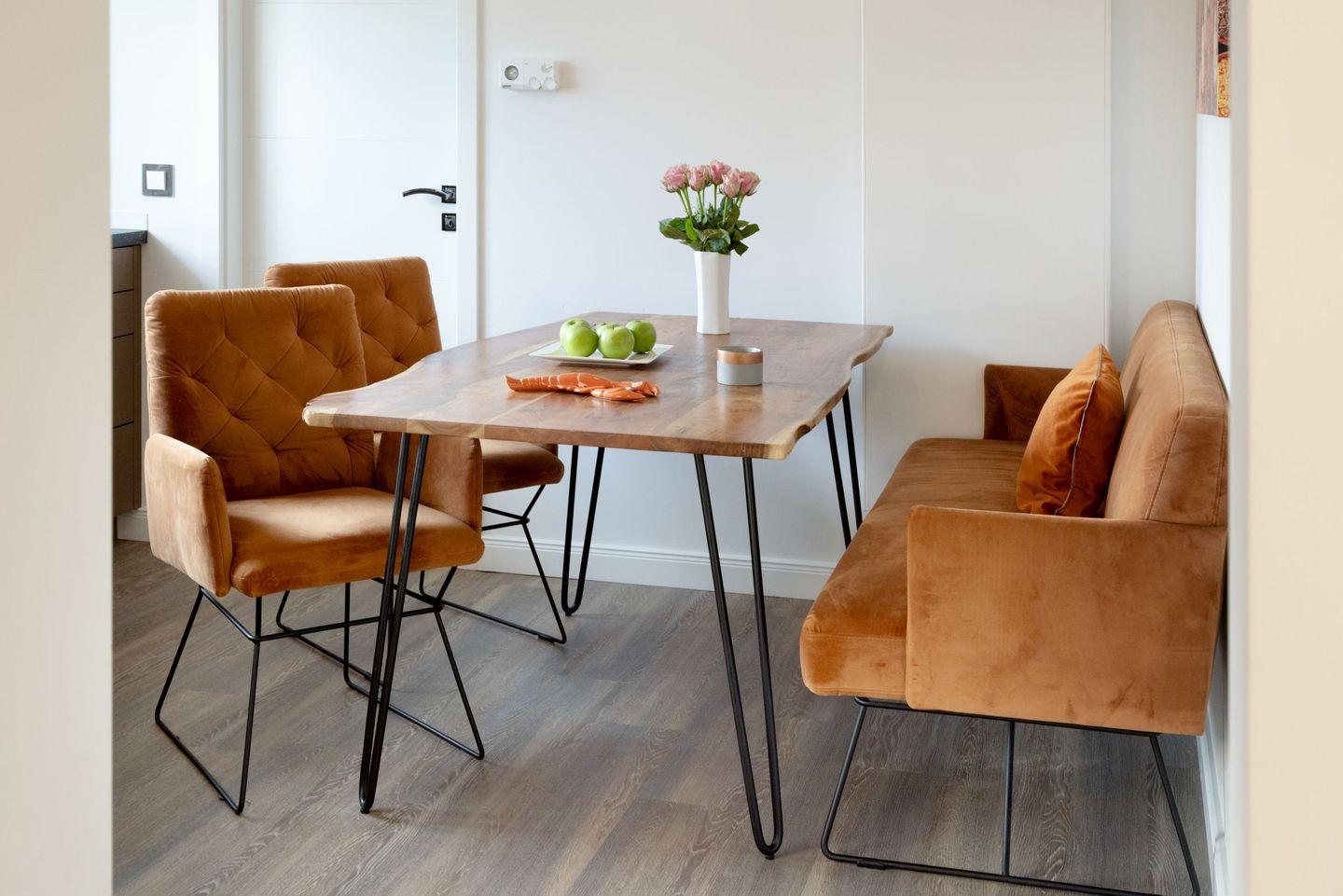 Der großzügige, lichtdurchflutete Wohn- und Essbereich bildet das Herzstück des Apartments. Hochwertiger Echtholzboden, ein gemütlicher Kamin sowie große Fensterfronten schaffen eine warme und einladende Wohnatmosphäre. Von hier aus genießen Sie nicht nur den direkten Zugang zur West-Terrasse und zum Garten, sondern auch einen einzigartigen Ausblick in die umliegende Natur. Die angrenzende, moderne Küche ist voll ausgestattet und lässt keine Wünsche offen ideal für entspannte gemeinsame Kochmomente.