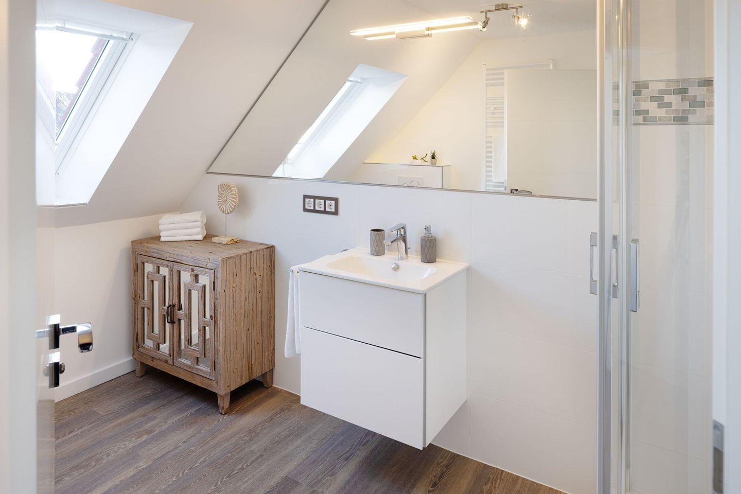 Das Appartement verfügt über zwei separate Schlafzimmer, jeweils mit Fernseher ausgestattet, und bietet damit ausreichend Platz und Komfort für Paare oder Familien. Das moderne Badezimmer mit Dusche ergänzt das Raumangebot und sorgt für zusätzlichen Wohnkomfort.