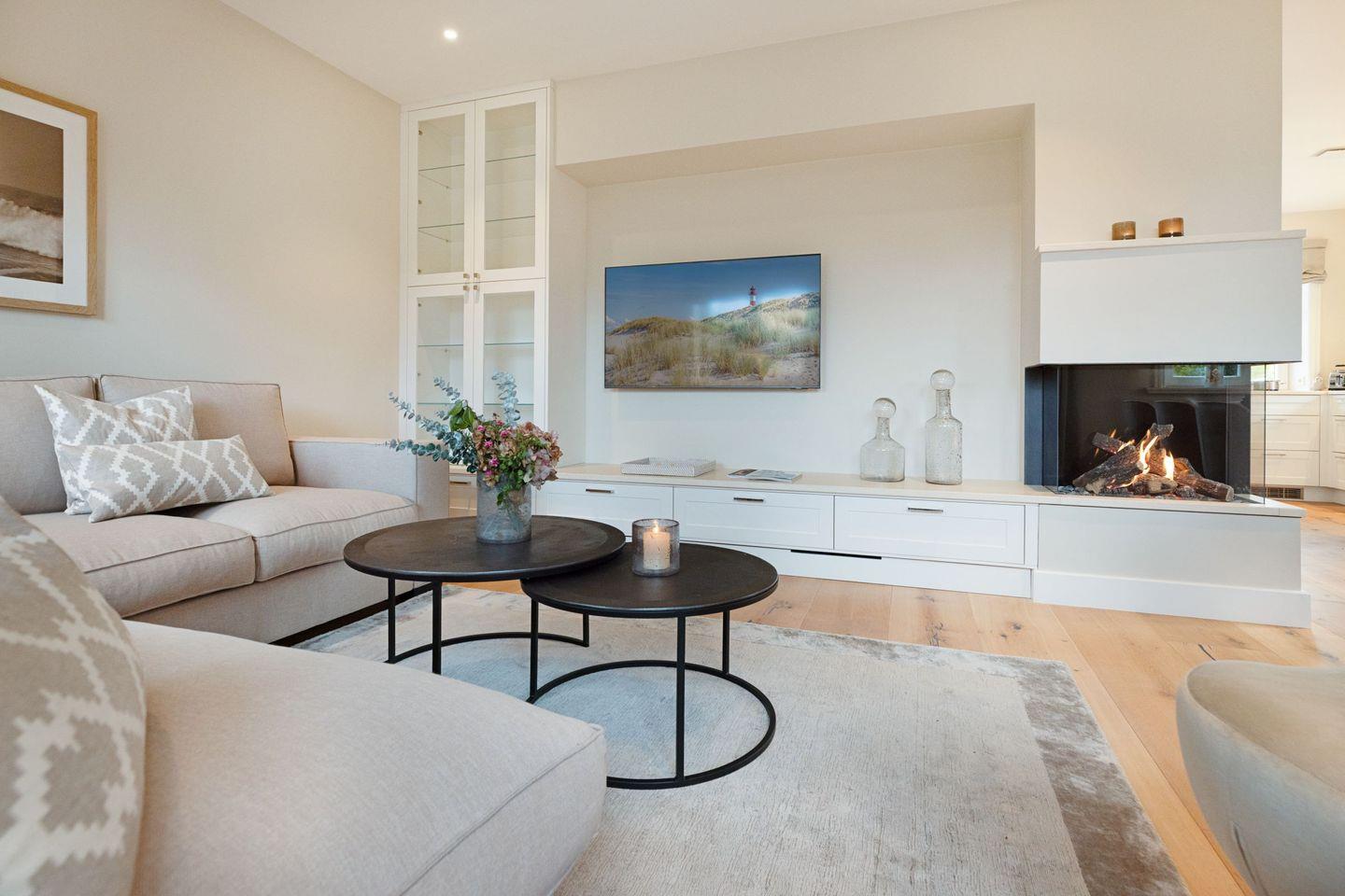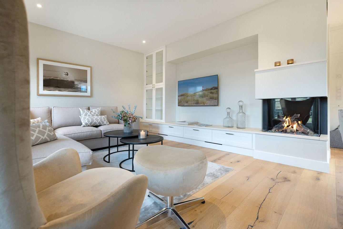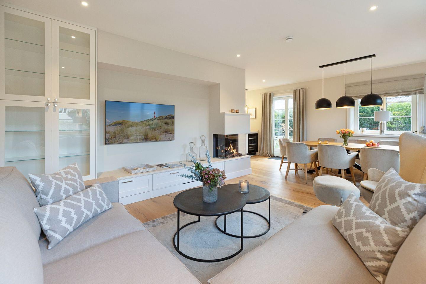 Der helle Wohnbereich mit Sofaecke, Gaskamin und Flachbild-TV lädt zum Entspannen ein. Die offene Küche ist komplett ausgestattet (Induktionsherd, Backofen, Spülmaschine, Nespresso).