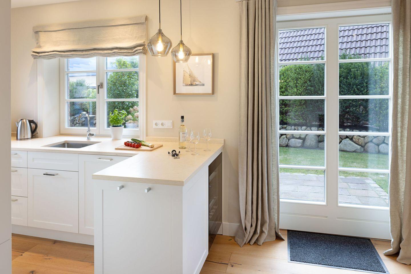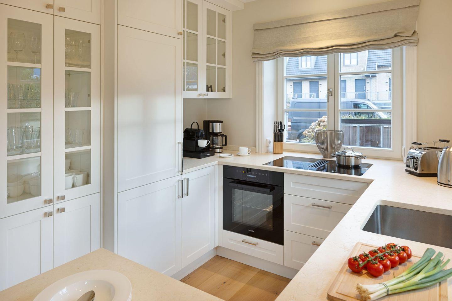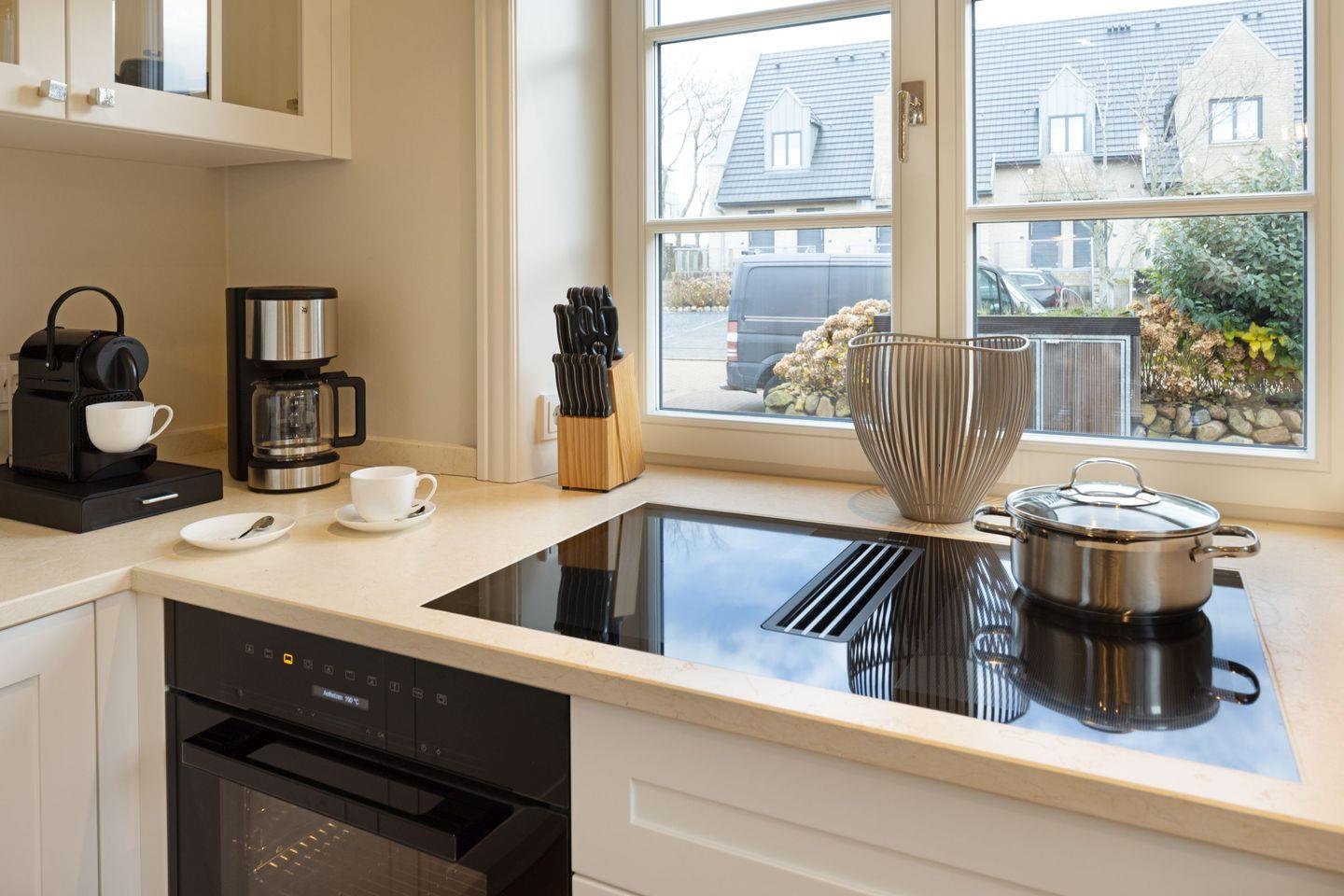 Der helle Wohnbereich mit Sofaecke, Gaskamin und Flachbild-TV lädt zum Entspannen ein. Die offene Küche ist komplett ausgestattet (Induktionsherd, Backofen, Spülmaschine, Nespresso).