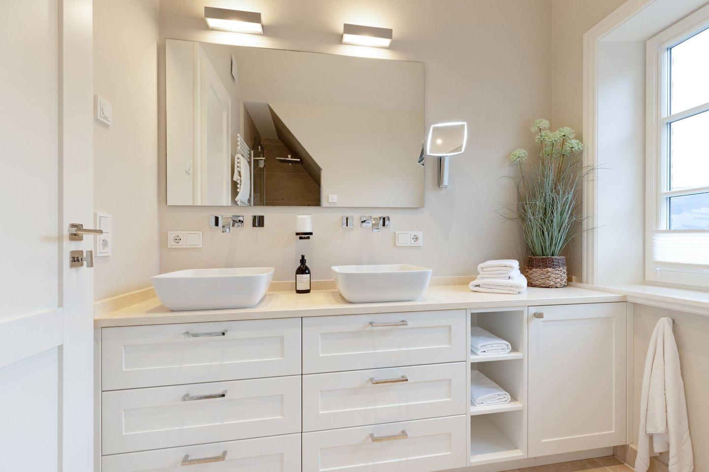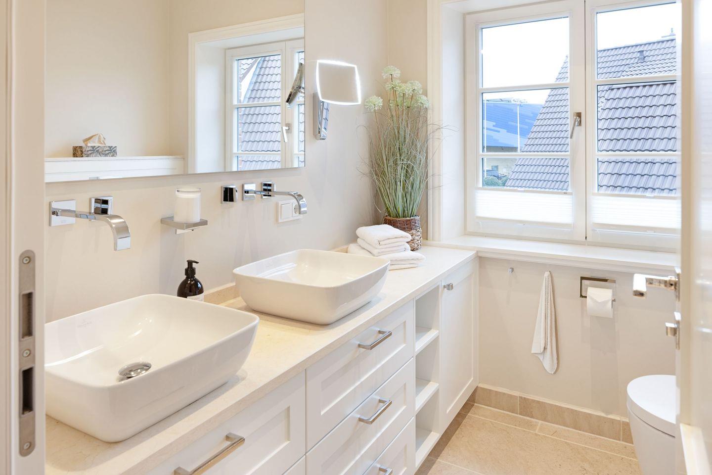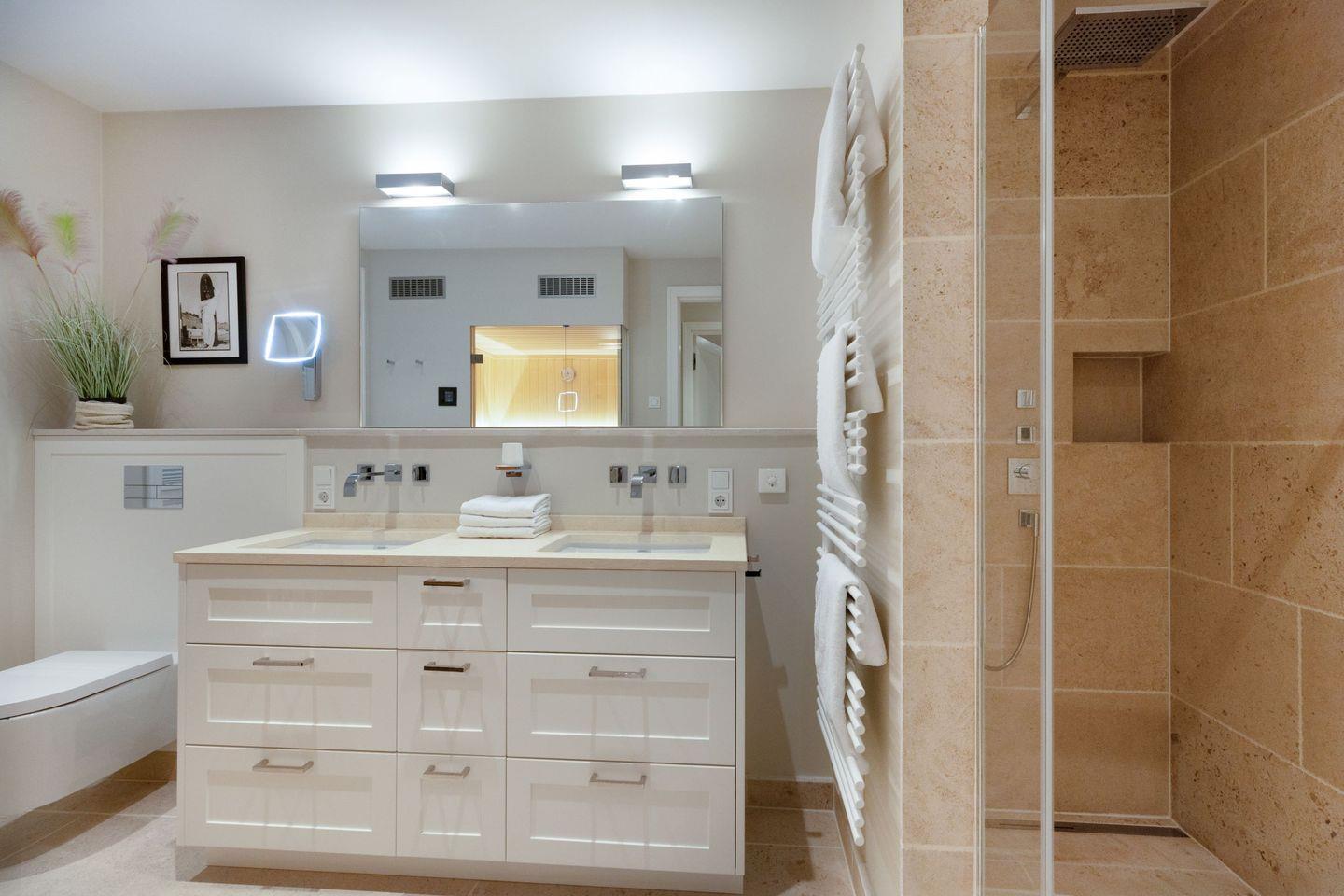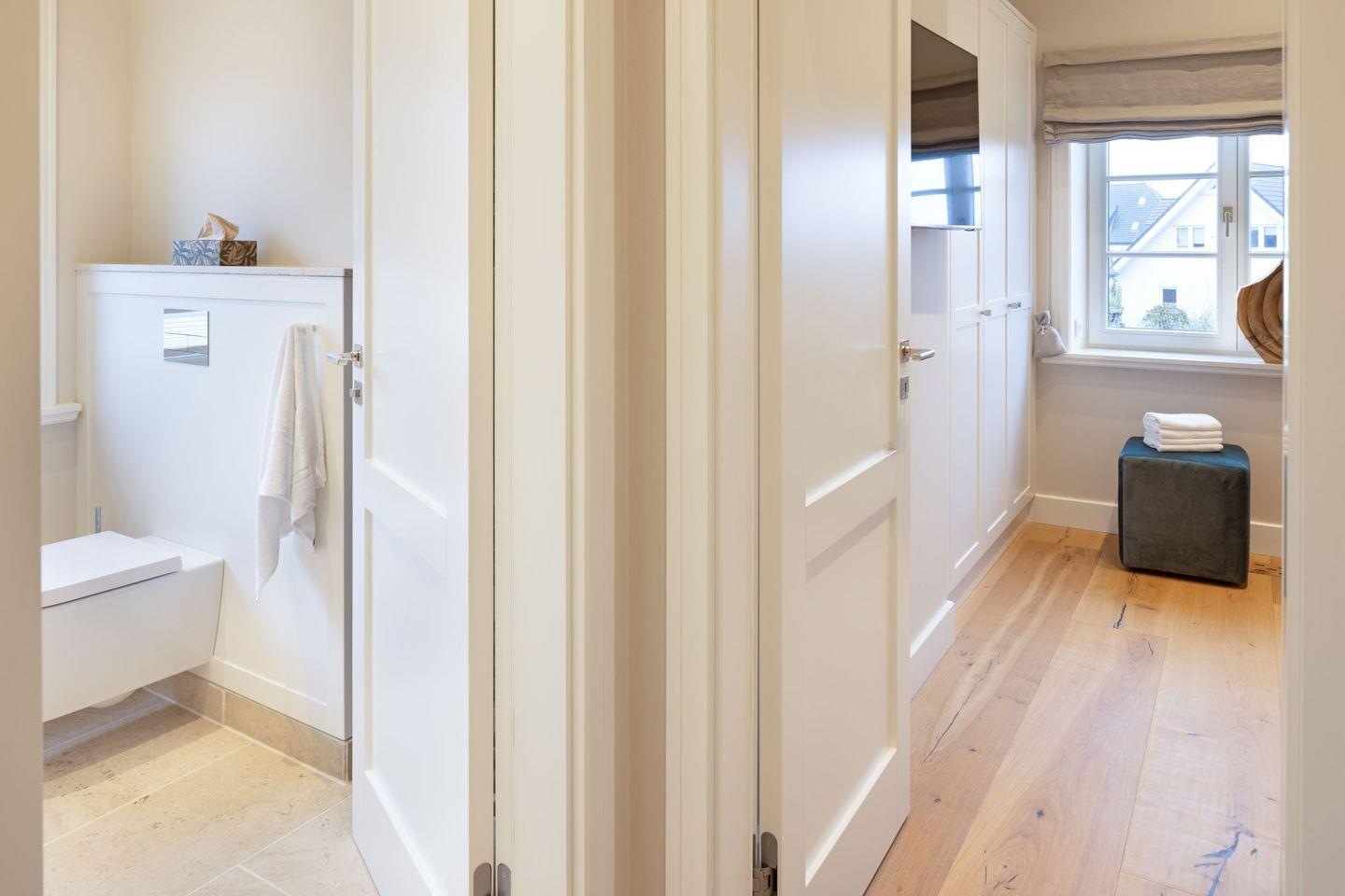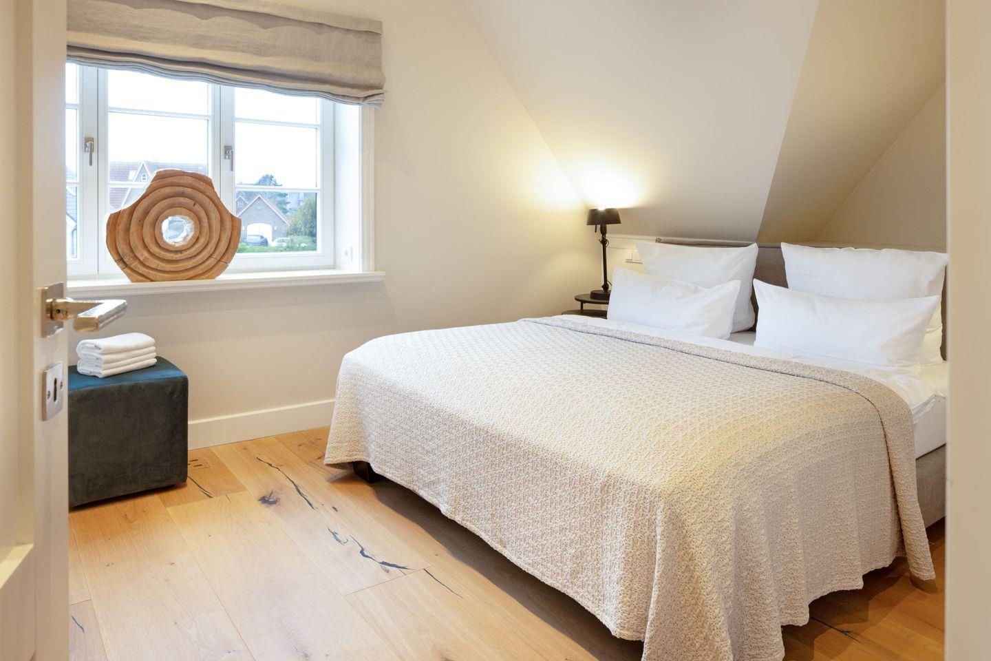 Vier Schlafzimmer mit Boxspring-Doppelbetten, zwei Bäder und ein Gäste-WC garantieren Komfort für Familien und Gruppen.