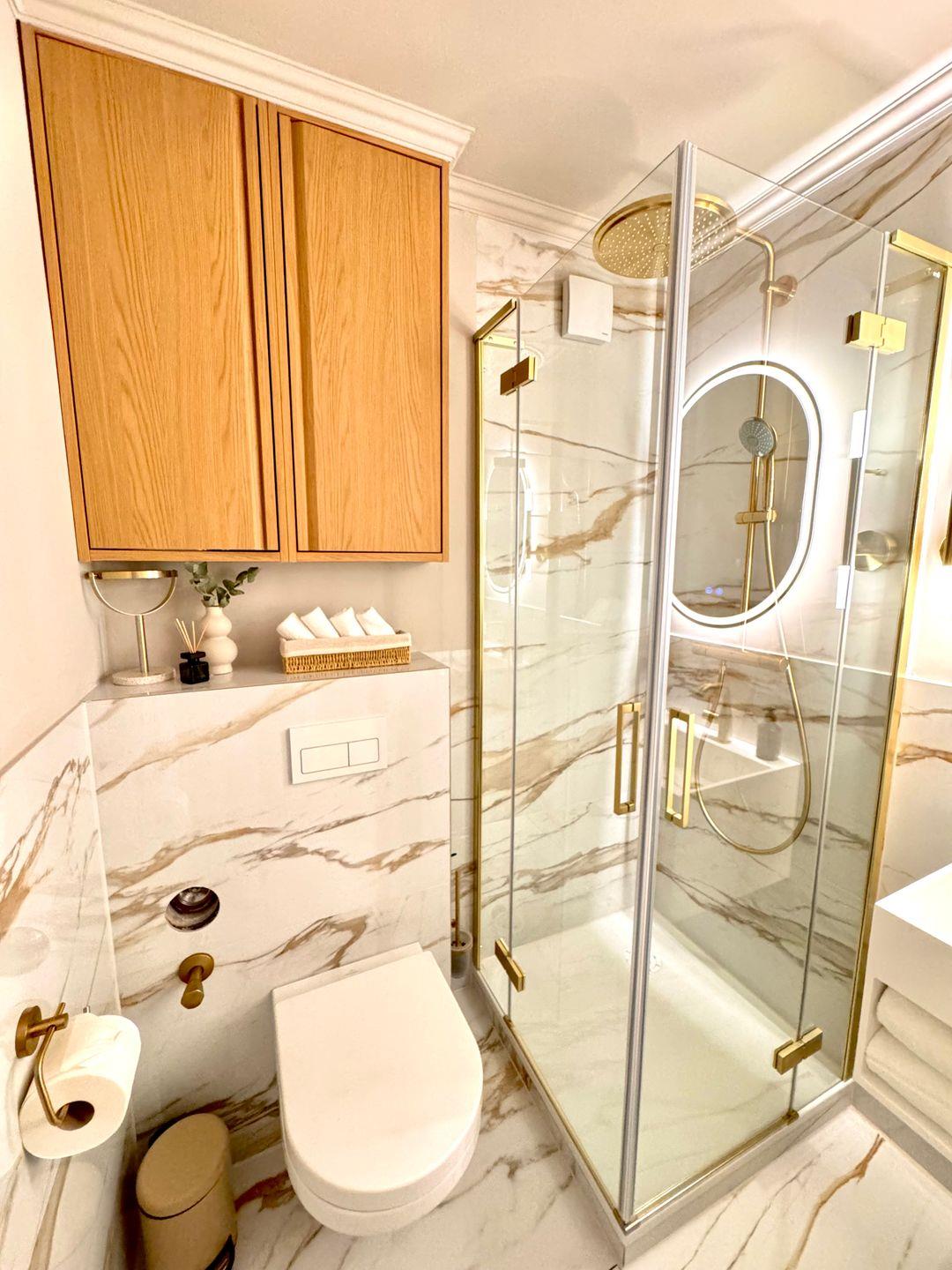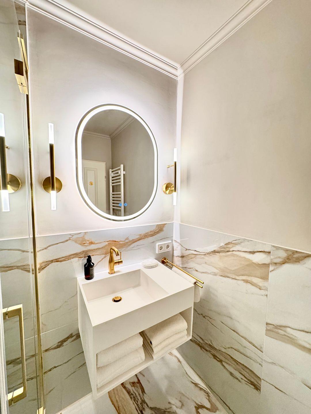 Im luxuriösen Badezimmer warten hochwertige Fliesen von Villeroy &?Boch und goldgebürstete Armaturen, die dem Raum eine elegante Note verleihen und das Wohlfühlerlebnis abrunden.