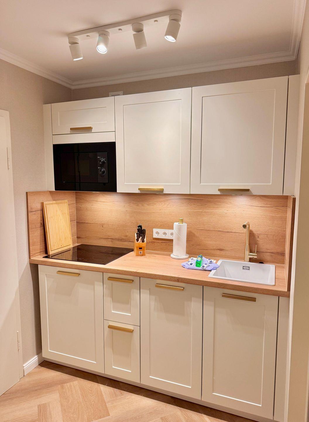 Der offen gestaltete Schlaf- Wohnbereich empfängt dich mit moderner Einrichtung, warmen Farben und großen Fenstern, die das Licht der Nordsee hereinlassen. Ob du in dem gemütlichen Sessel liest, beim Abendessen ein Glas Wein genießt oder im Bett einen Film auf dem großen 55 Zoll Fernseher schaust – hier wird jeder Moment zu etwas Besonderem. Die moderne, ausgestattete Küche bietet alles, was du für eine komfortable Selbstversorgung brauchst: Induktionskochfeld, Spülmaschine, Mikrowelle, Kühlschrank mit Gefrierfach, Wasserkocher, Toaster und eine Nespressomaschine für deinen perfekten Start in den Tag.