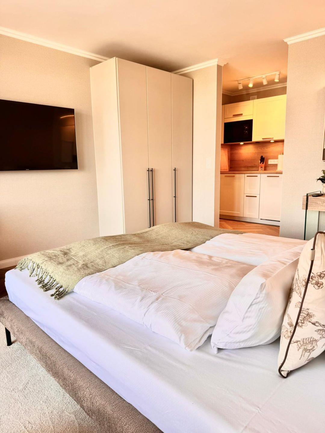 Nur 1 Minute zu Fuß bis zum Strand: Dein stilvolles 30 m² Feriendomizil für bis zu 2 Personen mit Balkon und Blick aufs Meer, Dünen und idyllische Reetdächer. Die moderne Küche mit Induktionskochfeld, Spülmaschine und Mikrowelle bietet alles für eine komfortable Selbstversorgung. Im luxuriösen Badezimmer erwarten dich Villeroy & Boch-Fliesen und edle, Gold gebürstete Armaturen – perfekt für einen besonderen Aufenthalt am Meer.