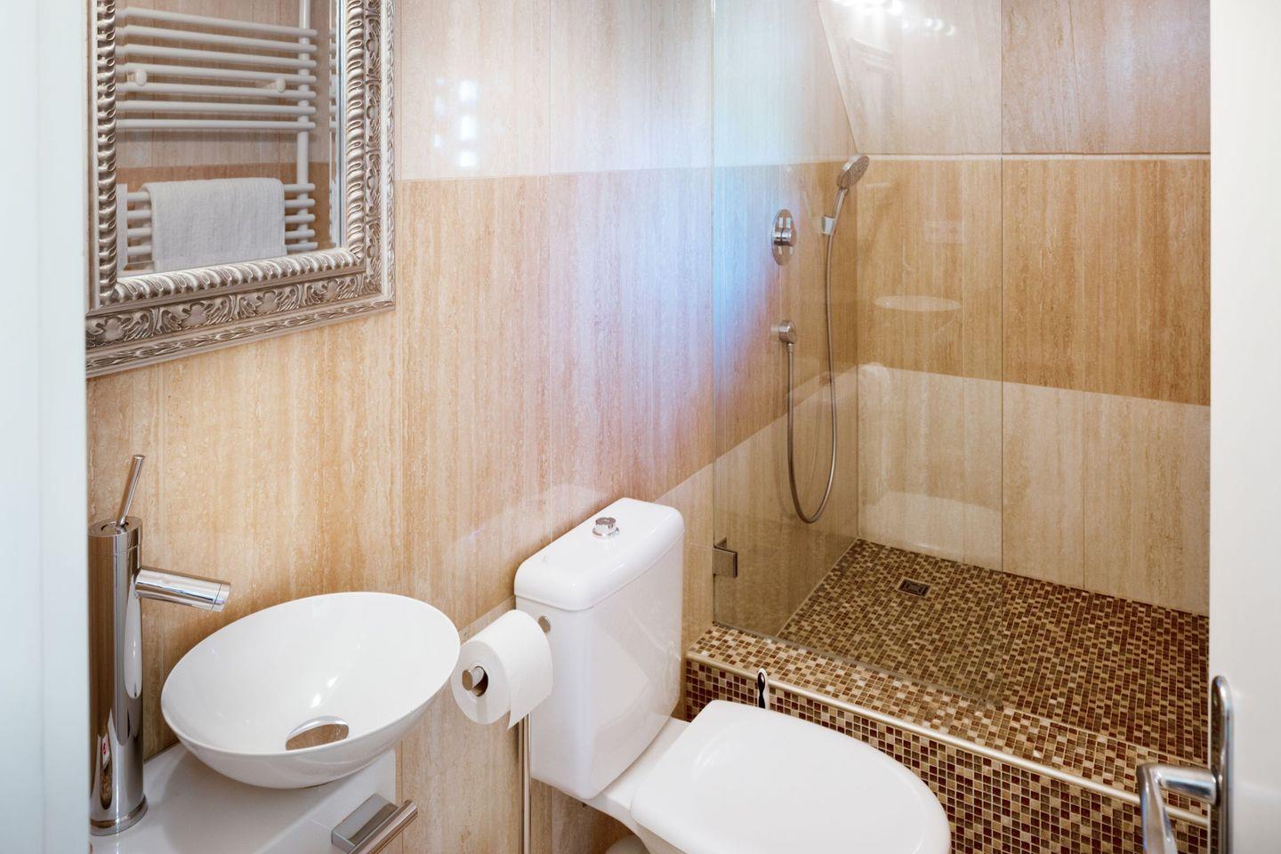 In der oberen Etage befinden sich zwei Schlafzimmer mit Doppelbetten und ein Zimmer mit einem Einzelbett sowie ein Wannenbad.