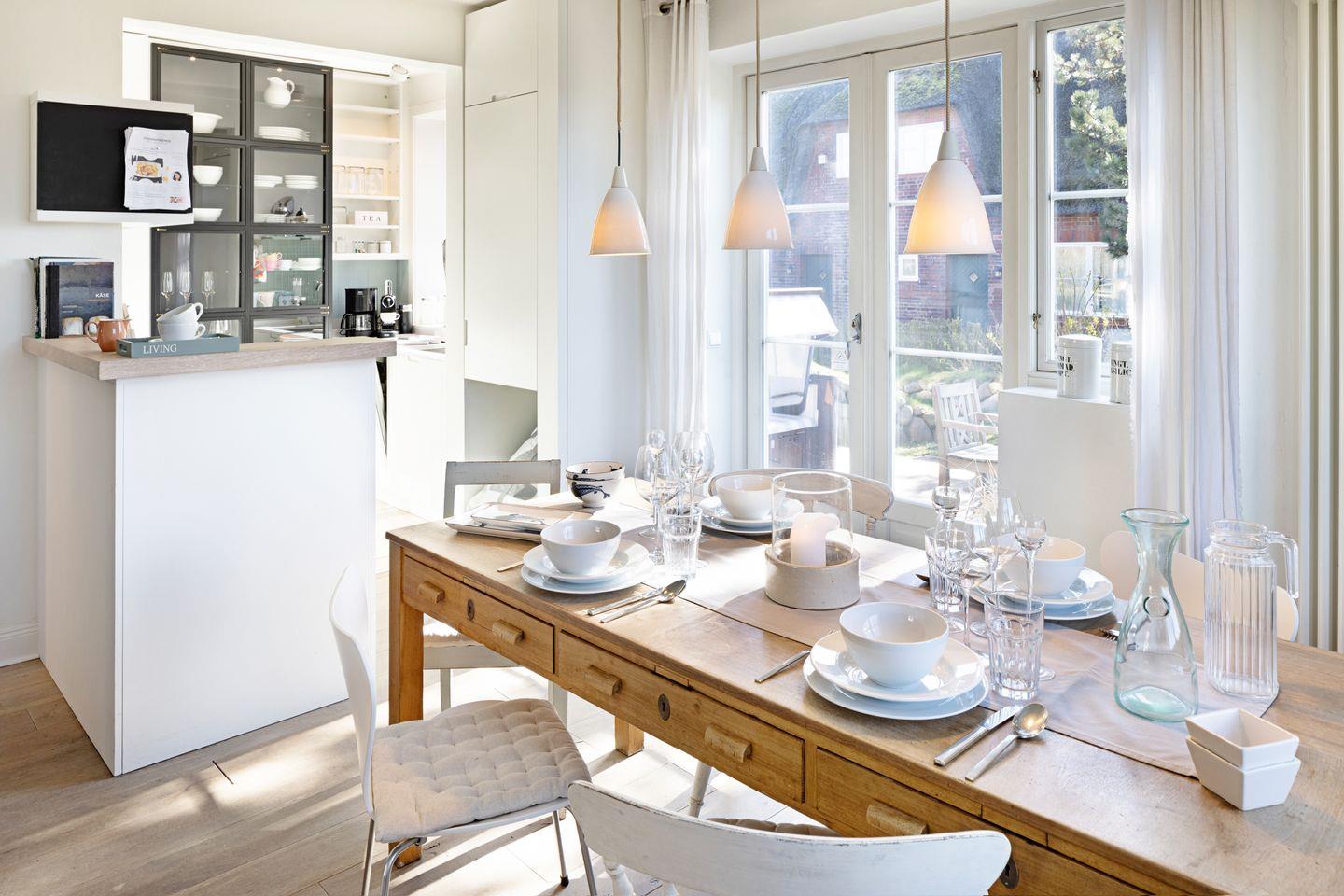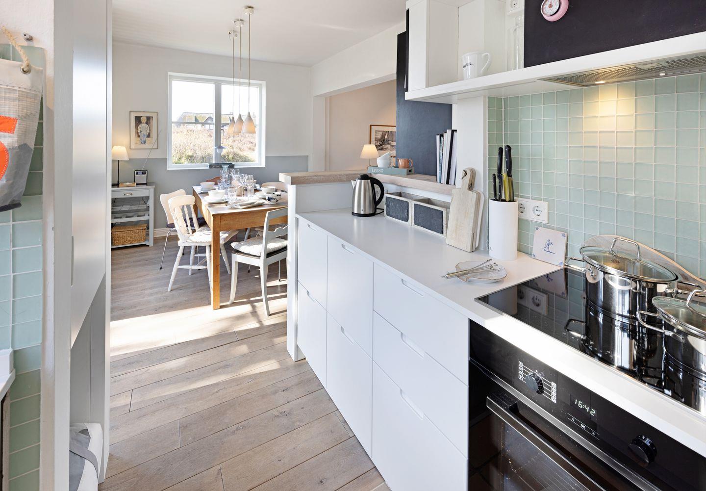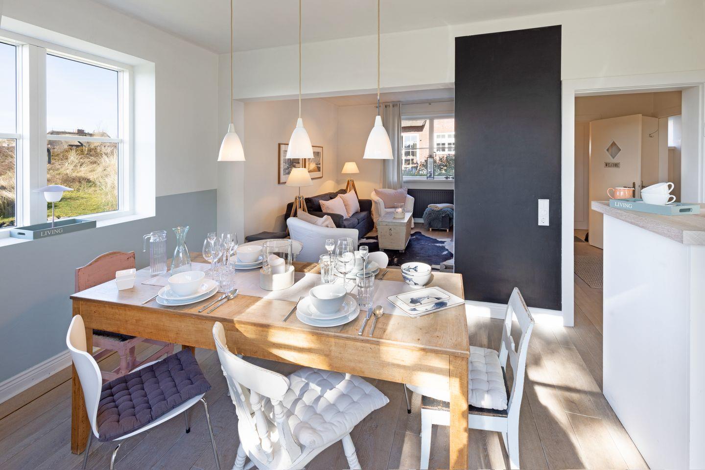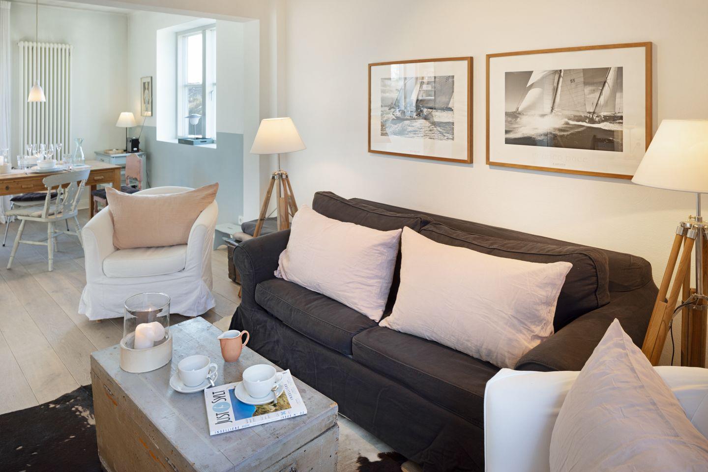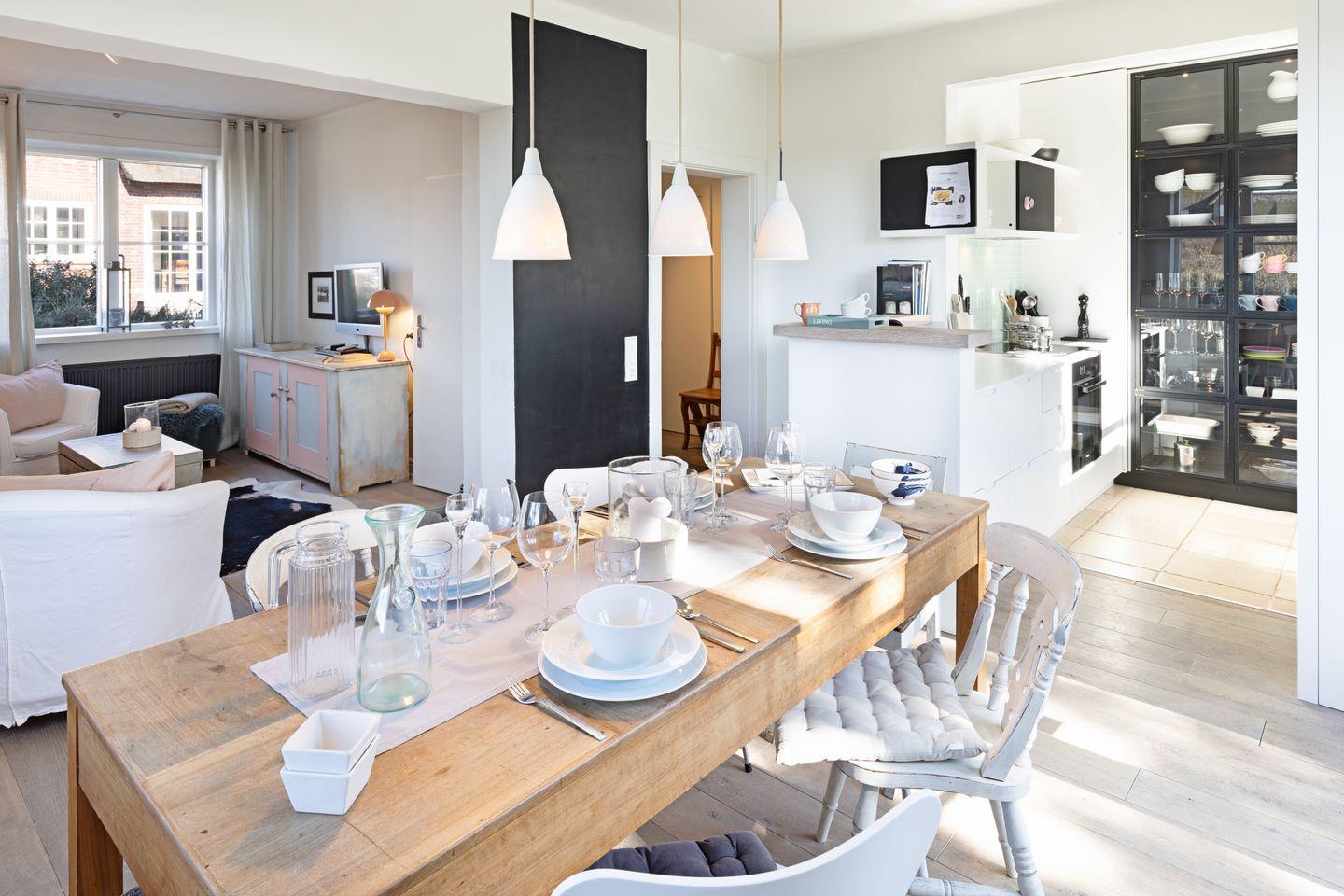 Die hellen Räume überzeugen durch ein natürliches und hochwertiges Wohnkonzept. Gekalkte Eichendielen, feine Leinen-Gardinen sowie Wände in sanften Weiß- und Sandtönen verleihen dem Haus eine zeitlose, nordisch inspirierte Eleganz. In Küche, Bad und Flur sorgen edle Kalksteinböden für ein stimmiges Gesamtbild und unterstreichen den hochwertigen Charakter der Ausstattung. Sorgfältig ausgewählte Accessoires runden das stilvolle Ambiente ab und schaffen eine besondere Wohlfühlatmosphäre.