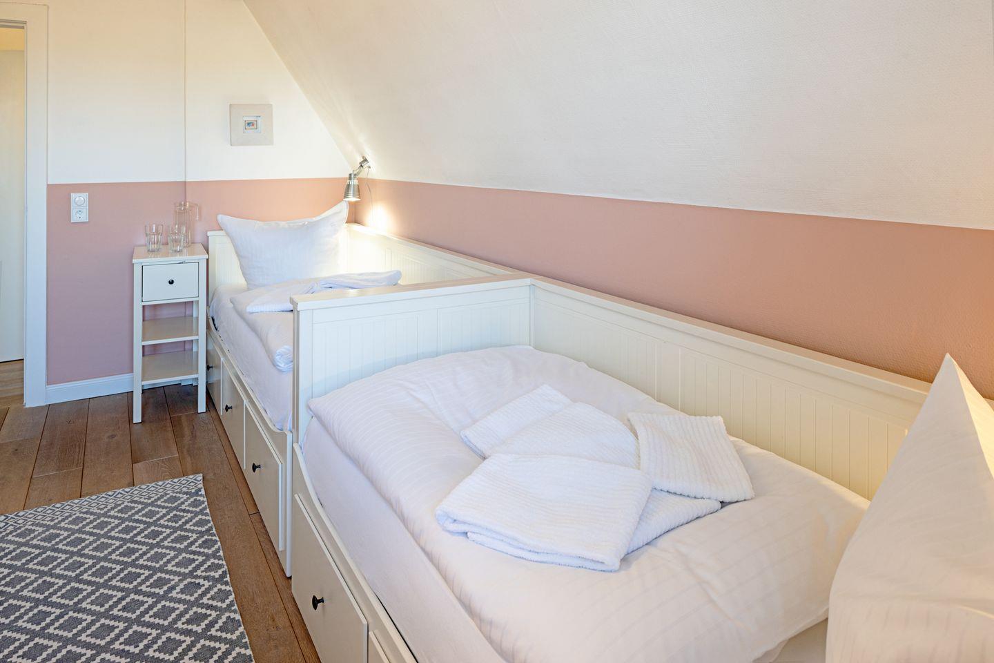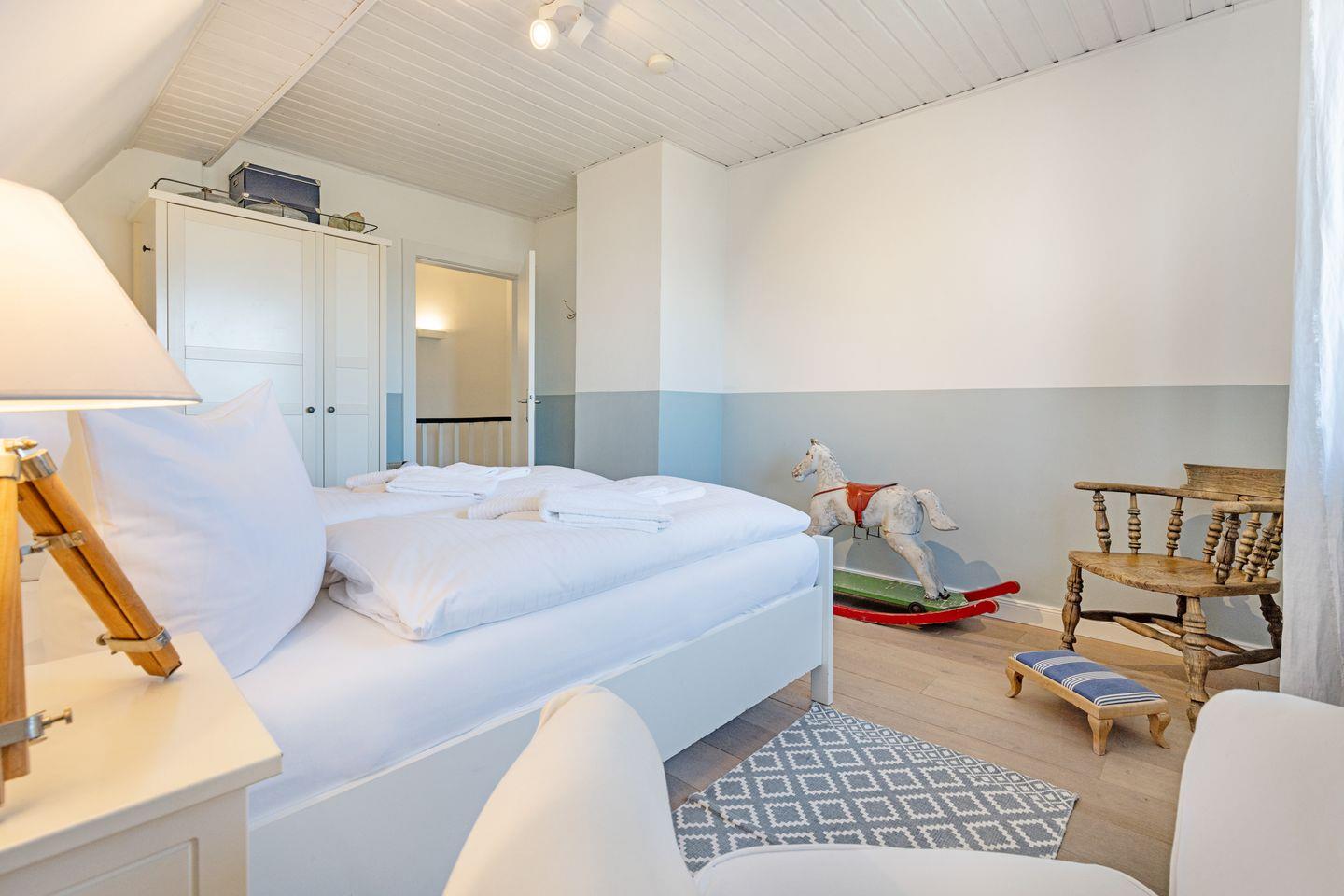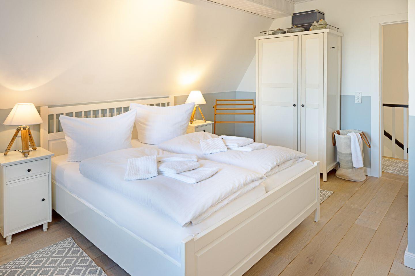 Im Obergeschoss befinden sich zwei gemütliche Schlafzimmer: ein Schlafzimmer mit Doppelbett sowie ein weiteres Zimmer mit zwei Einzelbetten ideal für Paare, kleine Familien oder Freunde.