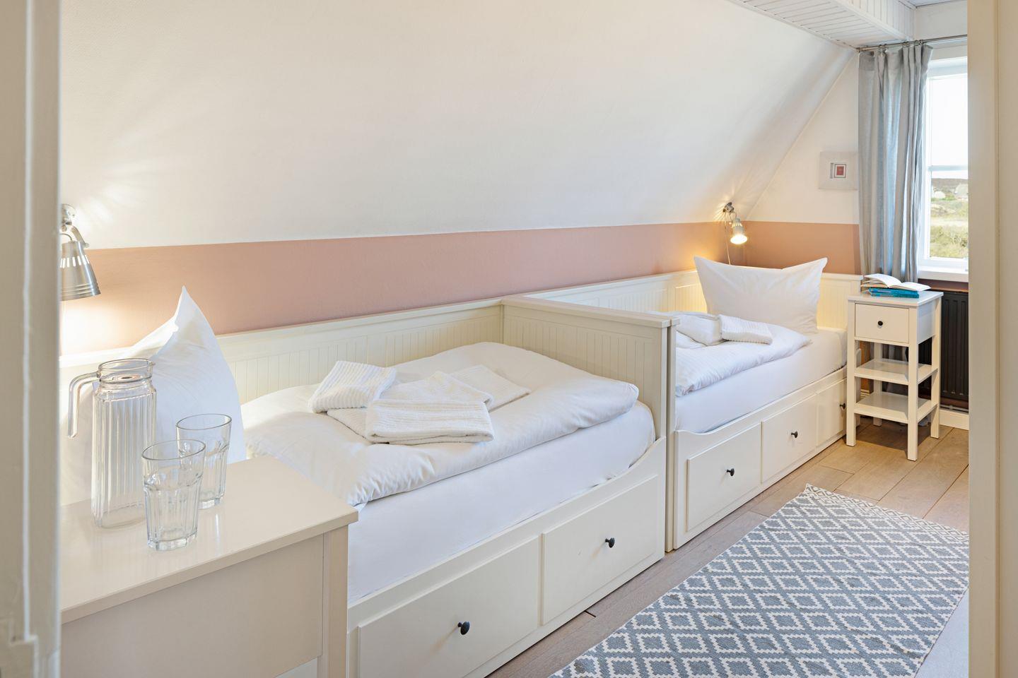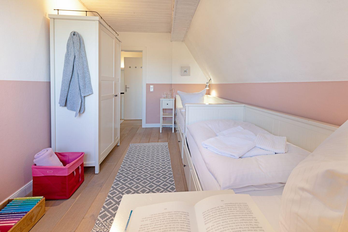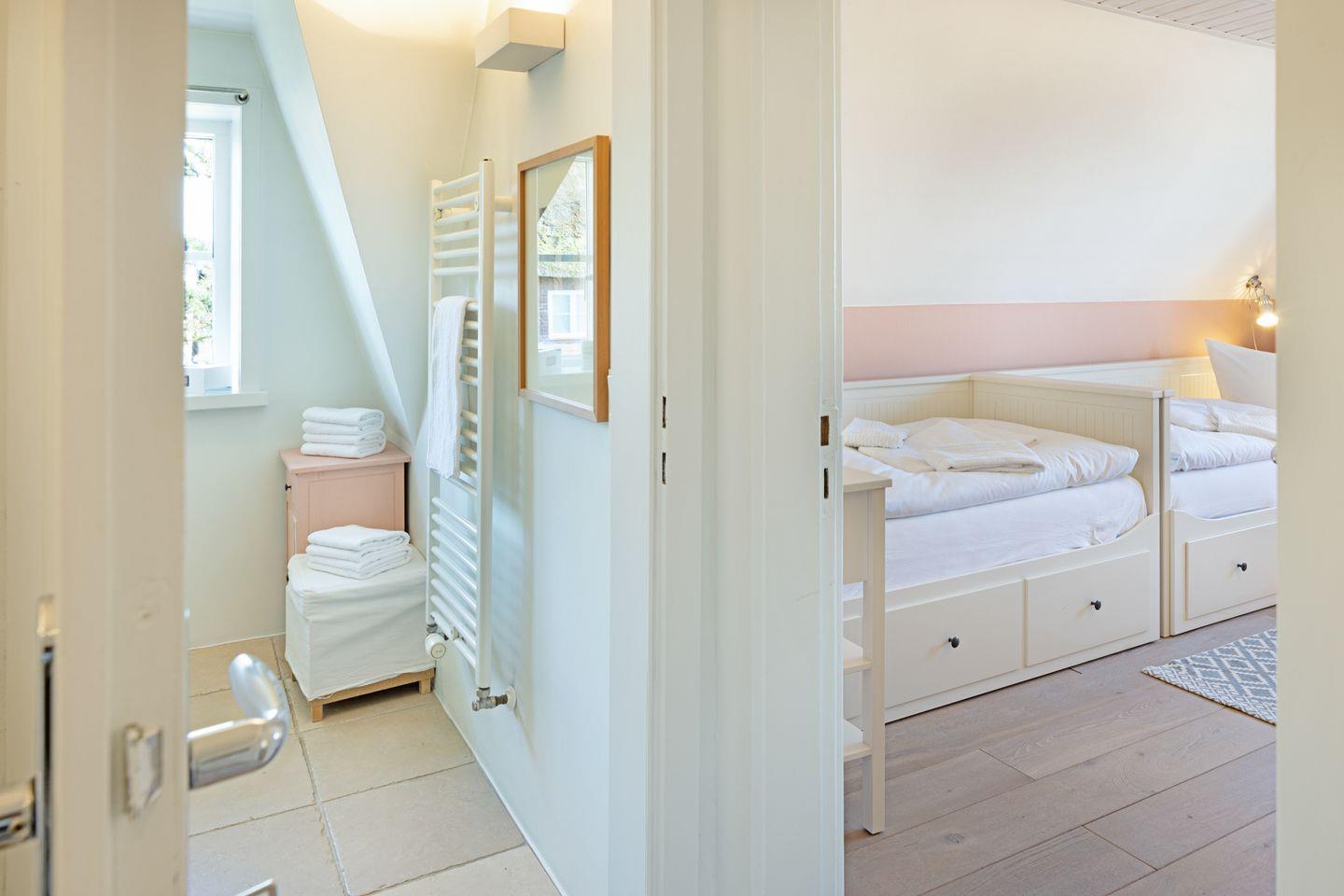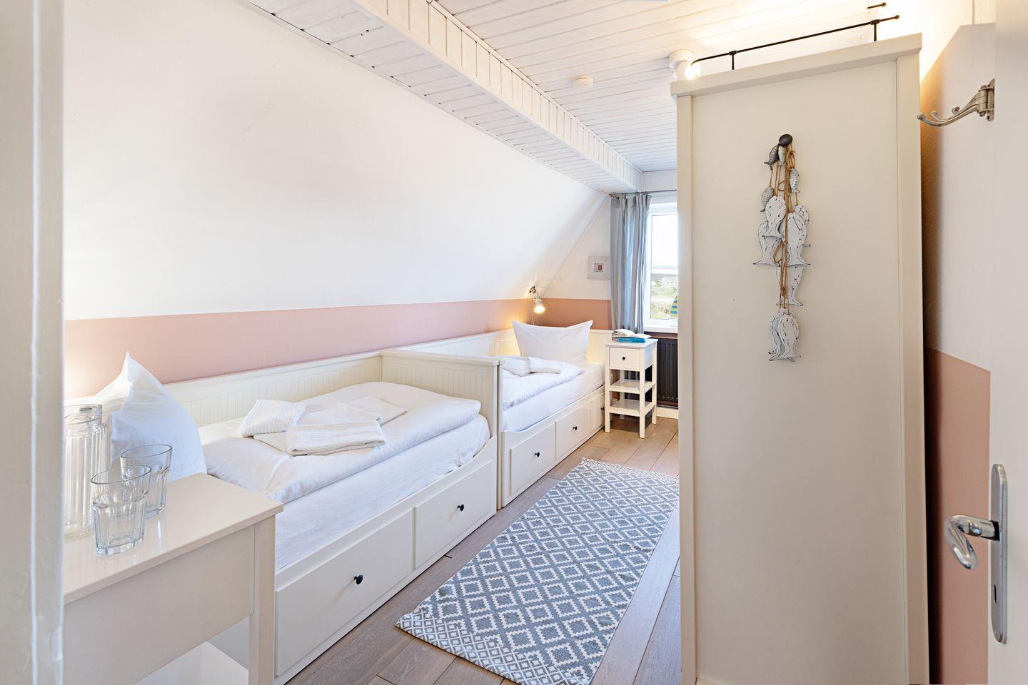 Im Obergeschoss befinden sich zwei gemütliche Schlafzimmer: ein Schlafzimmer mit Doppelbett sowie ein weiteres Zimmer mit zwei Einzelbetten ideal für Paare, kleine Familien oder Freunde.