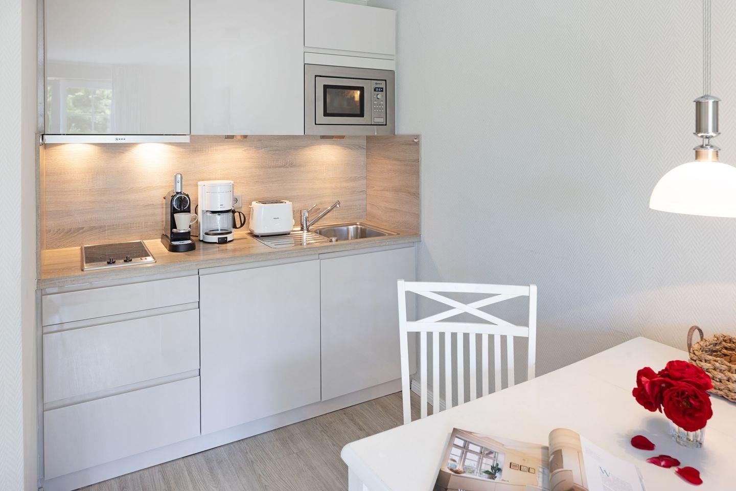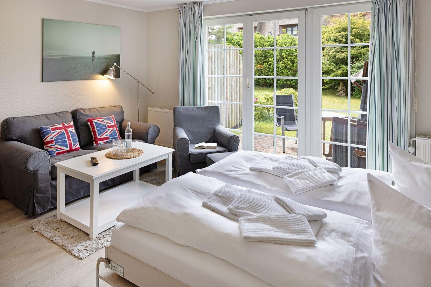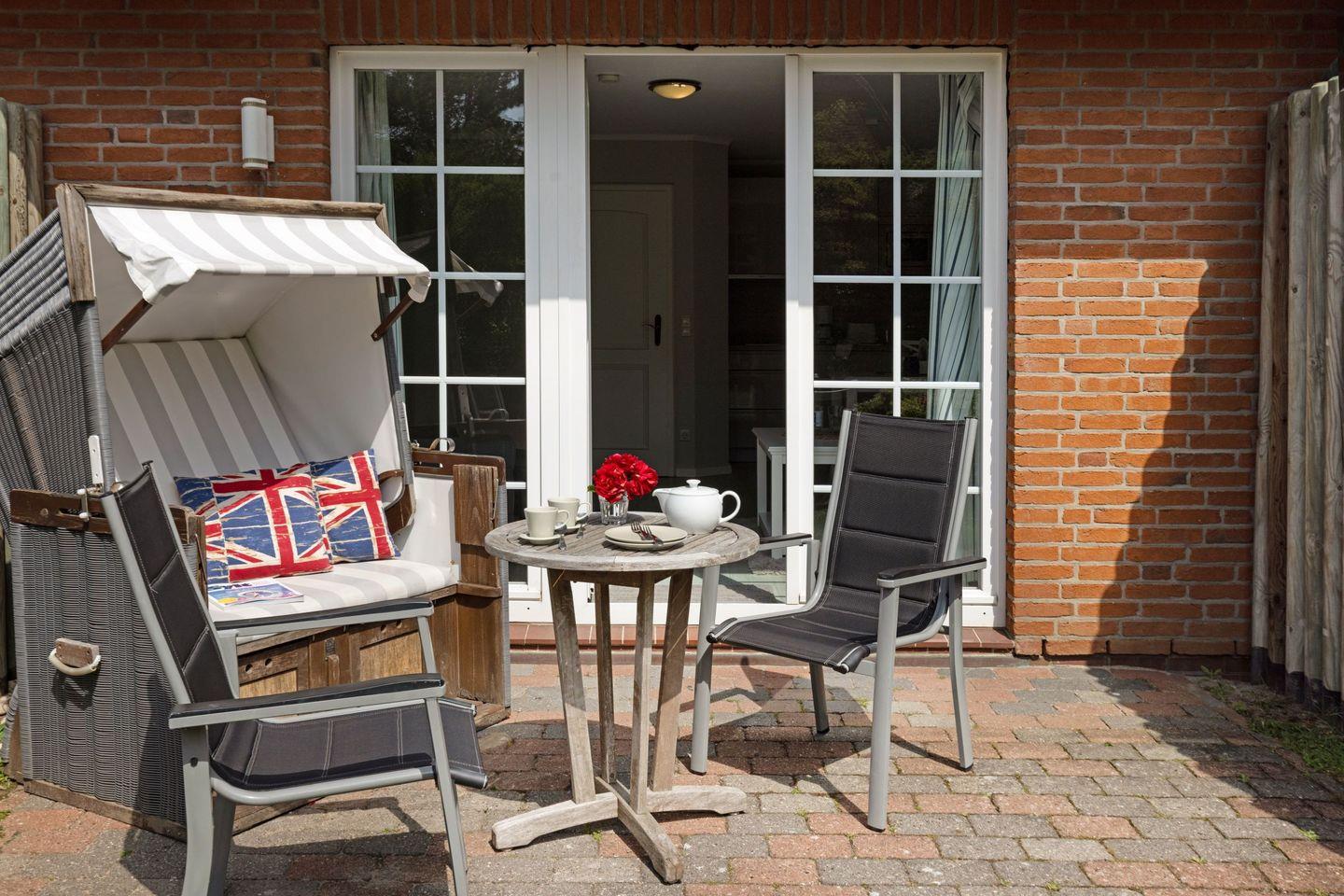 Schönes Einzimmer- Appartement für zwei Personen mit Terrasse und Strandkorb.