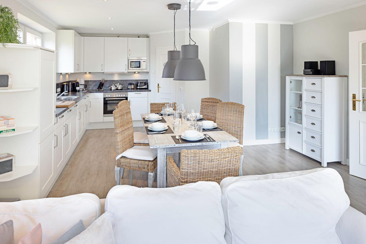 Der Wohn-/Essbereich ist zur Küche hin offen gestaltet. Zwei Schlafzimmer sind mit Doppelbetten ausgestattet und ein Schlafzimmer mit zwei Einzelbetten.
