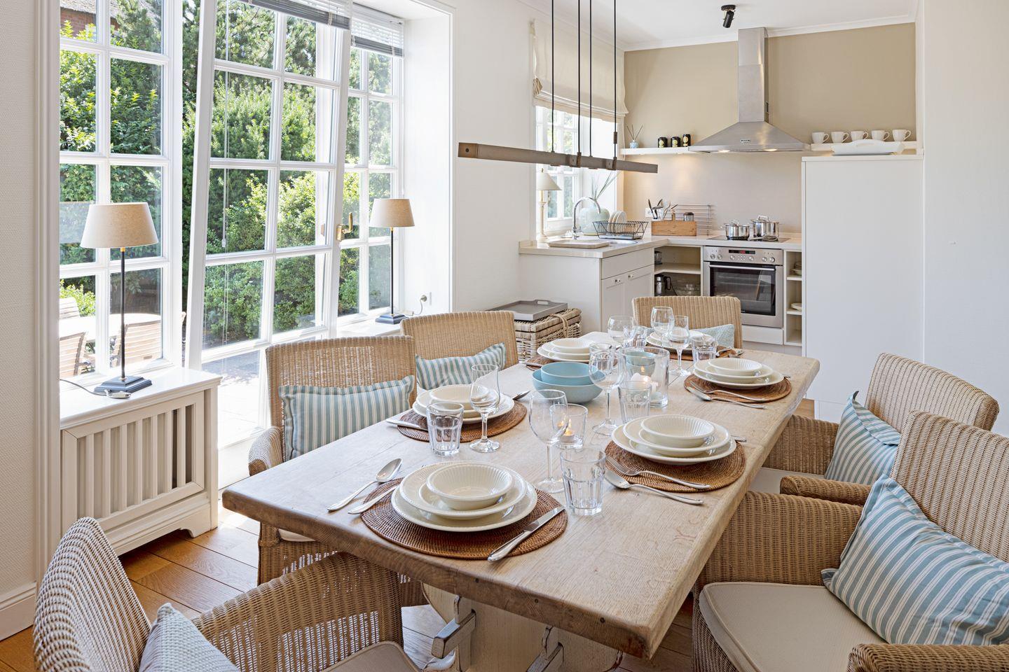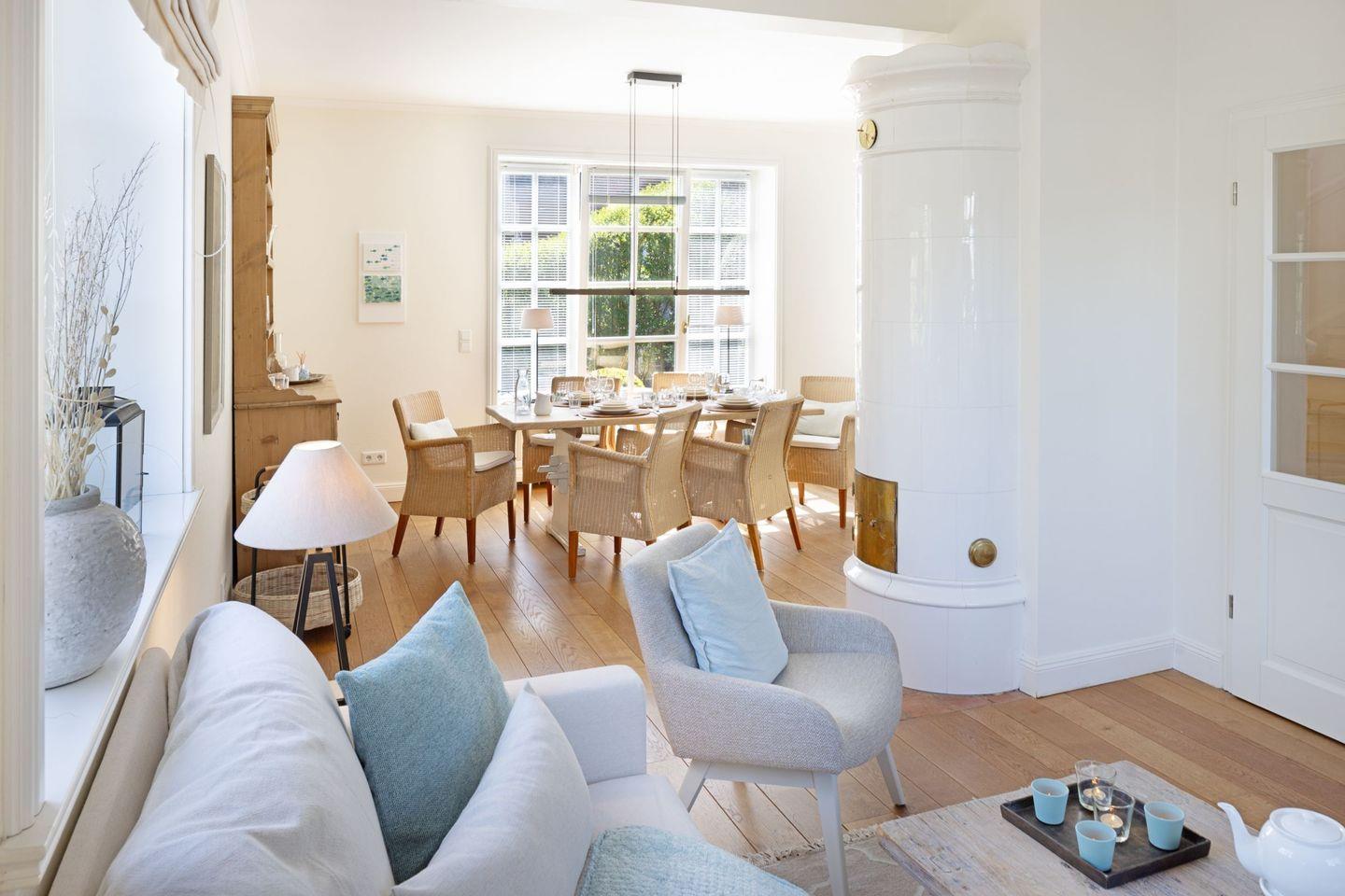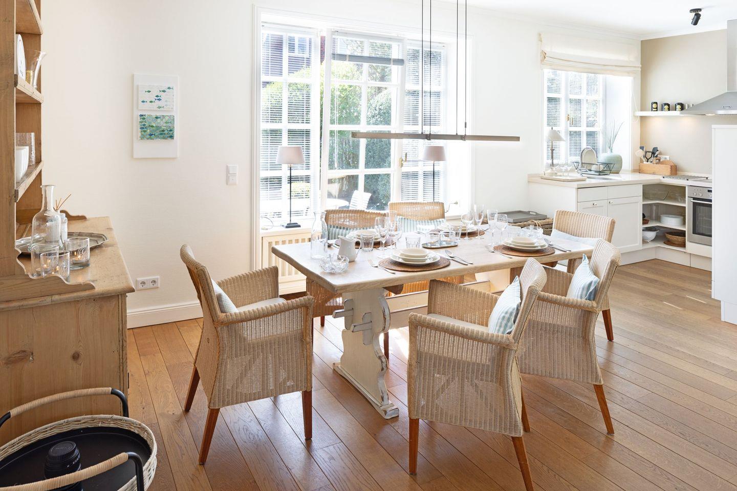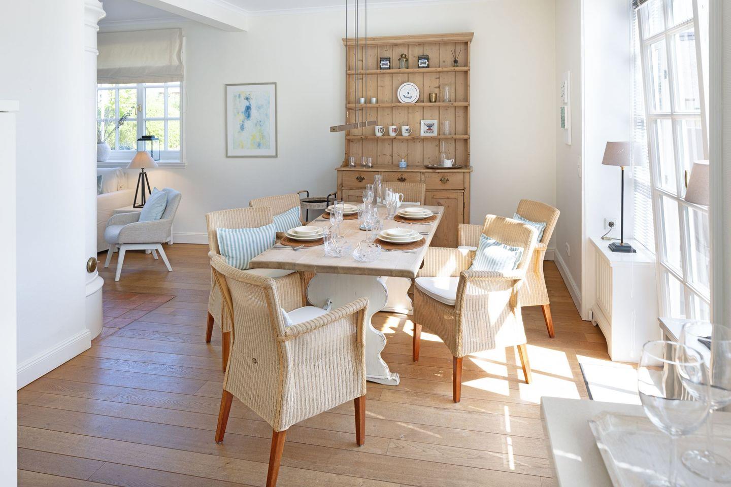 Stilvoll eingerichtet, finden Sie im Erdgeschoss des Ferienhauses vom Wohn-/Esszimmer mit Kamin bis zur offenen, gut ausgestatteten Küche, Gäste WC und einen Terrassenzugang. Alles was man zum Wohlfühlen benötigt.